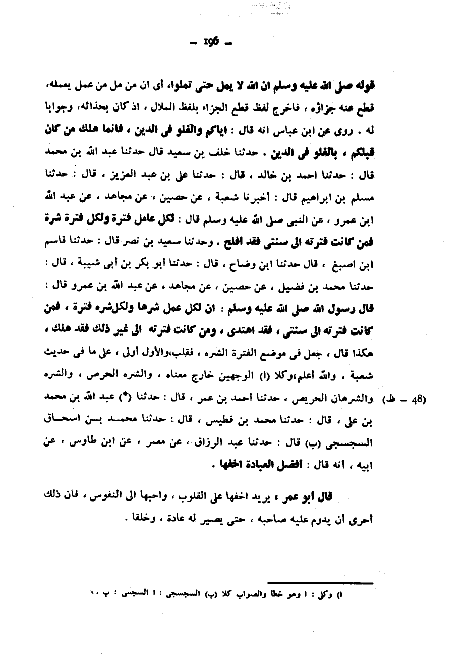 قَوْلُهُ صَلَّى اللَّهُ عَلَيْهِ وَسَلَّمَ إِنَّ اللَّهَ لَا يَمَلُّ حَتَّى تَمَلُّوا أَيْ إِنَّ مَنْ مَلَّ مِنْ عَمَلٍ يَعْمَلُهُ قُطِعَ عَنْهُ جَزَاؤُهُ فَأَخْرَجَ لَفْظَ قَطْعِ الْجَزَاءِ بِلَفْظِ الْمَلَالِ إِذْ كَانَ بِحِذَائِهِ وَجَوَابًا لَهُ رُوِيَ عَنِ ابْنِ عَبَّاسٍ أَنَّهُ قَالَ إِيَّاكُمْ وَالْغُلُوُّ فِي الدِّينِ فَإِنَّمَا هَلَكَ مَنْ كَانَ قَبْلَكُمْ بِالْغُلُوِّ فِي الدِّينِ حَدَّثَنَا خَلَفُ بْنُ سَعِيدٍ قَالَ حَدَّثَنَا عَبْدُ اللَّهِ بْنُ مُحَمَّدٍ قَالَ حَدَّثَنَا أَحْمَدُ بْنُ خَالِدٍ قَالَ حَدَّثَنَا عَلِيُّ بْنُ عَبْدِ الْعَزِيزِ قَالَ حَدَّثَنَا مُسْلِمُ بْنُ إِبْرَاهِيمَ قَالَ أَخْبَرَنَا شُعْبَةُ عَنْ حُصَيْنٍ عَنْ مُجَاهِدٍ عَنْ عبد الله ابن عَمْرٍو عَنِ النَّبِيِّ صَلَّى اللَّهُ عَلَيْهِ وَسَلَّمَ قَالَ لِكُلِّ عَامِلٍ فَتْرَةٌ وَلِكُلِّ فَتْرَةٍ شِرَّةٌ فَمَنْ كَانَتْ فَتْرَتُهُ إِلَى سُنَّتِي فَقَدْ أَفْلَحَ وَحَدَّثَنَا سَعِيدُ بْنُ نَصْرٍ قَالَ حَدَّثَنَا قَاسِمُ ابن أَصْبَغَ قَالَ حَدَّثَنَا ابْنُ وَضَّاحٍ قَالَ حَدَّثَنَا أَبُو بَكْرِ بْنُ أَبِي شَيْبَةَ قَالَ حَدَّثَنَا مُحَمَّدُ بْنُ فُضَيْلٍ عَنْ حُصَيْنٍ عَنْ مُجَاهِدٍ عَنْ عَبْدِ اللَّهِ بْنِ عَمْرٍو قَالَ قَالَ رَسُولُ اللَّهِ صَلَّى اللَّهُ عَلَيْهِ وسلم إن لكل عمل شرها وَلِكُلِّ شِرَّةٍ فَتْرَةً فَمَنْ كَانَتْ فَتْرَتُهُ إِلَى فَتْرَتُهُ إِلَى غَيْرِ ذَلِكَ فَقَدْ هَلَكَ هَكَذَا قال جعل من مَوْضِعِ الْفَتْرَةِ الشِّرَّةُ فَقُلِبَ وَالْأَوَّلُ أَوْلَى عَلَى مَا فِي حَدِيثِ شُعْبَةَ وَاللَّهُ أَعْلَمُ وَكِلَا الْوَجْهَيْنِ خَارِجَ مَعْنَاهُ وَالشِّرَّةُ الْحِرْصُ وَالشَّرِهُ وَالشَّرِهَانُ الْحَرِيصُ حَدَّثَنَا أَحْمَدُ بْنُ عُمَرَ قَالَ حَدَّثَنَا عَبْدُ اللَّهِ بْنُ مُحَمَّدِ بْنِ عَلِيٍّ قَالَ حَدَّثَنَا مُحَمَّدُ بْنُ فُطَيْسٍ قَالَ حَدَّثَنَا مُحَمَّدُ بْنُ إِسْحَاقَ السَّجْسَجِيُّ قَالَ حَدَّثَنَا عَبْدُ الرَّزَّاقِ عَنْ مَعْمَرٍ عَنِ ابْنِ طَاوُسٍ عَنْ أَبِيهِ أَنَّهُ قَالَ أَفْضَلُ الْعِبَادَةِ أَخَفُّهَا قَالَ أَبُو عُمَرَ يُرِيدُ أَخَفَّهَا عَلَى الْقُلُوبِ وَأَحَبَّهَا إِلَى النُّفُوسِ فَإِنَّ ذَلِكَ أَحْرَى أَنْ يَدُومَ عَلَيْهِ صَاحِبُهُ حَتَّى يَصِيرَ لَهُ عَادَةً وَخُلُقًا