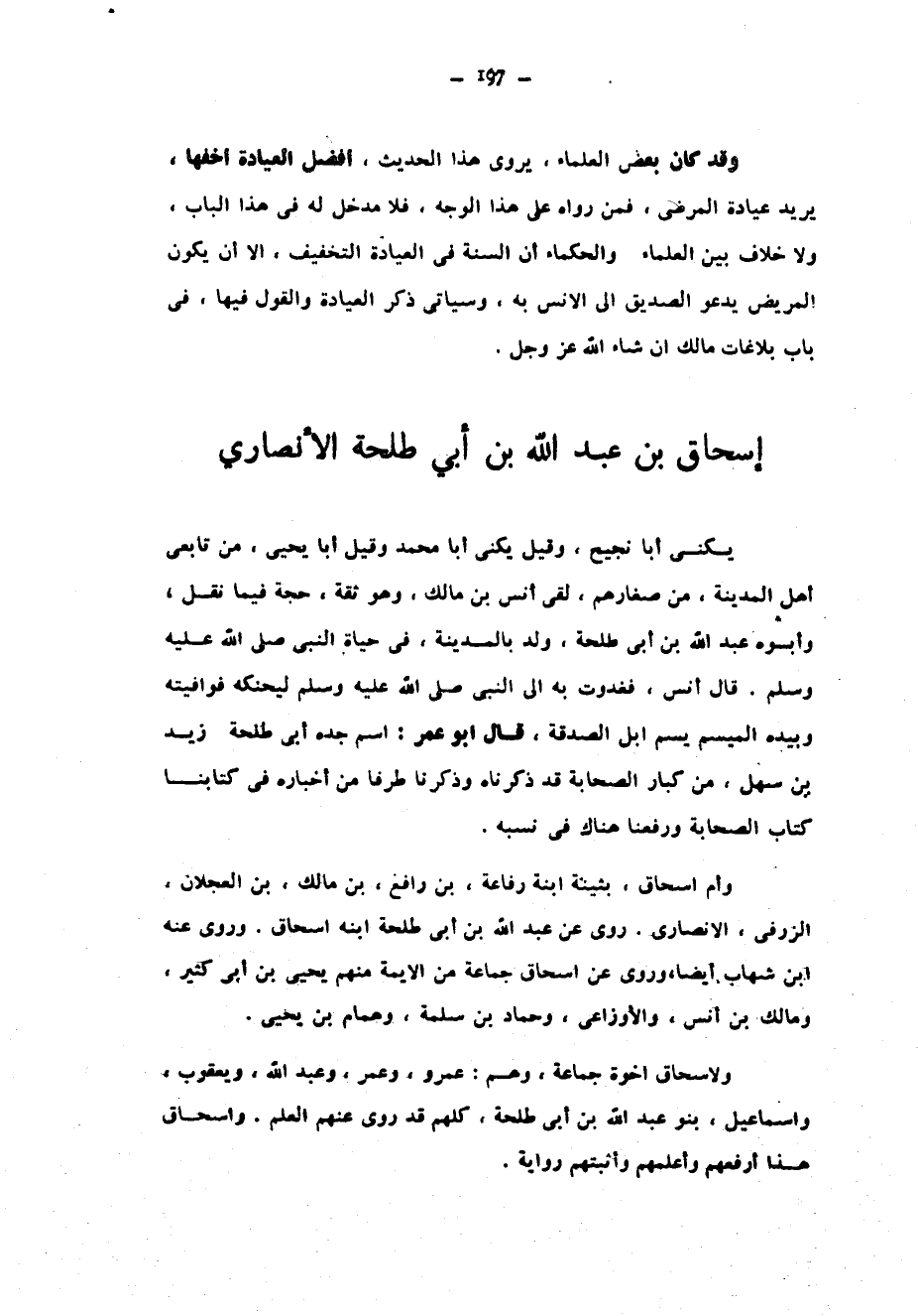 وَقَدْ كَانَ بَعْضُ الْعُلَمَاءِ يَرْوِي هَذَا الْحَدِيثَ أَفْضَلُ الْعِيَادَةِ أَخَفُّهَا يُرِيدُ عِيَادَةَ الْمَرْضَى فَمَنْ رَوَاهُ عَلَى هَذَا الْوَجْهِ فَلَا مَدْخَلَ لَهُ فِي هَذَا الْبَابِ وَلَا خِلَافَ بَيْنِ الْعُلَمَاءِ وَالْحُكَمَاءِ أَنَّ السُّنَّةَ فِي الْعِيَادَةِ التَّخْفِيفُ إِلَّا أَنْ يَكُونَ الْمَرِيضُ يَدْعُو الصَّدِيقَ إِلَى الْأُنْسِ بِهِ وَسَيَأْتِي ذِكْرُ الْعِيَادَةِ وَالْقَوْلُ فِيهَا فِي بَابِ بَلَاغَاتِ مَالِكٍ إِنْ شَاءَ اللَّهُ عَزَّ وَجَلَّ إِسْحَاقُ بْنُ عَبْدِ اللَّهِ بْنِ أَبِي طَلْحَةَ الْأَنْصَارِيُّ يُكَنَّى أَبَا نَجِيحٍ وَقِيلَ يُكَنَّى أَبَا مُحَمَّدٍ وَقِيلَ أَبَا يَحْيَى مِنْ تَابِعِي أَهْلِ الْمَدِينَةِ مِنْ صِغَارِهِمْ لَقِيَ أَنَسَ بْنَ مَالِكٍ وَهُوَ ثِقَةٌ حُجَّةٌ فِيمَا نَقَلَ وَأَبَوْهُ عَبْدُ اللَّهِ بْنُ أَبِي طَلْحَةَ وُلِدَ بِالْمَدِينَةِ فِي حَيَاةِ النَّبِيِّ صَلَّى اللَّهُ عَلَيْهِ وَسَلَّمَ قَالَ أَنَسٌ فَغَدَوْتُ بِهِ إِلَى النَّبِيِّ صَلَّى اللَّهُ عَلَيْهِ وَسَلَّمَ لِيُحَنِّكَهُ فَوَافَيْتُهُ وَبِيَدِهِ الْمِيسَمُ يَسِمُ إِبِلَ الصَّدَقَةِ قَالَ أَبُو عُمَرَ اسْمُ جَدِّهِ أَبِي طَلْحَةَ زَيْدُ بْنُ سَهْلٍ مِنْ كِبَارِ الصَّحَابَةِ قَدْ ذَكَرْنَاهُ وَذَكَرْنَا طَرَفًا مِنْ أَخْبَارِهِ فِي كِتَابِنَا كِتَابِ الصَّحَابَةِ وَرَفَعْنَا هُنَاكَ فِي نَسَبِهِ وَأُمُّ إِسْحَاقَ بُثَيْنَةُ ابْنَةُ رِفَاعَةَ بْنِ رَافِعِ بْنِ مَالِكِ بْنِ الْعَجْلَانِ الزَّرَفِيُّ الانصاري وروى عَنْ عَبْدِ اللَّهِ بْنِ أَبِي طَلْحَةَ ابْنُهُ اسحاق وروى عنه ابن شهاب ايضا ورو عن اسحاق جماعة من الايمة مِنْهُمْ يَحْيَى بْنُ أَبِي كَثِيرٍ وَمَالِكُ بْنُ أَنَسٍ وَالْأَوْزَاعِيُّ وَحَمَّادُ بْنُ سَلَمَةَ وَهَمَّامُ بْنُ يَحْيَى وَلِإِسْحَاقَ إِخْوَةٌ جَمَاعَةٌ وَهُمْ عَمْرٌو وَعُمَرُ وَعَبْدُ اللَّهِ وَيَعْقُوبُ وَإِسْمَاعِيلُ بَنُو عَبْدِ اللَّهِ بْنِ أَبِي طَلْحَةَ كُلُّهمْ قَدْ رَوَى عَنْهُمُ الْعِلْمَ وَإِسْحَاقُ هَذَا أَرْفَعُهُمْ وَأَعْلَمُهُمْ وَأَثْبَتُهُمْ رِوَايَةً