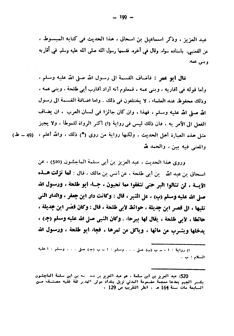 عَبْدِ الْعَزِيزِ وَذَكَرَ إِسْمَاعِيلُ بْنُ إِسْحَاقَ هَذَا الْحَدِيثَ فِي كِتَابِهِ الْمَبْسُوطِ عَنِ الْقَعْنَبِيِّ بِإِسْنَادِهِ سَوَاءً وَقَالَ فِي آخِرِهِ فَقَسَّمَهَا رَسُولُ اللَّهِ صَلَّى اللَّهُ عَلَيْهِ وَسَلَّمَ فِي أَقَارِبِهِ وَبَنِي عَمِّهِ قَالَ أَبُو عُمَرَ فَأَضَافَ الْقِسْمَةَ إِلَى رَسُولِ اللَّهِ صَلَّى اللَّهُ عَلَيْهِ وَسَلَّمَ وَأَمَّا قَوْلُهُ فِي أَقَارِبِهِ وَبَنِي عَمِّهِ فَمَعْلُومٌ أَنَّهُ أَرَادَ أَقَارِبَ أَبِي طَلْحَةَ وَبَنِي عَمِّهِ وَذَلِكَ مَحْفُوظٌ عِنْدَ الْعُلَمَاءِ لَا يَخْتَلِفُونَ فِي ذَلِكَ وَأَمَّا إِضَافَةُ الْقِسْمَةِ إِلَى رَسُولِ اللَّهِ صَلَّى اللَّهُ عَلَيْهِ وَسَلَّمَ فَهَذَا وَإِنْ كَانَ جَائِزًا فِي لِسَانِ الْعَرَبِ أَنْ يُضَافَ الْفِعْلُ إِلَى الْآمِرِ بِهِ فَإِنَّ ذَلِكَ لَيْسَ فِي رِوَايَةِ أَكْثَرِ الرُّوَاةِ لِلْمُوَطَّأِ وَلَا يُجِيزُ مِثْلَ هَذِهِ الْعِبَارَةِ أَهْلُ الْحَدِيثِ وَلَكِنَّهَا رِوَايَةُ مَنْ رَوَى ذَلِكَ وَاللَّهُ أَعْلَمُ وَالْمَعْنَى فِيهِ بَيِّنٌ وَالْحَمْدُ لِلَّهِ وَرَوَى هَذَا الْحَدِيثَ عَبْدُ الْعَزِيزِ بْنُ أَبِي سَلَمَةَ الْمَاجِشُونُ عَنْ إِسْحَاقَ بْنِ عَبْدِ اللَّهِ بْنِ أَبِي طَلْحَةَ عَنْ أَنَسِ بْنِ مَالِكٍ قَالَ لَمَّا نَزَلَتْ هَذِهِ الْآيَةُ لَنْ تَنَالُوا الْبِرَّ حَتَّى تُنْفِقُوا مِمَّا تُحِبُّونَ جَاءَ أَبُو طَلْحَةَ وَرَسُولُ اللَّهِ صَلَّى اللَّهُ عَلَيْهِ وسلم (0ب) عَلَى الْمِنْبَرِ قَالَ وَكَانَتْ دَارُ ابْنِ جَعْفَرٍ وَالدَّارُ الَّتِي تَلِيهَا إِلَى قَصْرِ ابْنِ جَدِيلَةَ حَوَائِطُ لِأَبِي طَلْحَةَ قَالَ وَكَانَ قَصْرُ ابْنِ جَدِيلَةَ حَائِطًا لِأَبِي طَلْحَةَ يُقَالُ لَهَا بَيْرُحَاءُ وَكَانَ النَّبِيُّ صَلَّى اللَّهُ عَلَيْهِ وَسَلَّمَ يَدْخُلُهَا وَيَشْرَبُ مِنْ مَائِهَا وَيَأْكُلُ مِنْ ثَمَرِهَا فَجَاءَ أَبُو طَلْحَةَ وَرَسُولُ اللَّهِ