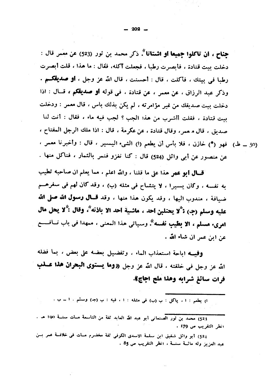 جُنَاحٌ أَنْ تَأْكُلُوا جَمِيعًا أَوْ أَشْتَاتًا ذَكَرَ مُحَمَّدُ بْنُ ثَوْرٍ عَنْ مَعْمَرٍ قَالَ دَخَلْتُ بَيْتَ قَتَادَةَ فَأَبْصَرْتُ رُطَبًا فَجَعَلْتُ آكُلُهُ فَقَالَ مَا هَذَا قُلْتُ أَبْصَرْتُ رُطَبًا فِي بَيْتِكَ فَأَكَلْتُ قَالَ أَحْسَنْتَ قَالَ اللَّهُ عَزَّ وَجَلَّ أَوْ صَدِيقِكُمْ وَذَكَرَ عَبْدُ الرَّزَّاقِ عَنْ مَعْمَرٍ عَنْ قَتَادَةَ فِي قَوْلِهِ أَوْ صَدِيقِكُمْ قَالَ إِذَا دَخَلْتَ بَيْتَ صَدِيقِكَ مِنْ غَيْرِ مُؤَامَرَتِهِ لَمْ يَكُنْ بِذَلِكَ بَأْسٌ قَالَ مَعْمَرٌ وَدَخَلْتُ بَيْتَ قَتَادَةَ فَقُلْتُ أَأَشْرَبُ مِنْ هَذَا الْجُبِّ لِجُبٍّ فِيهِ مَاءٌ فَقَالَ أَنْتَ لَنَا صَدِيقٌ قَالَ مَعْمَرٌ وَقَالَ قَتَادَةُ عَنْ عِكْرِمَةَ قَالَ إِذَا مَلَكَ الرَّجُلُ الْمِفْتَاحَ فَهُوَ (*) خَازِنٌ فَلَا بَأْسَ أَنْ يَطْعَمَ الشَّيْءَ الْيَسِيرَ قَالَ وَأَخْبَرَنَا مَعْمَرٌ عَنْ مَنْصُورٍ عَنْ أَبِي وَائِلٍ قَالَ كُنَّا نَغْزُو فَنَمُرُّ بِالثِّمَارِ فَنَأْكُلُ مِنْهَا قَالَ أَبُو عُمَرَ هَذَا عَلَى مَا قُلْنَا وَاللَّهُ أَعْلَمُ مِمَّا يَعْلَمُ أَنَّ صَاحِبَهُ تَطِيبُ بِهِ نَفْسُهُ وَكَانَ يَسِيرًا لَا يَتَشَاحَّ فِي مِثْلِهِ وَقَدْ كَانَ لَهُمْ فِي سَفَرِهِمْ ضِيَافَةٌ مَنْدُوبٌ إِلَيْهَا وَقَدْ يَكُونُ هَذَا مِنْهَا وَقَدْ قَالَ رَسُولُ اللَّهِ صَلَّى اللَّهُ عَلَيْهِ وَسَلَّمَ لَا يَحْتَلِبَنَّ أَحَدٌ مَاشِيَةَ أَحَدٍ إِلَّا بِإِذْنِهِ وَقَالَ لَا يَحِلُّ مَالُ امْرِئٍ مُسْلِمٍ إِلَّا بِطِيبِ نَفْسِهِ وَسَيَأْتِي هَذَا الْمَعْنَى مُمَهَّدًا فِي بَابِ نَافِعٍ عَنِ ابْنِ عُمَرَ إِنْ شَاءَ اللَّهُ وَفِيهِ إِبَاحَةُ اسْتِعْذَابِ الْمَاءِ وَتَفْضِيلُ بَعْضِهِ عَلَى بَعْضٍ بِمَا فَضَّلَهُ اللَّهُ عَزَّ وَجَلَّ فِي خِلْقَتِهِ قَالَ اللَّهُ عَزَّ وَجَلَّ وَمَا يَسْتَوِي الْبَحْرَانِ هَذَا عَذْبٌ فُرَاتٌ سَائِغٌ شَرَابُهُ وَهَذَا ملح أجاج