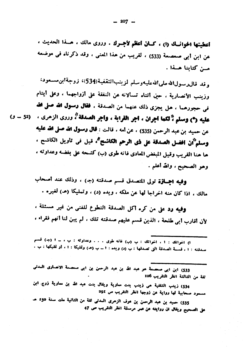 أَعْطَيْتِهَا إِخْوَانَكِ كَانَ أَعْظَمَ لِأَجْرِكِ وَرَوَى مَالِكٌ هَذَا الْحَدِيثَ عَنِ ابْنِ أَبِي صَعْصَعَةَ لِقَرِيبٍ مِنْ هَذَا الْمَعْنَى وَقَدْ ذَكَرْنَاهُ فِي مَوْضِعِهِ مِنْ كِتَابِنَا هَذَا وَقَدْ قَالَ رَسُولُ اللَّهِ صَلَّى اللَّهُ عَلَيْهِ وَسَلَّمَ لِزَيْنَبَ الثَّقَفِيَّةِ زَوْجَةِ ابْنِ مَسْعُودٍ وَزَيْنَبَ الْأَنْصَارِيَّةِ حِينَ أَتَتَاهُ تَسْأَلَانِهِ عَنِ النَّفَقَةِ عَلَى أَزْوَاجِهِمَا وَعَلَى أَيْتَامٍ فِي حُجُورِهِمَا هَلْ يُجْزِي ذَلِكَ عَنْهُمَا مِنَ الصَّدَقَةِ فَقَالَ رَسُولُ اللَّهِ صَلَّى اللَّهُ عَلَيْهِ (*) وَسَلَّمَ لَكُمَا أَجْرَانِ أَجْرُ الْقَرَابَةِ وَأَجْرُ الصَّدَقَةِ وَرَوَى الزُّهْرِيُّ عَنْ حُمَيْدِ بْنِ عَبْدِ الرَّحْمَنِ عَنْ أُمِّهِ قَالَتْ قَالَ رَسُولُ اللَّهِ صَلَّى اللَّهُ عَلَيْهِ وَسَلَّمَ إِنَّ أَفْضَلَ الصَّدَقَةِ عَلَى ذِي الرحم الكاشح قيل في تأويل الكاشح ها هنا الْقَرِيبُ وَقِيلَ الْمُبْغِضُ الْمُعَادِي فَإِنَّهُ طَوَى كَشْحَهُ عَلَى بُغْضِهِ وَعَدَاوَتِهِ وَهُوَ الصَّحِيحُ وَاللَّهُ أَعْلَمُ وَفِيهِ إِجَازَةُ تَوَلِّي الْمُتَصَدِّقَ قَسْمَ صَدَقَتِهِ وَذَلِكَ عِنْدَ أَصْحَابِ مَالِكٍ إِذَا كَانَ مِنْهُ إِخْرَاجًا لها عن ملكه ويده وتمليكا (هـ) لِغَيْرِهِ وَفِيهِ رَدٌّ عَلَى مَنْ كَرِهَ أَكْلَ الصدقة التطوع للغني من غير مسئلة لِأَنَّ أَقَارِبَ أَبِي طَلْحَةَ الَّذِينَ قَسَّمَ عَلَيْهِمْ صَدَقَتَهُ تِلْكَ لَمْ يَبِنْ لَنَا أَنَّهُمْ فُقَرَاءُ