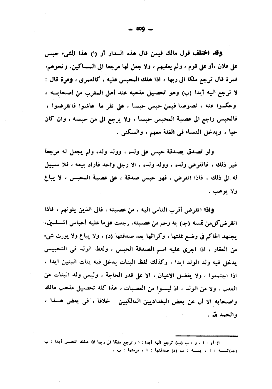 وقد اختلف قول مالك فيمن قال هذا الدَّارُ أَوْ هَذَا الشَّيْءُ حَبْسٌ عَلَى فُلَانٍ أَوْ عَلَى قَوْمٍ وَلَمْ يَعْقُبْهُمْ وَلَا جَعَلَ لَهَا مَرْجِعًا إِلَى الْمَسَاكِينِ وَنَحْوِهِمْ فَمَرَّةً قَالَ تَرْجِعُ مِلْكًا إِلَى رَبِّهَا إِذَا هَلَكَ الْمُحْبِسُ عَلَيْهِ كَالْعُمْرَى وَمَرَّةً قَالَ لَا تَرْجِعُ إِلَيْهِ أَبَدًا وَهُوَ تَحْصِيلُ مَذْهَبِهِ عِنْدَ أَهْلِ الْمَغْرِبِ مِنْ أَصْحَابِهِ وَحَكَوْا عَنْهُ نُصُوصًا فِيمَنْ حَبَسَ حَبْسًا عَلَى نَفَرٍ مَا عَاشُوا فَانْقَرَضُوا فَالْحَبْسُ رَاجِعٌ إِلَى عُصْبَةِ الْمُحْبِسِ حَبْسًا وَلَا يَرْجِعُ إِلَى مَنْ حَبَسَهُ وَإِنْ كَانَ حَيًّا وَيَدْخُلُ النِّسَاءُ فِي الْغَلَّةِ مَعَهُمْ وَالسُّكْنَى وَلَوْ تَصَدَّقَ بِصَدَقَةٍ حَبْسٍ عَلَى وَلَدِهِ وَوَلَدِ وَلَدِهِ وَلَمْ يَجْعَلْ لَهُ مَرْجِعًا غَيْرَ ذَلِكَ فَانْقَرَضَ وَلَدُهُ وَوَلَدُ وَلَدِهِ إِلَّا رَجُلٌ وَاحِدٌ فَأَرَادَ بَيْعَهُ فَلَا سَبِيلَ لَهُ إِلَى ذَلِكَ فَإِذَا انْقَرَضَ فَهُوَ حَبْسُ صَدَقَةٍ عَلَى عَصَبَةِ الْمُحْبِسِ لَا يُبَاعُ وَلَا يُوهَبُ وَإِذَا انْقَرَضَ أَقْرَبُ النَّاسِ إِلَيْهِ مِنْ عَصَبَتِهِ فَإِلَى الَّذِينَ يَلُونَهُمْ فَإِذَا انْقَرَضَ كُلُّ مَنْ تَمَسُّهُ بِهِ رَحِمٌ مِنْ عَصَبَتِهِ رَجَعَتْ عَلَى مَا عَلَيْهِ أَحْبَاسُ الْمُسْلِمِينَ يَجْتَهِدُ الْحَاكِمُ فِي وَضْعِ غَلَّتِهَا وَكِرَائِهَا بَعْدَ صَدَقَتِهَا وَلَا يُبَاعُ وَلَا يُورَثُ شَيْءٌ مِنَ الْعَقَارِ إِذَا أُجْرِيَ عَلَيْهِ اسْمُ الصَّدَقَةِ الْحَبْسِ وَلَفْظُ الْوَلَدِ فِي التَّحْبِيسِ يَدْخُلُ فِيهِ وَلَدُ الْوَلَدِ أَبَدًا وَكَذَلِكَ لَفْظُ الْبَنَاتِ يَدْخُلُ فِيهِ بَنَاتُ الْبَنِينَ أَبَدًا إِذَا اجْتَمَعُوا وَلَا يُفَضَّلُ الْأَعْيَانُ إِلَّا عَلَى قَدْرِ الْحَاجَةِ وَلَيْسَ وَلَدُ الْبَنَاتِ مِنَ الْعَقِبِ وَلَا مِنَ الْوَلَدِ إِذْ لَيْسُوا مِنَ الْعَصَبَاتِ هَذَا كُلُّهُ تَحْصِيلُ مَذْهَبِ مَالِكٍ وَأَصْحَابِهِ إِلَّا أَنَّ عَنْ بَعْضِ الْبَغْدَادِيِّينَ الْمَالِكِيِّينَ خِلَافًا فِي بَعْضِ هَذَا وَالْحَمْدُ لِلَّهِ