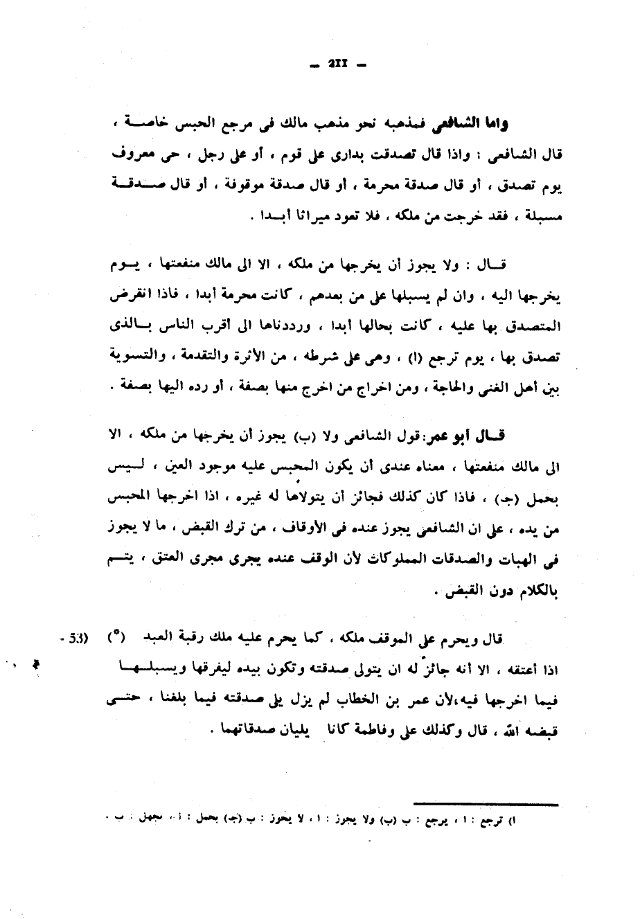 وَأَمَّا الشَّافِعِيُّ فَمَذْهَبُهُ نَحْوُ مَذْهَبِ مَالِكٍ فِي مَرْجِعِ الْحَبْسِ خَاصَّةً قَالَ الشَّافِعِيُّ وَإِذَا قَالَ تَصَدَّقْتُ بِدَارِي عَلَى قَوْمٍ أَوْ عَلَى رَجُلٍ حَيٍّ مَعْرُوفٍ يَوْمَ تَصَدَّقَ أَوْ قَالَ صَدَقَةٌ مُحَرَّمَةٌ أَوْ قَالَ صَدَقَةٌ مَوْقُوفَةٌ أَوْ قَالَ صَدَقَةٌ مُسْبَلَةٌ فَقَدْ خَرَجَتْ مِنْ مِلْكِهِ فَلَا تَعُودُ مِيرَاثًا أَبَدًا قَالَ وَلَا يَجُوزُ أَنْ يُخْرِجَهَا مِنْ مِلْكِهِ إِلَّا إِلَى مَالِكِ مَنْفَعَتِهَا يَوْمَ يُخْرِجُهَا إِلَيْهِ وَإِنْ لَمْ يُسْبِلْهَا عَلَى مَنْ بَعْدَهُمْ كَانَتْ مُحَرَّمَةً أَبَدًا فَإِذَا انْقَرَضَ الْمُتَصَدِّقُ بِهَا عَلَيْهِ كَانَتْ بِحَالِهَا أَبَدًا وَرَدَدْنَاهَا إلى أقرب الناس بالذي تصدق بها يَوْمَ تَرْجِعُ وَهِيَ عَلَى شَرْطِهِ مِنَ الْأَثَرَةِ وَالتَّقْدِمَةِ وَالتَّسْوِيَةِ بَيْنَ أَهْلِ الْغِنَى وَالْحَاجَةِ وَمِنْ إِخْرَاجِ مَنْ أَخْرَجَ مِنْهَا بِصِفَةٍ أَوْ رَدِّهِ إِلَيْهَا بِصِفَةٍ قَالَ أَبُو عُمَرَ قَوْلُ الشَّافِعِيِّ وَلَا يَجُوزُ أَنْ يُخْرِجَهَا مِنْ مِلْكِهِ إِلَّا إِلَى مَالِكِ مَنْفَعَتِهَا مَعْنَاهُ عِنْدِي أَنْ يَكُونَ الْمَحْبِسُ عَلَيْهِ مَوْجُودَ الْعَيْنِ لَيْسَ بِحَمْلٍ فَإِذَا كَانَ كَذَلِكَ فَجَائِزٌ أَنْ يَتَوَلَّاهَا لَهُ غَيْرُهُ إِذَا أَخْرَجَهَا الْمُحْبِسُ مِنْ يَدِهِ عَلَى أَنَّ الشَّافِعِيَّ يَجُوزُ عِنْدَهُ فِي الْأَوْقَافِ مِنْ تَرْكِ الْقَبْضِ مَا لَا يَجُوزُ فِي الْهِبَاتِ وَالصَّدَقَاتِ الْمَمْلُوكَاتِ لِأَنَّ الْوَقْفَ عِنْدَهُ يَجْرِي مَجْرَى الْعِتْقِ يَتِمُّ بِالْكَلَامِ دُونَ الْقَبْضِ قَالَ وَيَحْرُمُ عَلَى الْمُوقِفِ مِلْكَهُ كَمَا يَحْرُمُ عَلَيْهِ مِلْكُ رَقَبَةِ الْعَبْدِ (*) إِذَا أَعْتَقَهُ إِلَّا أَنَّهُ جَائِزٌ لَهُ أَنْ يَتَوَلَّى صَدَقَتَهُ وَتَكُونَ بِيَدِهِ لِيُفَرِّقَهَا وَيُسْبِلَهَا فِيمَا أَخْرَجَهَا فِيهِ لِأَنَّ عُمَرَ بْنَ الْخَطَّابِ لَمْ يَزَلْ يَلِي صَدَقَتَهُ فِيمَا بَلَغَنَا حَتَّى قَبَضَهُ اللَّهُ قَالَ وَكَذَلِكَ عَلِيٌّ وَفَاطِمَةُ كَانَا يليان صدقاتهما