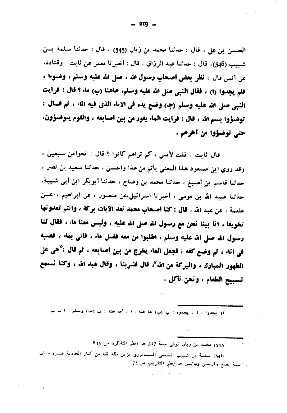 الْحَسَنُ بْنُ عَلِيٍّ قَالَ حَدَّثَنَا مُحَمَّدُ بْنُ زَبَّانَ قَالَ حَدَّثَنَا سَلَمَةُ بْنُ شَبِيبٍ قَالَ حَدَّثَنَا عَبْدُ الرَّزَّاقِ قَالَ أَخْبَرَنَا مَعْمَرٌ عَنْ ثَابِتٍ وَقَتَادَةَ عَنْ أَنَسٍ قَالَ نَظَرَ بَعْضُ أَصْحَابِ رَسُولِ اللَّهِ صَلَّى اللَّهُ عَلَيْهِ وسلم وَضَوْءًا فَلَمْ يَجِدُوا فَقَالَ النَّبِيُّ صَلَّى اللَّهُ عليه وسلم ها هنا مَاءٌ قَالَ فَرَأَيْتُ النَّبِيَّ صَلَّى اللَّهُ عَلَيْهِ وَسَلَّمَ وَضَعَ يَدَهُ فِي الْإِنَاءِ الَّذِي فِيهِ الماء ثم قال توضؤوا بِسْمِ اللَّهِ قَالَ فَرَأَيْتُ الْمَاءَ يَفُورُ مِنْ بين اصابعه والقوم يتوضؤون حتى توضؤوا مِنْ آخِرِهِمْ قَالَ ثَابِتٌ قُلْتُ لِأَنَسٍ كَمْ تَرَاهُمْ كَانُوا قَالَ نَحْوًا مِنْ سَبْعِينَ وَقَدْ رَوَى ابْنُ مَسْعُودٍ هَذَا الْمَعْنَى بِأَتَمَّ مِنْ هَذَا وَأَحْسَنَ حَدَّثَنَا سَعِيدُ بْنُ نَصْرٍ حَدَّثَنَا قَاسِمُ بْنُ أَصْبَغَ حَدَّثَنَا مُحَمَّدُ بْنُ وَضَّاحٍ حَدَّثَنَا أَبُو بَكْرِ بْنُ أَبِي شَيْبَةَ حَدَّثَنَا عُبَيْدُ اللَّهِ بْنُ مُوسَى أَخْبَرَنَا إِسْرَائِيلُ عَنْ مَنْصُورٍ عَنْ إِبْرَاهِيمَ عَنْ عَلْقَمَةَ عَنْ عَبْدِ اللَّهِ قَالَ كُنَّا أَصْحَابَ مُحَمَّدٍ نَعُدُّ الْآيَاتِ بَرَكَةً وَأَنْتُمْ تَعُدُّونَهَا تَخْوِيفًا إِنَّا بَيْنَا نَحْنُ مَعَ رَسُولِ اللَّهِ صَلَّى اللَّهُ عَلَيْهِ وَسَلَّمَ وَلَيْسَ مَعْنَا مَاءٌ فَقَالَ لَنَا رَسُولُ اللَّهِ صَلَّى اللَّهُ عَلَيْهِ وَسَلَّمَ اطْلُبُوا مَنْ مَعَهُ فَضْلُ مَاءٍ فَأُتِيَ بِمَاءٍ فَصَبَّهُ فِي إِنَاءٍ ثُمَّ وَضَعَ كَفَّهُ فَجَعَلَ الْمَاءَ يَخْرُجُ مِنْ بَيْنِ أَصَابِعِهِ ثُمَّ قَالَ حَيَّ عَلَى الطَّهُورِ الْمُبَارَكِ وَالْبَرَكَةِ مِنَ اللَّهِ قَالَ فَشَرِبْنَا وَقَالَ عَبْدُ اللَّهِ وَكُنَّا نَسْمَعُ تَسْبِيحَ الطَّعَامِ وَنَحْنُ نأكل