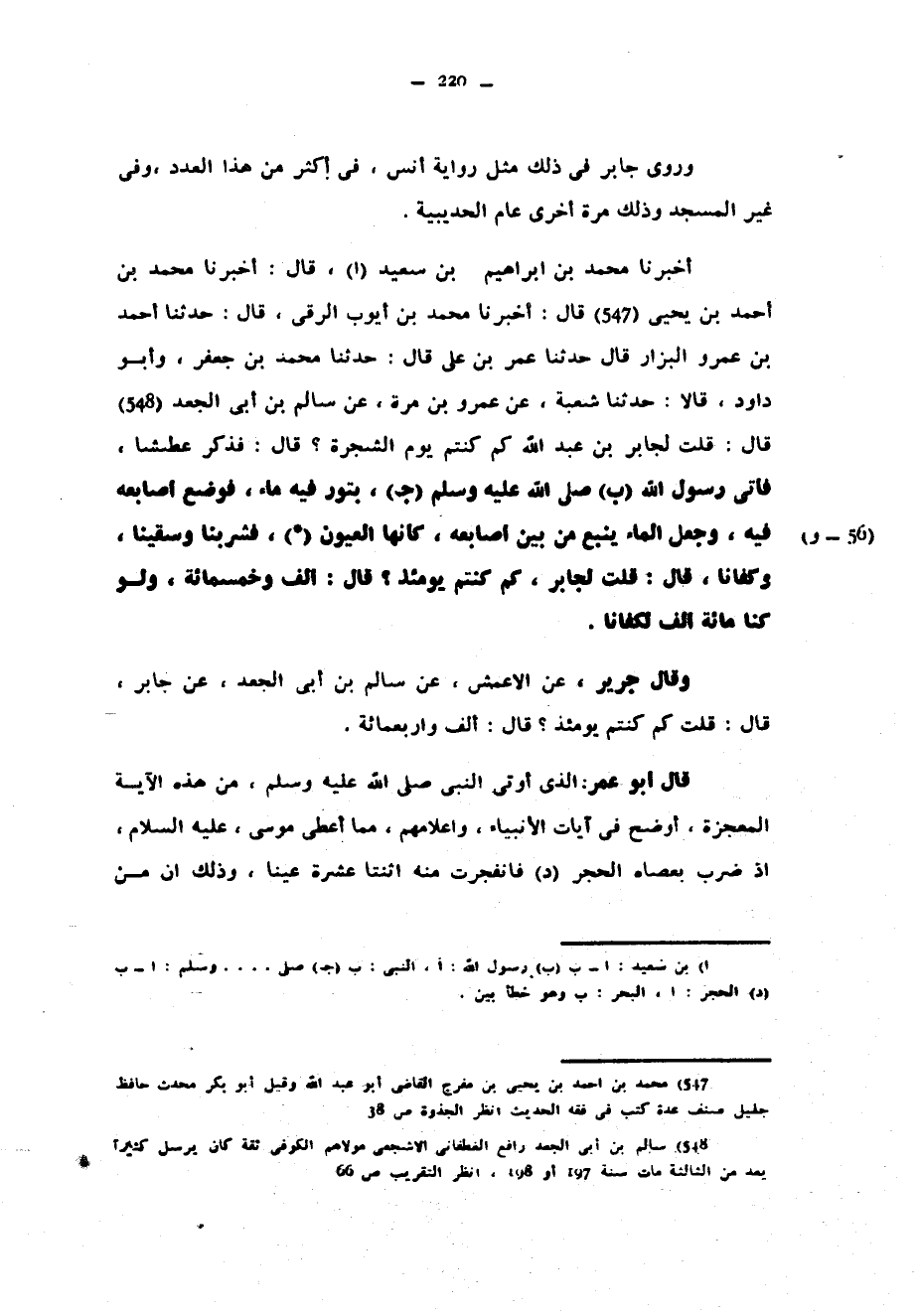 وَرَوَى جَابِرٌ فِي ذَلِكَ مِثْلَ رِوَايَةِ أَنَسٍ فِي أَكْثَرِ مِنْ هَذَا الْعَدَدِ وَفِي غَيْرِ الْمَسْجِدِ وَذَلِكَ مَرَّةً أُخْرَى عَامَ الْحُدَيْبِيَةِ أَخْبَرَنَا مُحَمَّدُ بْنُ إِبْرَاهِيمَ بْنِ سَعِيدٍ قَالَ أَخْبَرَنَا مُحَمَّدُ بْنُ أَحْمَدَ بْنِ يَحْيَى قَالَ أَخْبَرَنَا مُحَمَّدُ بْنُ أَيُّوبَ الرَّقِّيُّ قَالَ حَدَّثَنَا أَحْمَدُ بْنُ عَمْرٍو الْبَزَّارُ قَالَ حَدَّثَنَا عُمَرُ بْنُ عَلِيٍّ قَالَ حَدَّثَنَا مُحَمَّدُ بْنُ جَعْفَرٍ وَأَبُو دَاوُدَ قَالَا حَدَّثَنَا شُعْبَةُ عَنْ عَمْرِو بْنِ مُرَّةَ عَنْ سَالِمِ بْنِ أَبِي الْجَعْدِ قَالَ قُلْتُ لِجَابِرِ بْنِ عَبْدِ اللَّهِ كَمْ كُنْتُمْ يَوْمَ الشَّجَرَةِ قَالَ فَذَكَرَ عَطَشًا فَأُتِيَ رَسُولُ اللَّهِ صَلَّى اللَّهُ عَلَيْهِ وَسَلَّمَ بِتَوْرٍ فِيهِ مَاءٌ فَوَضَعَ أَصَابِعَهُ فِيهِ وَجَعَلَ الْمَاءُ يَنْبُعُ مِنْ بَيْنِ أَصَابِعِهِ كَأَنَّهَا الْعُيُونُ (*) فَشَرِبْنَا وَسَقَيْنَا وَكَفَانَا قَالَ قُلْتُ لِجَابِرٍ كَمْ كُنْتُمْ يَوْمَئِذٍ قَالَ أَلْفٌ وَخَمْسُمِائَةٍ وَلَوْ كُنَّا مِائَةَ أَلْفٍ لَكَفَانَا وَقَالَ جَرِيرٌ عَنِ الْأَعْمَشِ عَنْ سَالِمِ بْنِ أَبِي الْجَعْدِ عَنْ جَابِرٍ قَالَ قُلْتُ كَمْ كُنْتُمْ يَوْمَئِذٍ قَالَ أَلْفٌ وَأَرْبَعُمِائَةٍ قَالَ أَبُو عُمَرَ الَّذِي أَوُتَى النَّبِيُّ صَلَّى اللَّهُ عَلَيْهِ وَسَلَّمَ مِنْ هَذِهِ الْآيَةِ الْمُعْجِزَةِ أَوْضَحُ فِي آيَاتِ الْأَنْبِيَاءِ وَأَعْلَامِهِمْ مِمَّا أُعْطِيَ مُوسَى عَلَيْهِ السَّلَامُ إِذْ ضَرَبَ بِعَصَاهُ الْحَجَرَ فَانْفَجَرَتْ مِنْهُ اثْنَتَا عَشْرَةَ عَيْنًا وَذَلِكَ أَنَّ مِنَ