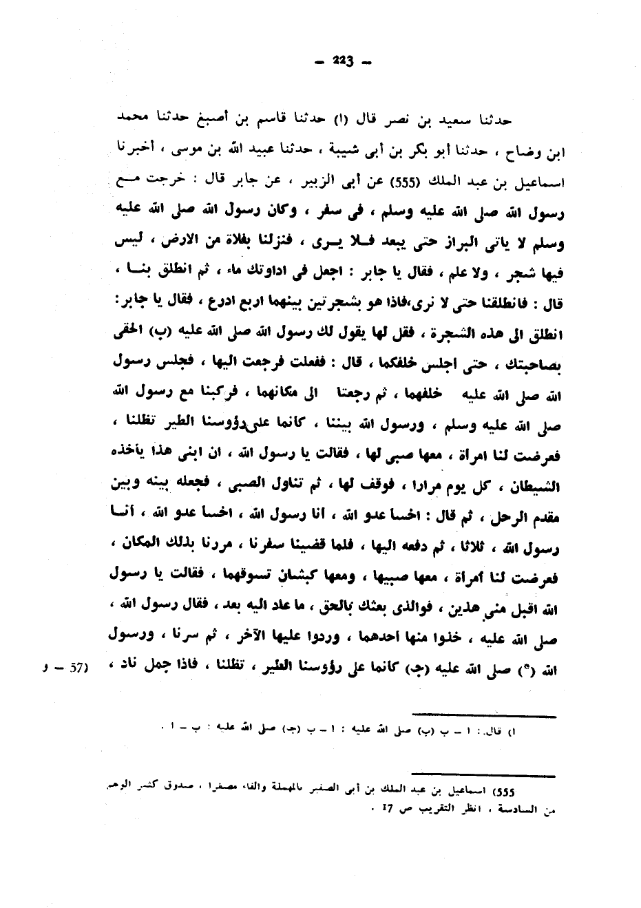 حَدَّثَنَا سَعِيدُ بْنُ نَصْرٍ قَالَ حَدَّثَنَا قَاسِمُ بن أصبغ حدثنا محمد ابْنُ وَضَّاحٍ حَدَّثَنَا أَبُو بَكْرِ بْنُ أَبِي شَيْبَةَ حَدَّثَنَا عُبَيْدُ اللَّهِ بْنُ مُوسَى أَخْبَرَنَا إِسْمَاعِيلُ بْنُ عَبْدِ الْمَلِكِ عَنْ أَبِي الزُّبَيْرِ عَنْ جَابِرٍ قَالَ خَرَجْتُ مَعَ رَسُولِ اللَّهِ صَلَّى اللَّهُ عَلَيْهِ وَسَلَّمَ فِي سَفَرٍ وَكَانَ رَسُولُ اللَّهِ صَلَّى اللَّهُ عَلَيْهِ وَسَلَّمَ لا يَأْتِي الْبَرَازَ حَتَّى يَبْعُدَ فَلَا يُرَى فَنَزَلْنَا بِفَلَاةٍ مِنَ الْأَرْضِ لَيْسَ فِيهَا شَجَرٌ وَلَا عَلَمٌ فَقَالَ يَا جَابِرُ اجْعَلْ فِي إِدَاوَتِكَ مَاءً ثُمَّ انْطَلِقْ بِنَا قَالَ فَانْطَلَقْنَا حَتَّى لَا نُرَى فَإِذَا هُوَ بِشَجَرَتَيْنِ بَيْنَهُمَا أَرْبَعُ أَدْرُعٍ فَقَالَ يَا جَابِرُ انْطَلِقْ إِلَى هَذِهِ الشَّجَرَةِ فَقُلْ لَهَا يَقُولُ لَكِ رَسُولُ اللَّهِ صَلَّى اللَّهُ عَلَيْهِ وَسَلَّمَ الْحَقِي بِصَاحِبَتِكِ حَتَّى أَجْلِسَ خَلْفَكُمَا قَالَ فَفَعَلَتْ فَرَجَعْتُ إِلَيْهَا فَجَلَسَ رَسُولُ اللَّهِ صَلَّى اللَّهُ عَلَيْهِ وَسَلَّمَ خَلْفَهُمَا ثُمَّ رَجَعَتَا إِلَى مَكَانِهِمَا فَرَكِبْنَا مَعَ رَسُولِ اللَّهِ صَلَّى اللَّهُ عَلَيْهِ وَسَلَّمَ وَرَسُولُ الله بيننا كأنما على رؤوسنا الطَّيْرُ تُظِلُّنَا فَعَرَضَتْ لَنَا امْرَأَةٌ مَعَهَا صَبِيٌّ لَهَا فَقَالَتْ يَا رَسُولَ اللَّهِ إِنَّ ابْنِي هَذَا يَأْخُذُهُ الشَّيْطَانُ كُلَّ يَوْمٍ مِرَارًا فَوَقَفَ لَهَا ثُمَّ تَنَاوَلِ الصَّبِيَّ فَجَعَلَهُ بَيْنَهُ وَبَيْنَ مَقْدِمِ الرَّحْلِ ثُمَّ قَالَ اخْسَأْ عَدُوَّ اللَّهِ أَنَا رَسُولُ اللَّهِ اخْسَأْ عَدُوَّ اللَّهِ أَنَا رَسُولُ اللَّهِ ثَلَاثًا ثُمَّ دَفَعَهُ إِلَيْهَا فَلَمَّا قَضَيْنَا سَفَرَنَا مَرَرْنَا بِذَلِكَ الْمَكَانِ فَعَرَضَتْ لَنَا امْرَأَةٌ مَعَهَا صَبِيُّهَا وَمَعَهَا كَبْشَانِ تَسُوقُهُمَا فَقَالَتْ يَا رَسُولَ اللَّهِ اقْبَلْ مِنِّي هَذَيْنِ فَوَالَّذِي بَعَثَكَ بِالْحَقِّ مَا عَادَ إِلَيْهِ بَعْدُ فَقَالَ رَسُولُ اللَّهِ صَلَّى اللَّهُ عَلَيْهِ وَسَلَّمَ خُذُوا مِنْهَا أَحَدَهُمَا وَرَدُّوا عَلَيْهَا الْآخَرَ ثُمَّ سِرْنَا ورسول الله (*) صلى الله عليه وسلم كأنما على رؤوسنا الطَّيْرُ تُظِلُّنَا فَإِذَا جَمَلٌ نَادٍ