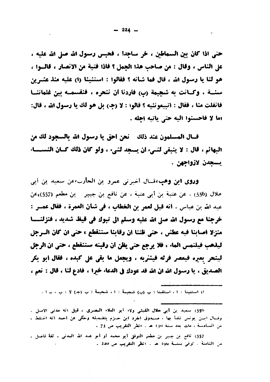 حَتَّى إِذَا كَانَ بَيْنَ السِّمَاطَيْنِ خَرَّ سَاجِدًا فحبس رسول الله صلى الله عليه وسلم على النَّاسِ وَقَالَ مَنْ صَاحِبُ هَذَا الْجَمَلِ فَإِذَا فِتْيَةٌ مِنَ الْأَنْصَارِ قَالُوا هُوَ لَنَا يَا رَسُولَ اللَّهِ قَالَ فَمَا شَأْنُهُ فَقَالُوا اسْتَنَيْنَا عَلَيْهِ مُنْذُ عِشْرِينَ سَنَةً وَكَانَتْ بِهِ شُجَيْمَةٌ فَأَرَدْنَا أَنْ نَنْحَرَهُ فَنُقَسِّمُهُ بَيْنَ غِلْمَانِنَا فَانْفَلَتَ مِنَّا فَقَالَ أَتَبِيعُونَنِيهِ قَالُوا لَا بَلْ هُوَ لَكَ يَا رَسُولَ اللَّهِ قَالَ أَمَا لَا فَأَحْسِنُوا إِلَيْهِ حَتَّى يَأْتِيَهُ أَجَلُهُ قَالَ الْمُسْلِمُونَ عِنْدَ ذَلِكَ نَحْنُ أَحَقُّ يَا رَسُولَ اللَّهِ بِالسُّجُودِ لَكَ مِنَ الْبَهَائِمِ قَالَ لَا يَنْبَغِي لِشَيْءٍ أَنْ يَسْجُدَ لِشَيْءٍ وَلَوْ كَانَ ذَلِكَ كَانَ النِّسَاءُ يَسْجُدْنَ لِأَزْوَاجِهِنَّ وَرَوَى ابْنُ وَهْبٍ قَالَ أَخْبَرَنِي عَمْرُو بْنُ الْحَارِثِ عَنْ سَعِيدِ بْنِ أَبِي هِلَالٍ عَنْ عُتْبَةَ بْنِ أَبِي عُتْبَةَ عَنْ نَافِعِ بْنِ جُبَيْرِ بْنِ مُطْعِمٍ عَنْ عَبْدِ اللَّهِ بْنِ عَبَّاسٍ أَنَّهُ قِيلَ لِعُمَرَ بْنِ الْخَطَّابِ فِي شَأْنِ الْعُمْرَةِ فَقَالَ عُمَرُ خَرَجْنَا مَعَ رَسُولِ اللَّهِ صَلَّى اللَّهُ عَلَيْهِ وَسَلَّمَ إِلَى تَبُوكَ فِي قَيْظٍ شَدِيدٍ فَنَزَلْنَا مَنْزِلًا أَصَابَنَا فِيهِ عَطَشٌ حَتَّى ظَنَنَّا أَنَّ رِقَابَنَا سَتَنْقَطِعُ حَتَّى إِنْ كَانَ الرَّجُلُ لِيَذْهَبُ فَيَلْتَمِسُ الْمَاءَ فَلَا يَرْجِعُ حَتَّى يَظُنَّ أَنَّ رَقَبَتَهُ سَتَنْقَطِعُ حَتَّى إِنَّ الرَّجُلَ لَيَنْحَرُ بَعِيرَهُ فَيَعْصِرُ فَرْثَهُ فَيَشْرَبُهُ وَيَجْعَلُ مَا بَقِيَ عَلَى كَبِدِهِ فَقَالَ أَبُو بَكْرٍ الصِّدِّيقُ يَا رَسُولَ اللَّهِ إِنَّ اللَّهَ قَدْ عَوَّدَكَ فِي الدُّعَاءِ خَيْرًا فَادْعُ لَنَا قَالَ نَعَمْ