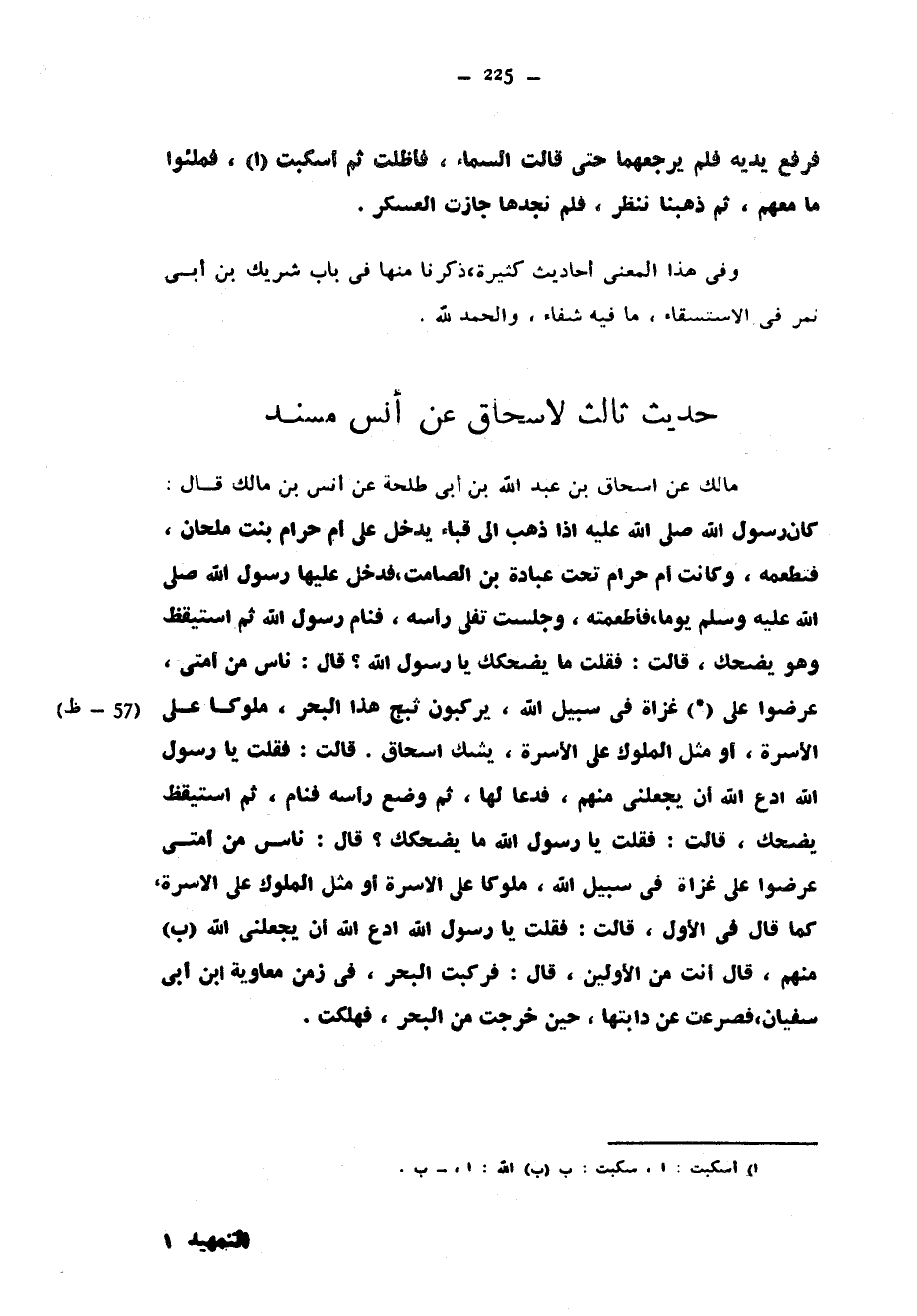حَدِيثٌ ثَالِثٌ لإسحاق عن أنس مسند مالك عَنْ إِسْحَاقَ بْنَ عَبْدِ اللَّهِ بْنِ أَبِي طَلْحَةَ عَنْ أَنَسِ بْنِ مَالِكٍ قَالَ كَانَ رَسُولُ اللَّهِ صَلَّى اللَّهُ عَلَيْهِ وَسَلَّمَ إِذَا ذَهَبَ إِلَى قُبَاءَ يَدْخُلُ عَلَى أُمِّ حَرَامٍ بِنْتِ مِلْحَانَ فَتُطْعِمُهُ وَكَانَتْ أُمُّ حَرَامٍ تَحْتَ عُبَادَةَ بْنِ الصَّامِتِ فَدَخَلَ عَلَيْهَا رَسُولُ اللَّهِ صَلَّى اللَّهُ عَلَيْهِ وَسَلَّمَ يَوْمًا فَأَطْعَمَتْهُ وَجَلَسَتْ تَفْلِي رَأْسَهُ فَنَامَ رَسُولُ اللَّهِ ثُمَّ اسْتَيْقَظَ وَهُوَ يَضْحَكُ قَالَتْ فَقَلْتُ مَا يُضْحِكُكَ يَا رَسُولَ اللَّهِ قَالَ نَاسٌ مِنْ أُمَّتِي عُرِضُوا عَلَيَّ (*) غُزَاةً فِي سَبِيلِ اللَّهِ يَرْكَبُونَ ثَبَجَ هَذَا الْبَحْرِ مُلُوكًا عَلَى الْأَسِرَّةِ أَوْ مِثْلَ الْمُلُوكِ عَلَى الْأَسِرَّةِ يَشُكُّ إِسْحَاقُ قَالَتْ فَقَلْتُ يَا رَسُولَ الله ادع الله يَجْعَلَنِي مِنْهُمْ فَدَعَا لَهَا ثُمَّ وَضَعَ رَأْسَهُ فنام ثم استيقظ يضحك قال فَقَلْتُ يَا رَسُولَ اللَّهِ مَا يُضْحِكُكَ قَالَ نَاسٌ مِنْ أُمَّتِي عُرِضُوا عَلَيَّ غُزَاةً فِي سَبِيلِ اللَّهِ مُلُوكًا عَلَى الْأَسِرَّةِ أَوْ مِثْلَ الْمُلُوكِ عَلَى الْأَسِرَّةِ كَمَا قَالَ فِي الْأَوَّلِ قَالَتْ فَقَلْتُ يَا رَسُولَ اللَّهِ ادْعُ اللَّهَ أَنْ يَجْعَلَنِي اللَّهُ مِنْهُمْ قَالَ أَنْتِ مِنَ الْأَوَّلِينَ قَالَ فَرَكِبَتِ الْبَحْرَ فِي زَمَنِ مُعَاوِيَةَ ابن أَبِي سُفْيَانَ فَصُرِعَتْ عَنْ دَابَّتِهَا حِينَ خَرَجَتْ مِنَ الْبَحْرِ فَهَلَكَتْ