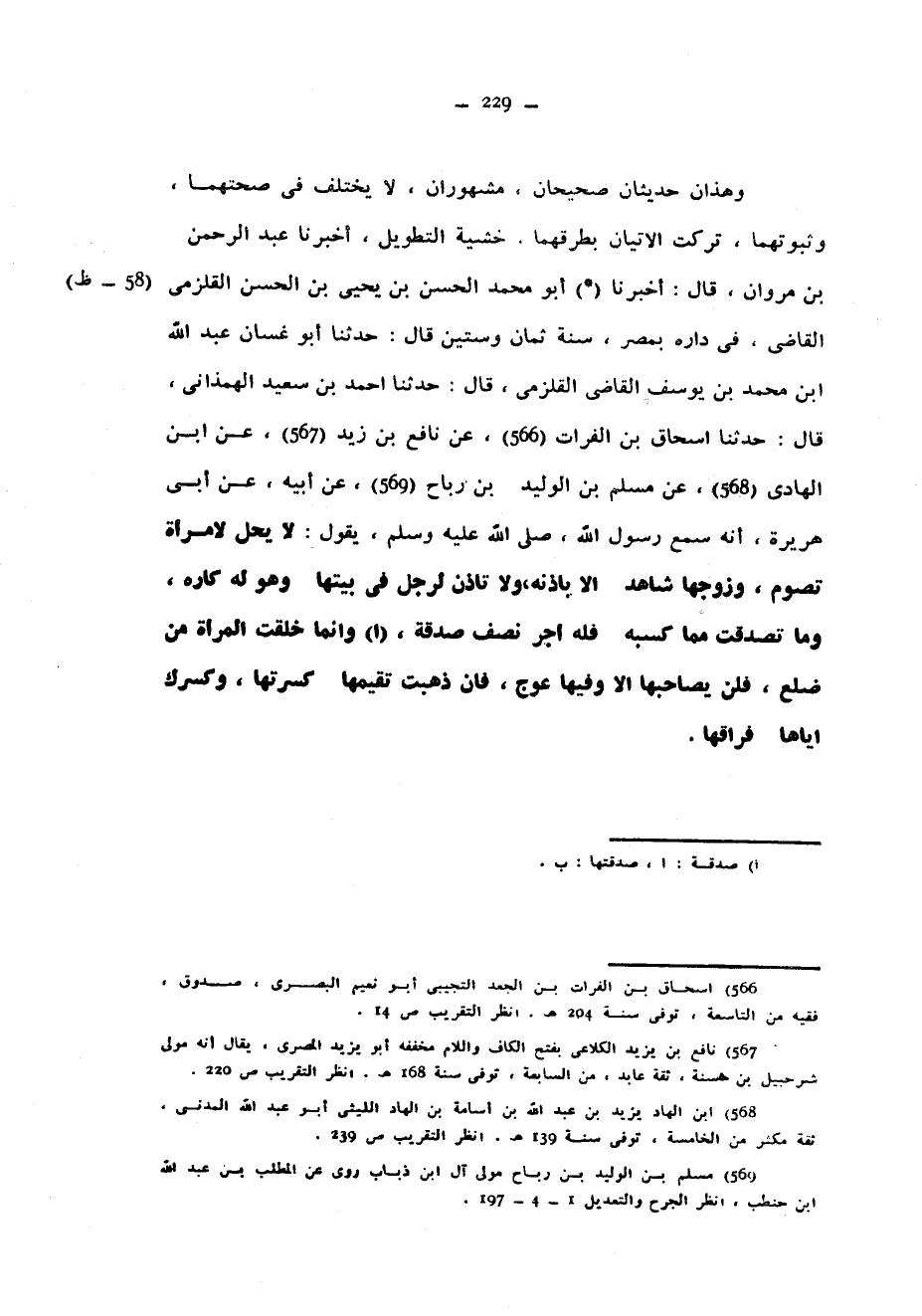 وَهَذَانِ حَدِيثَانِ صَحِيحَانِ مَشْهُورَانِ لَا يُخْتَلَفُ فِي صِحَّتِهِمَا وَثُبُوتِهِمَا تَرَكْتُ الْإِتْيَانَ بِطُرُقِهِمَا خَشْيَةَ التَّطْوِيلِ أَخْبَرَنَا عَبْدُ الرَّحْمَنِ بْنُ مَرْوَانَ قَالَ أَخْبَرَنَا (*) أَبُو مُحَمَّدٍ الْحَسَنُ بْنُ يَحْيَى بْنِ الْحَسَنِ الْقِلْزَمِيُّ الْقَاضِي فِي دَارِهِ بِمِصْرَ سَنَةَ ثَمَانٍ وَسِتِّينَ قَالَ حَدَّثَنَا أَبُو غَسَّانَ عَبْدُ اللَّهِ ابن مُحَمَّدِ بْنِ يُوسُفَ الْقَاضِي الْقِلْزَمِيُّ قَالَ حَدَّثَنَا أَحْمَدُ بْنُ سَعِيدٍ الْهَمَذَانِيُّ قَالَ حَدَّثَنَا إِسْحَاقُ بْنُ الْفُرَاتِ عَنْ نَافِعِ بْنِ زَيْدٍ عَنِ ابْنِ الْهَادِي عَنْ مُسْلِمِ بْنِ الْوَلِيدِ بْنِ رَبَاحٍ عَنْ أَبِيهِ عَنْ أَبِي هُرَيْرَةَ أَنَّهُ سَمِعَ رَسُولَ اللَّهِ صَلَّى اللَّهُ عَلَيْهِ وَسَلَّمَ يَقُولُ لَا يَحِلُّ لِامْرَأَةٍ تَصُومُ وَزَوْجُهَا شَاهِدٌ إِلَّا بِإِذْنِهِ وَلَا تَأْذَنُ لِرَجُلٍ فِي بَيْتِهَا وَهُوَ لَهُ كَارِهٌ وَمَا تَصَدَّقَتْ مِمَّا كَسَبَهُ فَلَهُ أَجْرُ نِصْفِ صَدَقَةٍ وَإِنَّمَا خُلِقَتِ الْمَرْأَةُ من ضلع فلن يصاحبها إلا وفيها عوجن فَإِنْ ذَهَبْتَ تُقِيمُهَا كَسَرْتَهَا وَكَسْرُكَ إِيَّاهَا فِرَاقُهَا