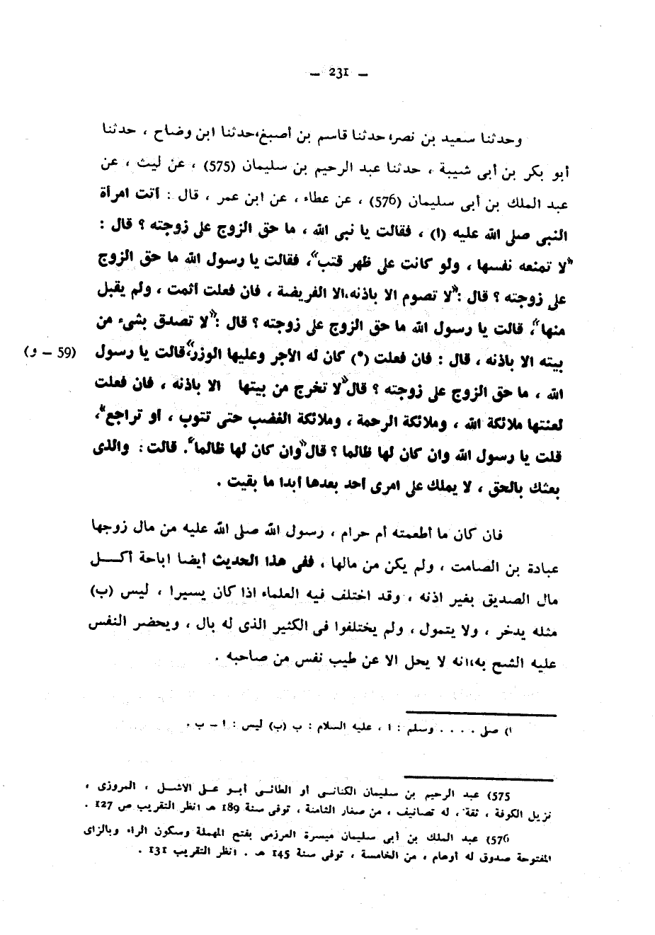 وَحَدَّثَنَا سَعِيدُ بْنُ نَصْرٍ حَدَّثَنَا قَاسِمُ بْنُ أَصْبَغَ حَدَّثَنَا ابْنُ وَضَّاحٍ حَدَّثَنَا أَبُو بَكْرِ بْنُ أَبِي شَيْبَةَ حَدَّثَنَا عَبْدُ الرَّحِيمِ بْنُ سُلَيْمَانَ عَنْ لَيْثٍ عَنْ عَبْدِ الْمَلِكِ بْنِ أَبِي سُلَيْمَانَ عَنْ عَطَاءٍ عَنِ ابْنِ عُمَرَ قَالَ أَتَتِ امْرَأَةٌ النَّبِيَّ صَلَّى اللَّهُ عَلَيْهِ وَسَلَّمَ فَقَالَتْ يَا نَبِيَّ اللَّهِ مَا حَقُّ الزَّوْجِ عَلَى زَوْجَتِهِ قَالَ لَا تَمْنَعُهُ نَفْسَهَا وَلَوْ كَانَتْ عَلَى ظَهْرِ قَتَبٍ فَقَالَتْ يَا رَسُولَ اللَّهِ مَا حَقُّ الزَّوْجِ عَلَى زَوْجَتِهِ قَالَ لَا تَصُومُ إِلَّا بِإِذْنِهِ إِلَّا الْفَرِيضَةَ فَإِنْ فَعَلَتْ أَثِمَتْ وَلَمْ يُقْبَلْ مِنْهَا قَالَتْ يَا رَسُولَ اللَّهِ مَا حَقُّ الزَّوْجِ عَلَى زَوْجَتِهِ قَالَ لَا تَصَدَّقُ بِشَيْءٍ مِنْ بَيْتِهِ إِلَّا بِإِذْنِهِ قَالَ فَإِنْ فَعَلَتْ (*) كَانَ لَهُ الْأَجْرُ وَعَلَيْهَا الْوِزْرُ قَالَتْ يَا رَسُولَ اللَّهِ مَا حَقُّ الزَّوْجِ عَلَى زَوْجَتِهِ قَالَ لَا تَخْرُجْ مِنْ بَيْتِهَا إِلَّا بِإِذْنِهِ فَإِنْ فَعَلَتْ لَعَنَتْهَا مَلَائِكَةُ اللَّهِ وَمَلَائِكَةُ الرَّحْمَةِ وَمَلَائِكَةُ الْغَضَبِ حَتَّى تَتُوبَ أَوْ تَرَاجَعُ قُلْتُ يَا رَسُولَ اللَّهِ وَإِنْ كَانَ لَهَا ظَالِمًا قَالَ وَإِنْ كَانَ لَهَا ظَالِمًا قَالَتْ وَالَّذِي بَعَثَكَ بِالْحَقِّ لَا يَمْلِكُ عَلَى أَمْرِي أَحَدٌ بَعْدَهَا أَبَدًا مَا بَقِيتُ فَإِنْ كَانَ مَا أَطْعَمَتْهُ أُمُّ حَرَامٍ رسول الله صلى الله عليه وسلم من مَالِ زَوْجِهَا عُبَادَةَ بْنِ الصَّامِتِ وَلَمْ يَكُنْ مِنْ مَالِهَا فَفِي هَذَا الْحَدِيثِ أَيْضًا إِبَاحَةُ أَكْلِ مَالِ الصَّدِيقِ بِغَيْرِ إِذْنِهِ وَقَدِ اخْتَلَفَ فِيهِ الْعُلَمَاءُ إِذَا كَانَ يَسِيرًا لَيْسَ مِثْلُهُ يُدَّخَرُ وَلَا يُتَمَوَّلُ وَلَمْ يَخْتَلِفُوا فِي الْكَثِيرِ الَّذِي لَهُ بَالٌ وَيَحْضُرُ النَّفْسَ عَلَيْهِ الشُّحُّ بِهِ أَنَّهُ لَا يَحِلُّ إِلَّا عَنْ طِيبِ نَفْسٍ مِنْ صَاحِبِهِ