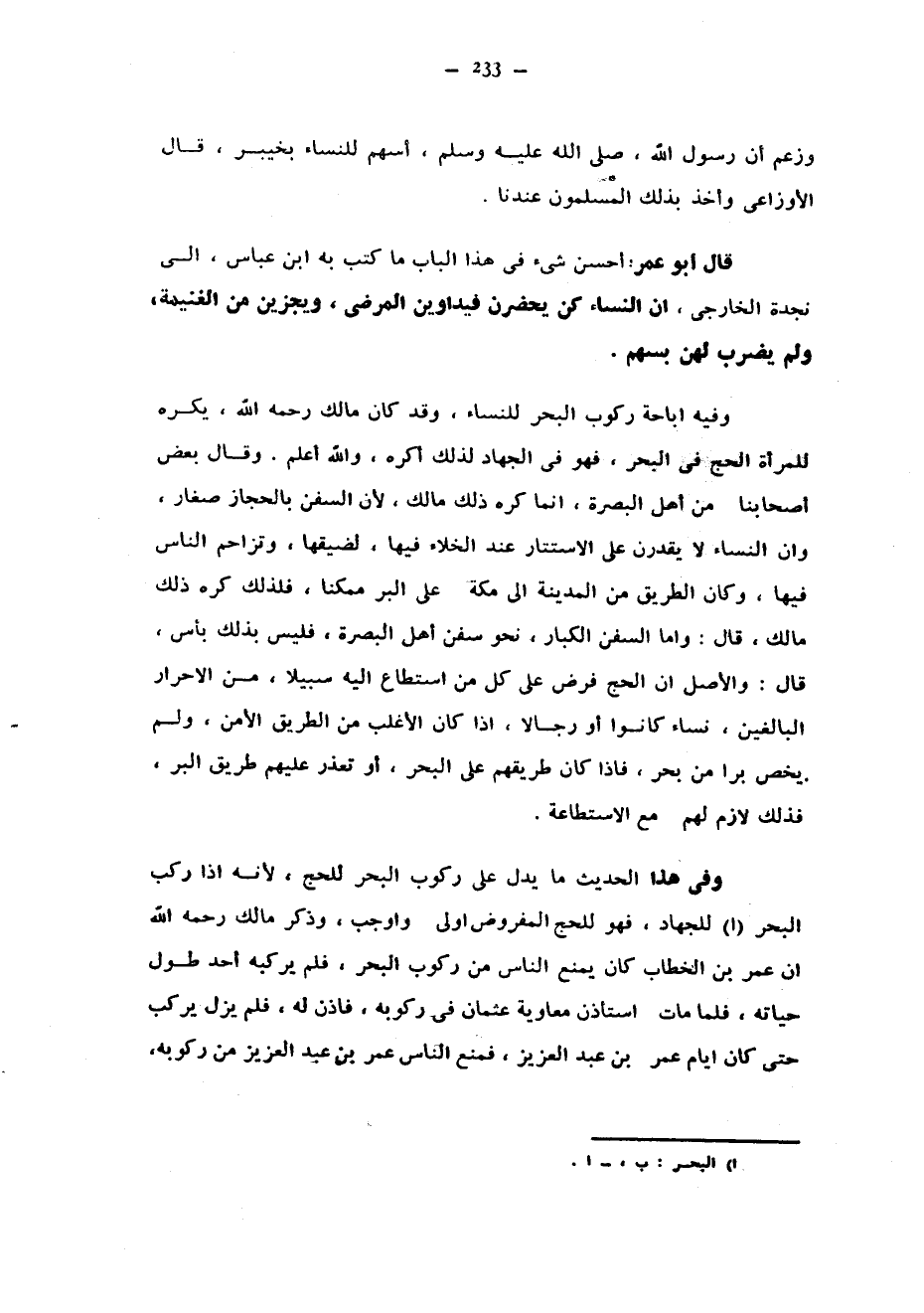 وَزَعَمَ أَنَّ رَسُولَ اللَّهِ صَلَّى اللَّهُ عَلَيْهِ وَسَلَّمَ أَسْهَمَ لِلنِّسَاءِ بِخَيْبَرَ قَالَ الْأَوْزَاعِيُّ وَأَخَذَ بِذَلِكَ الْمُسْلِمُونَ عِنْدَنَا قَالَ أَبُو عُمَرَ أَحْسَنُ شَيْءٍ فِي هَذَا الْبَابِ مَا كَتَبَ بِهِ ابْنُ عَبَّاسٍ إِلَى نَجْدَةَ الْخَارِجِيِّ أَنَّ النِّسَاءَ كُنَّ يَحْضُرْنَ فَيُدَاوِينَ الْمَرْضَى وَيُجْزَيْنَ مِنَ الْغَنِيمَةِ وَلَمْ يُضْرَبْ لَهُنَّ بِسَهْمٍ وَفِيهِ إِبَاحَةُ رُكُوبِ الْبَحْرِ لِلنِّسَاءِ وَقَدْ كَانَ مَالِكٌ رَحِمَهُ اللَّهُ يَكْرَهُ لِلْمَرْأَةِ الْحَجَّ فِي الْبَحْرِ فَهُوَ فِي الْجِهَادِ لِذَلِكَ أَكْرَهُ وَاللَّهُ أَعْلَمُ وَقَالَ بَعْضُ أَصْحَابِنَا مِنْ أَهْلِ الْبَصْرَةِ إِنَّمَا كَرِهَ ذَلِكَ مَالِكٌ لِأَنَّ السُّفُنَ بِالْحِجَازِ صِغَارٌ وَأَنَّ النِّسَاءَ لَا يَقْدِرْنَ عَلَى الِاسْتِتَارِ عِنْدَ الْخَلَاءِ فِيهَا لِضِيقِهَا وَتَزَاحُمِ النَّاسِ فِيهَا وَكَانَ الطَّرِيقُ مِنَ الْمَدِينَةِ إِلَى مَكَّةَ عَلَى الْبَرِّ مُمْكِنًا فَلِذَلِكَ كَرِهَ ذَلِكَ مَالِكٌ قَالَ وَأَمَّا السُّفُنُ الْكِبَارُ نَحْوَ سُفُنِ أَهْلِ الْبَصْرَةِ فَلَيْسَ بِذَلِكَ بَأْسٌ قَالَ وَالْأَصْلُ أَنَّ الْحَجَّ فَرْضٌ عَلَى كُلِّ مَنِ اسْتَطَاعَ إِلَيْهِ سَبِيلًا مِنَ الْأَحْرَارِ الْبَالِغِينَ نِسَاءً كَانُوا أَوْ رِجَالًا إِذَا كَانَ الْأَغْلَبُ مِنَ الطَّرِيقِ الْأَمْنَ وَلَمْ يَخُصَّ بَرًّا مِنْ بَحْرٍ فَإِذَا كَانَ طَرِيقُهُمْ عَلَى الْبَحْرِ أَوْ تَعَذَّرَ عَلَيْهِمْ طَرِيقُ الْبَرِّ فَذَلِكَ لَازِمٌ لَهُمْ مَعَ الِاسْتِطَاعَةِ وَفِي هَذَا الْحَدِيثِ مَا يَدُلُّ عَلَى رُكُوبِ الْبَحْرِ لِلْحَجِّ لِأَنَّهُ إِذَا رَكِبَ الْبَحْرَ لِلْجِهَادِ فَهُوَ لِلْحَجِّ الْمَفْرُوضِ أَوْلَى وَأَوْجَبُ وَذَكَرَ مَالِكٌ رَحِمَهُ اللَّهُ أَنَّ عُمَرَ بْنَ الْخَطَّابِ كَانَ يَمْنَعُ النَّاسَ مَنْ رُكُوبِ الْبَحْرِ فَلَمْ يَرْكَبْهُ أَحَدٌ طُولَ حَيَاتِهِ فَلَمَّا مَاتَ اسْتَأْذَنَ مُعَاوِيَةُ عُثْمَانَ فِي رُكُوبِهِ فَأَذِنَ لَهُ فَلَمْ يَزَلْ يَرْكَبُ حَتَّى كَانَ أَيَّامُ عُمَرَ بْنِ عَبْدِ الْعَزِيزِ فَمَنَعَ النَّاسَ عُمَرُ بْنُ عَبْدِ الْعَزِيزِ مِنْ رُكُوبِهِ