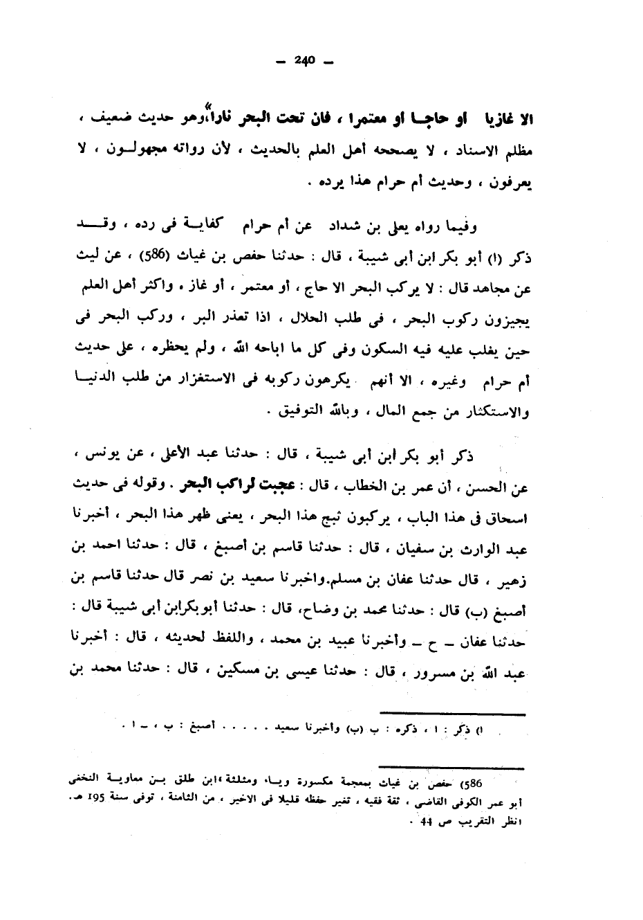 إِلَّا غَازِيًا أَوْ حَاجًّا أَوْ مُعْتَمِرًا فَإِنَّ تَحْتَ الْبَحْرِ نَارًا وَهُوَ حَدِيثٌ ضَعِيفٌ مُظْلِمُ الْإِسْنَادِ لَا يُصَحِّحُهُ أَهْلُ الْعِلْمِ بِالْحَدِيثِ لِأَنَّ رُوَاتَهُ مَجْهُولُونَ لَا يُعْرَفُونَ وَحَدِيثُ أُمِّ حَرَامٍ هَذَا يَرُدُّهُ وَفِيمَا رَوَاهُ يَعْلَى بْنُ شَدَّادٍ عَنْ أُمِّ حَرَامٍ كِفَايَةٌ فِي رَدِّهِ وَقَدْ ذَكَرَ أَبُو بَكْرِ بْنُ أَبِي شَيْبَةَ قَالَ حَدَّثَنَا حَفْصُ بْنُ غِيَاثٍ عَنْ لَيْثٍ عَنْ مُجَاهِدٍ قَالَ لَا يَرْكَبُ الْبَحْرَ إِلَّا حَاجٌّ أَوْ مُعْتَمِرٌ أَوْ غَازٍ وَأَكْثَرُ أَهْلِ الْعِلْمِ يُجِيزُونَ رُكُوبَ الْبَحْرِ فِي طَلَبِ الْحَلَالِ إِذَا تَعَذَّرَ الْبَرُّ وَرَكِبَ الْبَحْرَ فِي حِينٍ يَغْلِبُ عَلَيْهِ فِيهِ السُّكُونُ وَفِي كُلِّ مَا أَبَاحَهُ اللَّهُ وَلَمْ يَحْظُرْهُ عَلَى حَدِيثِ أُمِّ حَرَامٍ وَغَيْرِهِ إِلَّا أَنَّهُمْ يَكْرَهُونَ رُكُوبَهُ فِي الِاسْتِغْزَارِ مِنْ طَلَبِ الدُّنْيَا وَالِاسْتِكْثَارِ مِنْ جَمْعِ الْمَالِ وَبِاللَّهِ التَّوْفِيقُ ذَكَرَ أَبُو بَكْرِ بْنُ أَبِي شَيْبَةَ قَالَ حَدَّثَنَا عَبْدُ الْأَعْلَى عَنْ يُونُسَ عَنِ الْحَسَنِ أَنَّ عُمَرَ بْنَ الْخَطَّابِ قَالَ عَجِبْتُ لِرَاكِبِ الْبَحْرِ وَقَوْلُهُ فِي حَدِيثِ إِسْحَاقَ فِي هَذَا الْبَابِ يَرْكَبُونَ ثَبَجَ هَذَا الْبَحْرِ يَعْنِي ظَهْرَ هَذَا الْبَحْرِ أَخْبَرَنَا عَبْدُ الْوَارِثِ بْنُ سُفْيَانَ قَالَ حَدَّثَنَا قَاسِمُ بْنُ أَصْبَغَ قَالَ حَدَّثَنَا أَحْمَدُ بْنُ زُهَيْرٍ قَالَ حَدَّثَنَا عَفَّانُ بْنُ مُسْلِمٍ وَأَخْبَرَنَا سَعِيدُ بْنُ نَصْرٍ قَالَ حَدَّثَنَا قَاسِمُ بْنُ أَصْبَغَ قَالَ حَدَّثَنَا مُحَمَّدُ بْنُ وَضَّاحٍ قَالَ حَدَّثَنَا أَبُو بَكْرِ بْنُ أَبِي شَيْبَةَ قَالَ حَدَّثَنَا عَفَّانُ ح وَأَخْبَرَنَا عُبَيْدُ بْنُ مُحَمَّدٍ وَاللَّفْظُ لِحَدِيثِهِ قَالَ أَخْبَرَنَا عَبْدُ اللَّهِ بْنُ مَسْرُورٍ قَالَ حَدَّثَنَا عِيسَى بْنُ مِسْكِينٍ قَالَ حَدَّثَنَا مُحَمَّدُ بْنُ