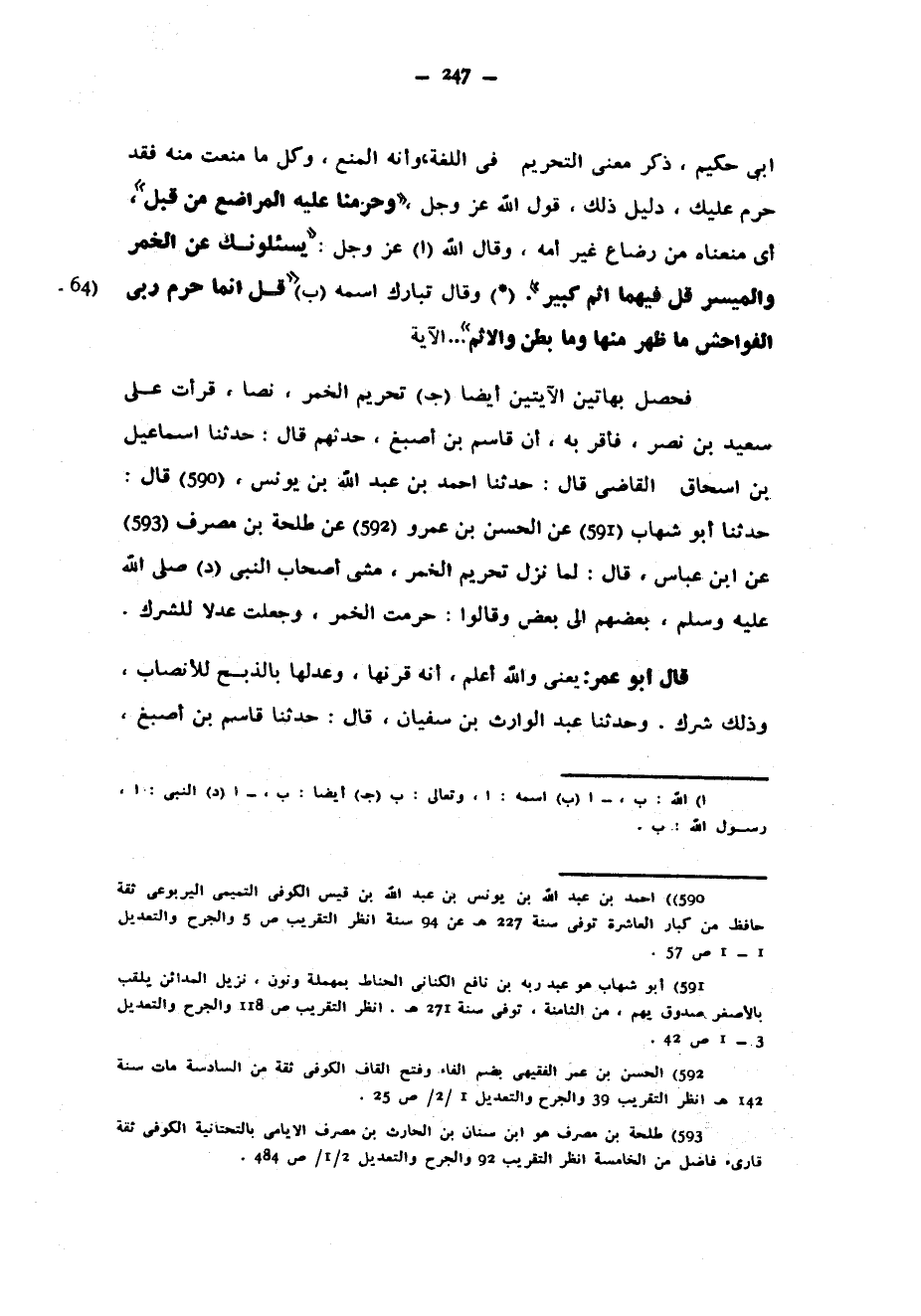 أَبِي حَكِيمٍ ذِكْرُ مَعْنَى التَّحْرِيمِ فِي اللُّغَةِ وَأَنَّهُ الْمَنْعُ وَكُلُّ مَا مُنِعْتَ مِنْهُ فَقَدْ حَرُمَ عَلَيْكَ دَلِيلُ ذَلِكَ قَوْلُ اللَّهِ عَزَّ وَجَلَّ وَحَرَّمْنَا عَلَيْهِ الْمَرَاضِعَ مِنْ قَبْلُ أَيْ مَنَعْنَاهُ مِنْ رَضَاعِ غَيْرِ أُمِّهِ وَقَالَ اللَّهُ عز وجل يسئلونك عَنِ الْخَمْرِ وَالْمَيْسِرِ قُلْ فِيهِمَا إِثْمٌ كَبِيرٌ (*) وَقَالَ تَبَارَكَ اسْمُهُ قُلْ إِنَّمَا حَرَّمَ رَبِّيَ الْفَوَاحِشَ مَا ظَهَرَ مِنْهَا وَمَا بَطَنَ وَالْإِثْمَ الْآيَةَ فَحَصَلَ بِهَاتَيْنِ الْآيَتَيْنِ أَيْضًا تَحْرِيمُ الْخَمْرِ نَصًّا قَرَأْتُ عَلَى سَعِيدِ بْنِ نَصْرٍ فَأَقَرَّ بِهِ أَنَّ قَاسِمَ بْنَ أَصْبَغَ حَدَّثَهُمْ قَالَ حَدَّثَنَا إِسْمَاعِيلُ بْنُ إِسْحَاقَ الْقَاضِي قَالَ حَدَّثَنَا أَحْمَدُ بْنُ عَبْدِ اللَّهِ بْنِ يُونُسَ قَالَ حَدَّثَنَا أَبُو شِهَابٍ عَنِ الْحَسَنِ بْنِ عَمْرٍو عَنْ طَلْحَةَ بْنِ مُصَرِّفٍ عَنِ ابْنِ عَبَّاسٍ قَالَ لَمَّا نَزَلَ تَحْرِيمُ الْخَمْرِ مَشَى أَصْحَابُ النَّبِيِّ صَلَّى اللَّهُ عَلَيْهِ وَسَلَّمَ بَعْضُهُمْ إِلَى بَعْضٍ وَقَالُوا حُرِّمَتِ الْخَمْرُ وَجُعِلَتْ عِدْلًا لِلشِّرْكِ قَالَ أَبُو عُمَرَ يَعْنِي وَاللَّهُ أَعْلَمُ أَنَّهُ قَرَنَهَا وَعَدَلَهَا بِالذَّبْحِ لِلْأَنْصَابِ وَذَلِكَ شِرْكٌ وَحَدَّثَنَا عَبْدُ الْوَارِثِ بْنُ سُفْيَانَ قَالَ حَدَّثَنَا قَاسِمُ بْنُ أَصْبَغَ
