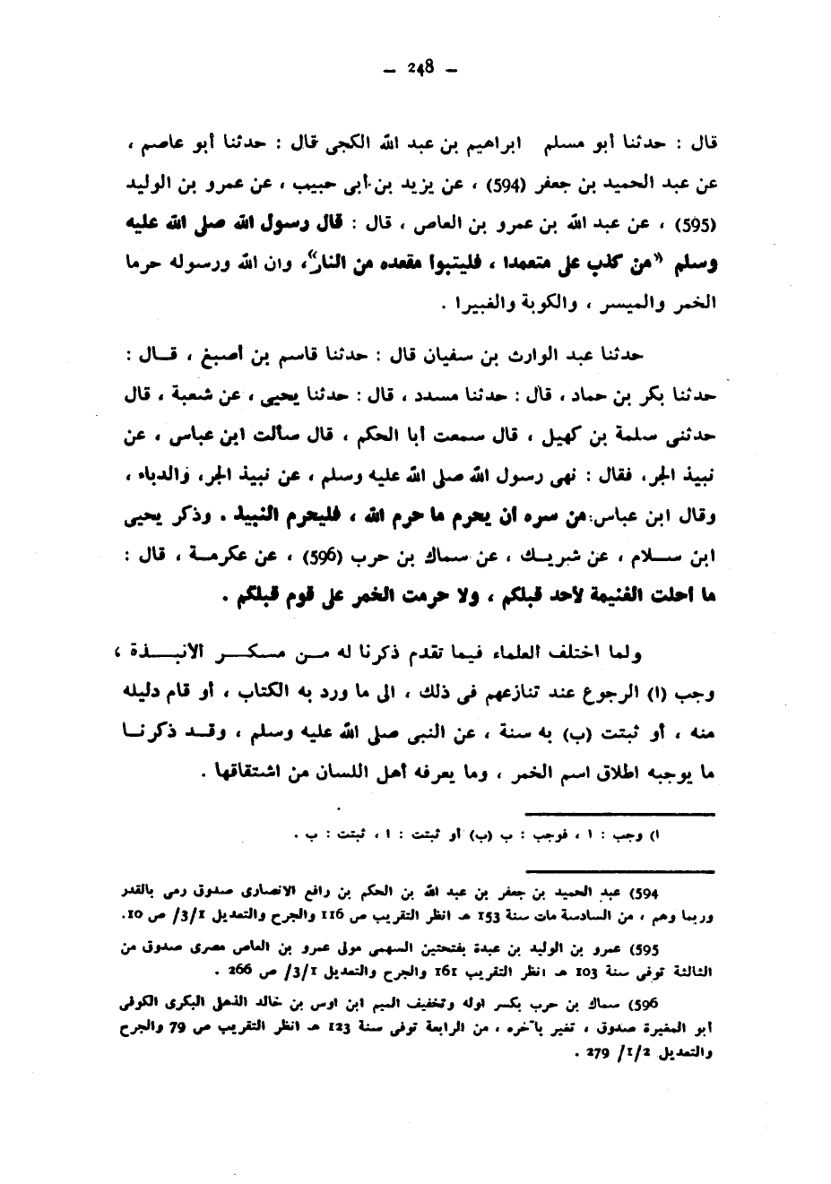 قَالَ حَدَّثَنَا أَبُو مُسْلِمٍ إِبْرَاهِيمُ بْنُ عَبْدِ اللَّهِ الْكَجِّيُّ قَالَ حَدَّثَنَا أَبُو عَاصِمٍ عَنْ عَبْدِ الْحَمِيدِ بْنِ جَعْفَرٍ عَنْ يَزِيدَ بْنِ أَبِي حَبِيبٍ عَنْ عَمْرِو بْنِ الْوَلِيدِ عَنْ عَبْدِ اللَّهِ بْنِ عَمْرِو بْنِ الْعَاصِ قَالَ قَالَ رَسُولُ اللَّهِ صَلَّى اللَّهُ عَلَيْهِ وَسَلَّمَ مَنْ كَذَبَ عَلَيَّ مُتَعَمِّدًا فَلْيَتَبَوَّأْ مَقْعَدَهُ مِنَ النَّارِ وَإِنَّ اللَّهَ وَرَسُولَهُ حَرَّمَا الْخَمْرَ وَالْمَيْسِرَ وَالْكَوْبَةَ وَالْغُبَيْرَا حَدَّثَنَا عَبْدُ الْوَارِثِ بْنُ سُفْيَانَ قَالَ حَدَّثَنَا قَاسِمُ بْنُ أَصْبَغَ قَالَ حَدَّثَنَا بَكْرُ بْنُ حَمَّادٍ قَالَ حَدَّثَنَا مُسَدَّدٌ قَالَ حَدَّثَنَا يَحْيَى عَنْ شُعْبَةَ قَالَ حَدَّثَنِي سَلَمَةُ بْنُ كُهَيْلٍ قَالَ سَمِعْتُ أَبَا الْحَكَمِ قَالَ سَأَلْتُ ابْنَ عَبَّاسٍ عَنْ نَبِيذِ الْجَرِّ فَقَالَ نَهَى رَسُولُ اللَّهِ صَلَّى اللَّهُ عَلَيْهِ وَسَلَّمَ عَنْ نَبِيذِ الْجَرِّ وَالدُّبَّاءِ وَقَالَ ابْنُ عَبَّاسٍ مَنْ سَرَّهُ أَنْ يُحَرِّمَ مَا حَرَّمَ اللَّهُ فليحرم النبيذ وذكر يحيى ابن سَلَّامٍ عَنْ شَرِيكٍ عَنْ سِمَاكِ بْنِ حَرْبٍ عَنْ عِكْرِمَةَ قَالَ مَا أُحِلَّتِ الْغَنِيمَةُ لِأَحَدٍ قَبْلَكُمْ وَلَا حُرِّمَتِ الْخَمْرُ عَلَى قَوْمٍ قَبْلَكُمْ وَلَمَّا اخْتَلَفَ الْعُلَمَاءُ فِيمَا تَقَدَّمَ ذِكْرُنَا لَهُ مِنْ مُسْكِرِ الْأَنْبِذَةِ وَجَبَ الرُّجُوعُ عِنْدَ تَنَازُعِهِمْ فِي ذَلِكَ إِلَى مَا وَرَدَ بِهِ الْكِتَابُ أَوْ قَامَ دَلِيلُهُ مِنْهُ أَوْ ثَبَتَتْ بِهِ سُنَّةٌ عَنِ النَّبِيِّ صَلَّى اللَّهُ عَلَيْهِ وَسَلَّمَ وَقَدْ ذَكَرْنَا مَا يُوجِبُهُ إِطْلَاقُ اسْمِ الْخَمْرِ وَمَا يَعْرِفُهُ أَهْلُ اللِّسَانِ مِنِ اشْتِقَاقِهَا