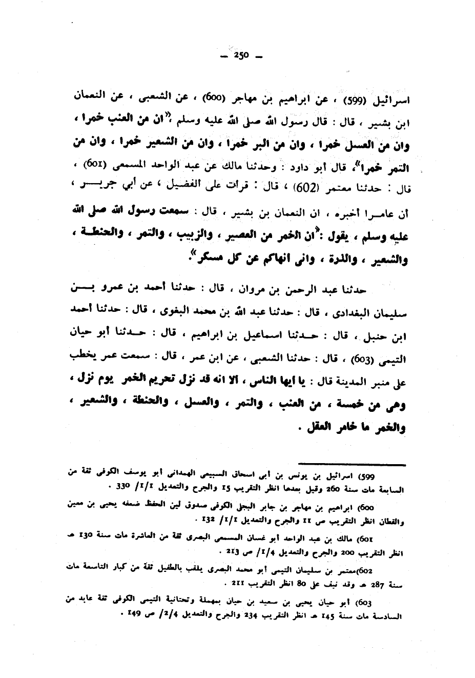 إِسْرَائِيلُ عَنْ إِبْرَاهِيمَ بْنِ مُهَاجِرٍ عَنِ الشَّعْبِيِّ عن النعمان ابن بَشِيرٍ قَالَ قَالَ رَسُولُ اللَّهِ صَلَّى اللَّهُ عَلَيْهِ وَسَلَّمَ إِنَّ مِنَ الْعِنَبِ خَمْرًا وَإِنَّ مِنَ الْعَسَلِ خَمْرًا وَإِنَّ مِنَ الْبُرِّ خَمْرًا وَإِنَّ مِنَ الشَّعِيرِ خَمْرًا وَإِنَّ مِنَ التَّمْرِ خَمْرًا قَالَ أَبُو دَاوُدَ وَحَدَّثَنَا مَالِكٌ عَنْ عَبْدِ الْوَاحِدِ الْمُسْمَعِيِّ قَالَ حَدَّثَنَا مُعْتَمِرٌ قَالَ قَرَأْتُ عَلَى الْفُضَيْلِ عَنْ أَبِي جَرِيرٍ أَنَّ عَامِرًا أَخْبَرَهُ أَنَّ النُّعْمَانَ بْنَ بَشِيرٍ قَالَ سَمِعْتُ رَسُولَ اللَّهِ صَلَّى اللَّهُ عَلَيْهِ وسلم يَقُولُ إِنَّ الْخَمْرَ مِنَ الْعَصِيرِ وَالزَّبِيبِ وَالتَّمْرِ وَالْحِنْطَةِ وَالشَّعِيرِ وَالذُّرَةِ وَإِنِّي أَنْهَاكُمْ عَنْ كُلِّ مُسْكِرٍ حَدَّثَنَا عَبْدُ الرَّحْمَنِ بْنُ مَرْوَانَ قَالَ حَدَّثَنَا أَحْمَدُ بْنُ عَمْرِو بْنِ سُلَيْمَانَ الْبَغْدَادِيُّ قَالَ حَدَّثَنَا عَبْدُ اللَّهِ بْنُ مُحَمَّدٍ الْبَغَوِيُّ قال حدثنا أحمد ابن حَنْبَلٍ قَالَ حَدَّثَنَا إِسْمَاعِيلُ بْنُ إِبْرَاهِيمَ قَالَ حَدَّثَنَا أَبُو حَيَّانَ التَّيْمِيُّ قَالَ حَدَّثَنَا الشَّعْبِيُّ عَنِ ابْنِ عُمَرَ قَالَ سَمِعْتُ عُمَرَ يَخْطُبُ عَلَى مِنْبَرِ الْمَدِينَةِ قَالَ يَا أَيُّهَا النَّاسُ أَلَا إِنَّهُ قَدْ نَزَلَ تَحْرِيمُ الْخَمْرِ يَوْمَ نَزَلَ وَهِيَ مِنْ خَمْسَةٍ مِنَ الْعِنَبِ وَالتَّمْرِ وَالْعَسَلِ وَالْحِنْطَةِ وَالشَّعِيرِ وَالْخَمْرُ مَا خَامَرَ الْعَقْلَ
