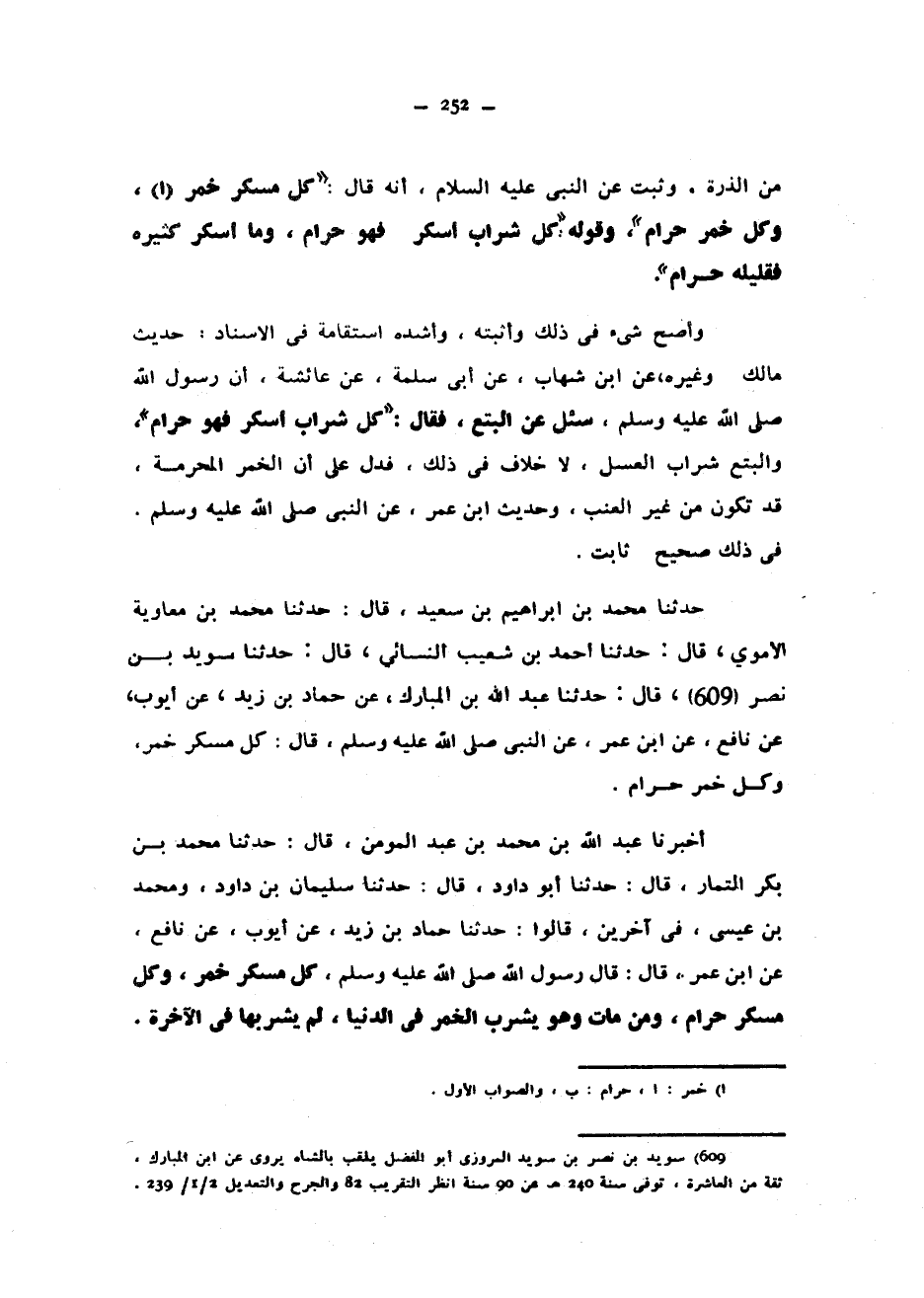 مِنَ الذُّرَةِ وَثَبَتَ عَنِ النَّبِيِّ عَلَيْهِ السَّلَامُ أَنَّهُ قَالَ كُلُّ مُسْكِرٍ خَمْرٌ وَكُلُّ خَمْرٍ حَرَامٌ وَقَوْلُهُ كُلُّ شَرَابٍ أَسْكَرَ فَهُوَ حَرَامٌ وَمَا أَسْكَرَ كَثِيرُهُ فَقَلِيلُهُ حَرَامٌ وَأَصَحُّ شَيْءٍ فِي ذَلِكَ وَأَثْبَتُهُ وَأَشَدُّهُ اسْتِقَامَةً فِي الْإِسْنَادِ حَدِيثُ مَالِكٍ وَغَيْرِهِ عَنِ ابْنِ شِهَابٍ عَنْ أَبِي سَلَمَةَ عَنْ عَائِشَةَ أَنَّ رَسُولَ اللَّهِ صَلَّى اللَّهُ عَلَيْهِ وَسَلَّمَ سُئِلَ عَنِ الْبِتْعِ فقال كل شرابا أَسْكَرَ فَهُوَ حَرَامٌ وَالْبِتْعُ شَرَابُ الْعَسَلِ لَا خِلَافَ فِي ذَلِكَ فَدَلَّ عَلَى أَنَّ الْخَمْرَ الْمُحَرَّمَةَ قَدْ تَكُونُ مِنْ غَيْرِ الْعِنَبِ وَحَدِيثُ ابْنِ عُمَرَ عَنِ النَّبِيِّ صَلَّى اللَّهُ عَلَيْهِ وَسَلَّمَ فِي ذَلِكَ صَحِيحٌ ثَابِتٌ حَدَّثَنَا مُحَمَّدُ بْنُ إِبْرَاهِيمَ بْنِ سَعِيدٍ قَالَ حَدَّثَنَا مُحَمَّدُ بْنُ مُعَاوِيَةَ الْأُمَوِيُّ قَالَ حَدَّثَنَا أَحْمَدُ بْنُ شُعَيْبٍ النَّسَائِيُّ قَالَ حَدَّثَنَا سُوِيدُ بْنُ نَصْرٍ قَالَ حَدَّثَنَا عَبْدُ اللَّهِ بْنُ الْمُبَارَكِ عَنْ حَمَّادُ بْنُ زَيْدٍ عَنْ أَيُّوبَ عَنْ نَافِعٍ عَنِ ابْنِ عُمَرَ عَنِ النَّبِيِّ صَلَّى اللَّهُ عَلَيْهِ وَسَلَّمَ قَالَ كُلُّ مُسْكِرٍ خَمْرٌ وَكُلُّ خَمْرٍ حَرَامٌ أَخْبَرَنَا عَبْدُ اللَّهِ بْنُ مُحَمَّدِ بْنِ عَبْدِ الْمُؤْمِنِ قَالَ حَدَّثَنَا مُحَمَّدُ بْنُ بَكْرٍ التَّمَّارُ قَالَ حَدَّثَنَا أَبُو دَاوُدَ قَالَ حَدَّثَنَا سُلَيْمَانُ بْنُ دَاوُدَ وَمُحَمَّدُ بْنُ عِيسَى فِي آخَرِينَ قَالُوا حَدَّثَنَا حَمَّادُ بْنُ زَيْدٍ عَنْ أَيُّوبَ عَنْ نَافِعٍ عَنِ ابْنِ عُمَرَ قَالَ قَالَ رَسُولُ اللَّهِ صَلَّى اللَّهُ عَلَيْهِ وَسَلَّمَ كُلُّ مُسْكِرٍ خَمْرٌ وَكُلُّ مُسْكِرٍ حَرَامٌ وَمَنْ مَاتَ وَهُوَ يَشْرَبُ الْخَمْرَ فِي الدُّنْيَا لَمْ يَشْرَبْهَا فِي الْآخِرَةِ