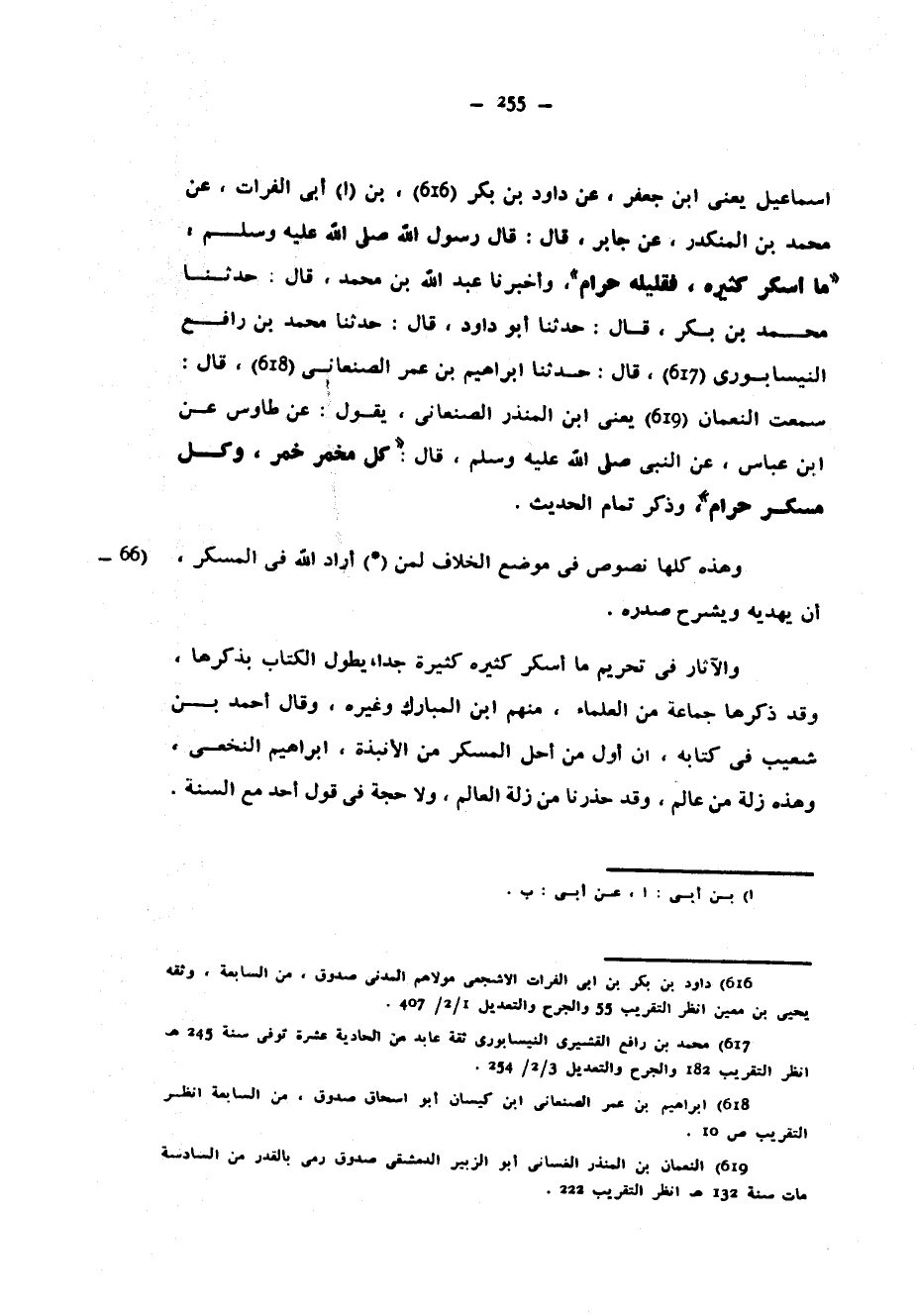 إِسْمَاعِيلُ يَعْنِي ابْنَ جَعْفَرٍ عَنْ دَاوُدَ بْنِ بَكْرِ بْنِ أَبِي الْفُرَاتِ عَنْ مُحَمَّدِ بْنِ الْمُنْكَدِرِ عَنْ جَابِرٍ قَالَ قَالَ رَسُولُ اللَّهِ صَلَّى اللَّهُ عَلَيْهِ وَسَلَّمَ مَا أَسْكَرَ كَثِيرُهُ فَقَلِيلُهُ حَرَامٌ وَأَخْبَرَنَا عَبْدُ اللَّهِ بْنُ مُحَمَّدٍ قَالَ حَدَّثَنَا مُحَمَّدُ بْنُ بَكْرٍ قَالَ حَدَّثَنَا أَبُو دَاوُدَ قَالَ حَدَّثَنَا مُحَمَّدُ بْنُ رَافِعٍ النَّيْسَابُورِيُّ قَالَ حَدَّثَنَا إِبْرَاهِيمُ بْنُ عُمَرَ الصَّنْعَانِيُّ قَالَ سَمِعْتُ النُّعْمَانَ يَعْنِي ابْنَ الْمُنْذِرِ الصَّنْعَانِيَّ يَقُولُ عَنْ طَاوُسٍ عَنِ ابْنِ عَبَّاسٍ عَنِ النَّبِيِّ صَلَّى اللَّهُ عَلَيْهِ وَسَلَّمَ قَالَ كُلُّ مُخَمِّرٍ خَمْرٌ وَكُلُّ مُسْكِرٍ حَرَامٌ وَذَكَرَ تَمَامَ الْحَدِيثِ وَهَذِهِ كُلُّهَا نُصُوصٌ فِي مَوْضِعِ الْخِلَافِ لِمَنْ (*) أَرَادَ اللَّهُ فِي الْمُسْكِرِ أَنْ يَهْدِيَهُ وَيَشْرَحَ صَدْرَهُ وَالْآثَارُ فِي تَحْرِيمِ مَا أَسْكَرَ كَثِيرُهُ كَثِيرَةٌ جِدًّا يَطُولُ الْكِتَابُ بِذِكْرِهَا وَقَدْ ذَكَرَهَا جَمَاعَةٌ مِنَ الْعُلَمَاءِ مِنْهُمُ ابْنُ الْمُبَارَكِ وَغَيْرُهُ وَقَالَ أَحْمَدُ بْنُ شُعَيْبٍ فِي كِتَابِهِ إِنَّ أَوَّلَ مَنْ أَحَلَّ الْمُسْكِرَ مِنَ الْأَنْبِذَةِ إِبْرَاهِيمُ النَّخَعِيُّ وَهَذِهِ زَلَّةٌ مِنْ عَالِمٍ وَقَدْ حُذِّرْنَا مِنْ زَلَّةِ الْعَالَمِ وَلَا حُجَّةَ فِي قَوْلِ أَحَدٍ مَعَ السُّنَّةِ