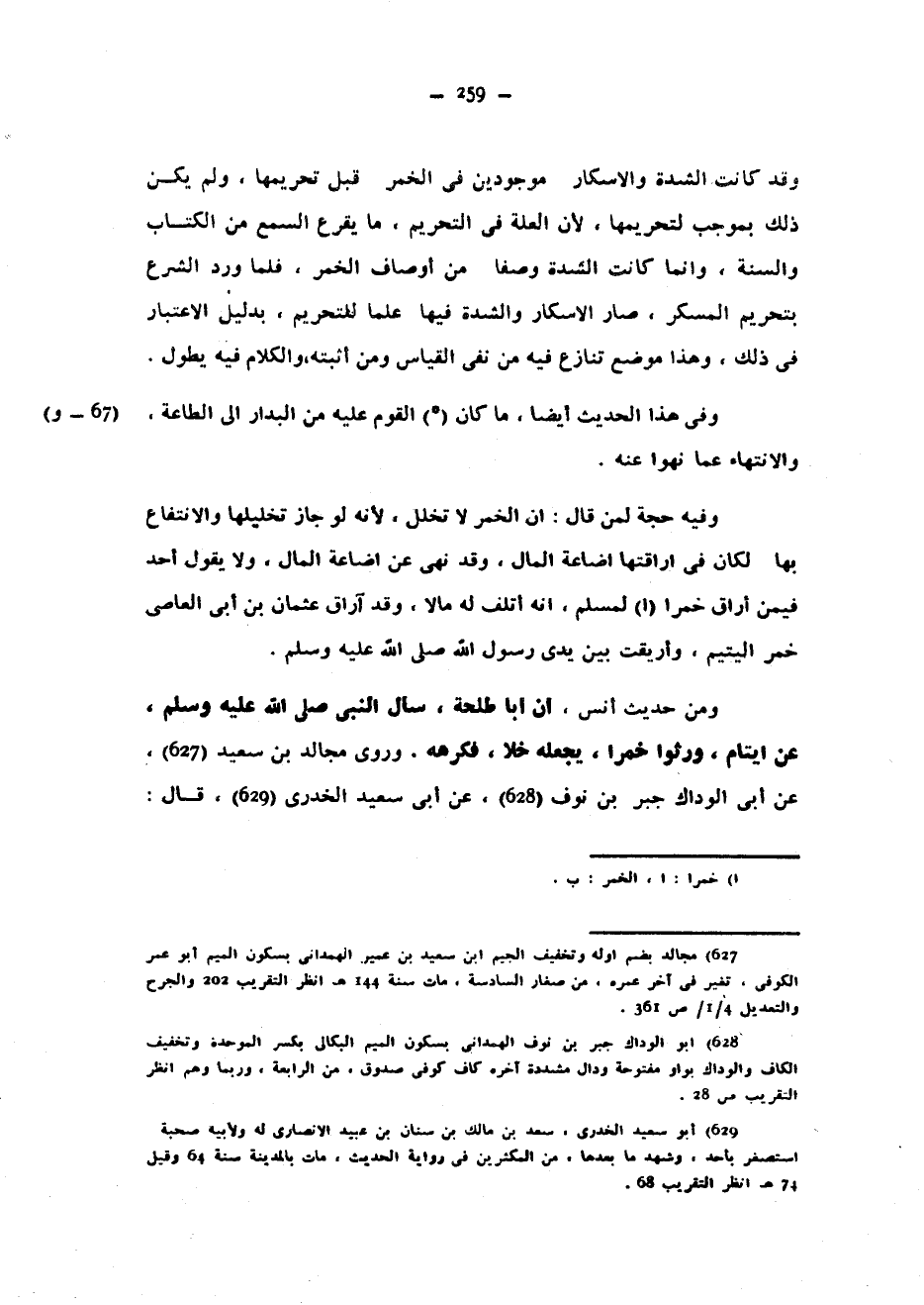 وَقَدْ كَانَتِ الشِّدَّةُ وَالْإِسْكَارُ مَوْجُودَيْنِ فِي الْخَمْرِ قَبْلَ تَحْرِيمِهَا وَلَمْ يَكُنْ ذَلِكَ بِمُوجِبٍ لِتَحْرِيمِهَا لِأَنَّ الْعِلَّةَ فِي التَّحْرِيمِ مَا يَقْرَعُ السَّمْعَ مِنَ الْكِتَابِ وَالسُّنَّةِ وَإِنَّمَا كَانَتِ الشِّدَّةُ وَصْفًا مِنْ أَوْصَافِ الْخَمْرِ فَلَمَّا وَرَدَ الشَّرْعُ بِتَحْرِيمِ الْمُسْكِرِ صَارَ الْإِسْكَارُ وَالشِّدَّةُ فِيهَا عَلَمًا لِلتَّحْرِيمِ بِدَلِيلِ الِاعْتِبَارِ فِي ذَلِكَ وَهَذَا مَوْضِعٌ تَنَازَعَ فِيهِ مَنْ نَفَى الْقِيَاسَ وَمَنْ أَثْبَتَهُ وَالْكَلَامُ فِيهِ يَطُولُ وَفِي هَذَا الْحَدِيثِ أَيْضًا مَا كَانَ (*) الْقَوْمُ عَلَيْهِ مِنَ الْبِدَارِ إِلَى الطَّاعَةِ وَالِانْتِهَاءِ عَمَّا نُهُوا عَنْهُ وَفِيهِ حُجَّةٌ لِمَنْ قَالَ إِنَّ الْخَمْرَ لَا تُخَلَّلُ لِأَنَّهُ لَوْ جَازَ تَخْلِيلُهَا وَالِانْتِفَاعُ بِهَا لَكَانَ فِي إِرَاقَتِهَا إِضَاعَةُ الْمَالِ وَقَدْ نُهِيَ عَنْ إِضَاعَةِ الْمَالِ وَلَا يَقُولُ أَحَدٌ فِيمَنْ أَرَاقَ خَمْرًا لِمُسْلِمٍ إِنَّهُ أَتْلَفَ لَهُ مَالًا وَقَدْ أَرَاقَ عُثْمَانُ بْنُ أَبِي الْعَاصِي خَمْرَ الْيَتِيمِ وَأُرِيقَتْ بَيْنَ يَدَيْ رَسُولِ اللَّهِ صَلَّى اللَّهُ عَلَيْهِ وَسَلَّمَ وَمِنْ حَدِيثِ أَنَسٍ أَنَّ أَبَا طَلْحَةَ سَأَلَ النَّبِيَّ صَلَّى اللَّهُ عَلَيْهِ وَسَلَّمَ عَنْ أَيْتَامٍ وَرِثُوا خَمْرًا يَجْعَلُهُ خَلًّا فَكَرِهَهُ وَرَوَى مُجَالِدُ بْنُ سَعِيدٍ عَنْ أَبِي الْوَدَّاكِ جَبْرِ بْنِ نَوْفٍ عَنْ أَبِي سَعِيدٍ الْخُدْرِيِّ قَالَ
