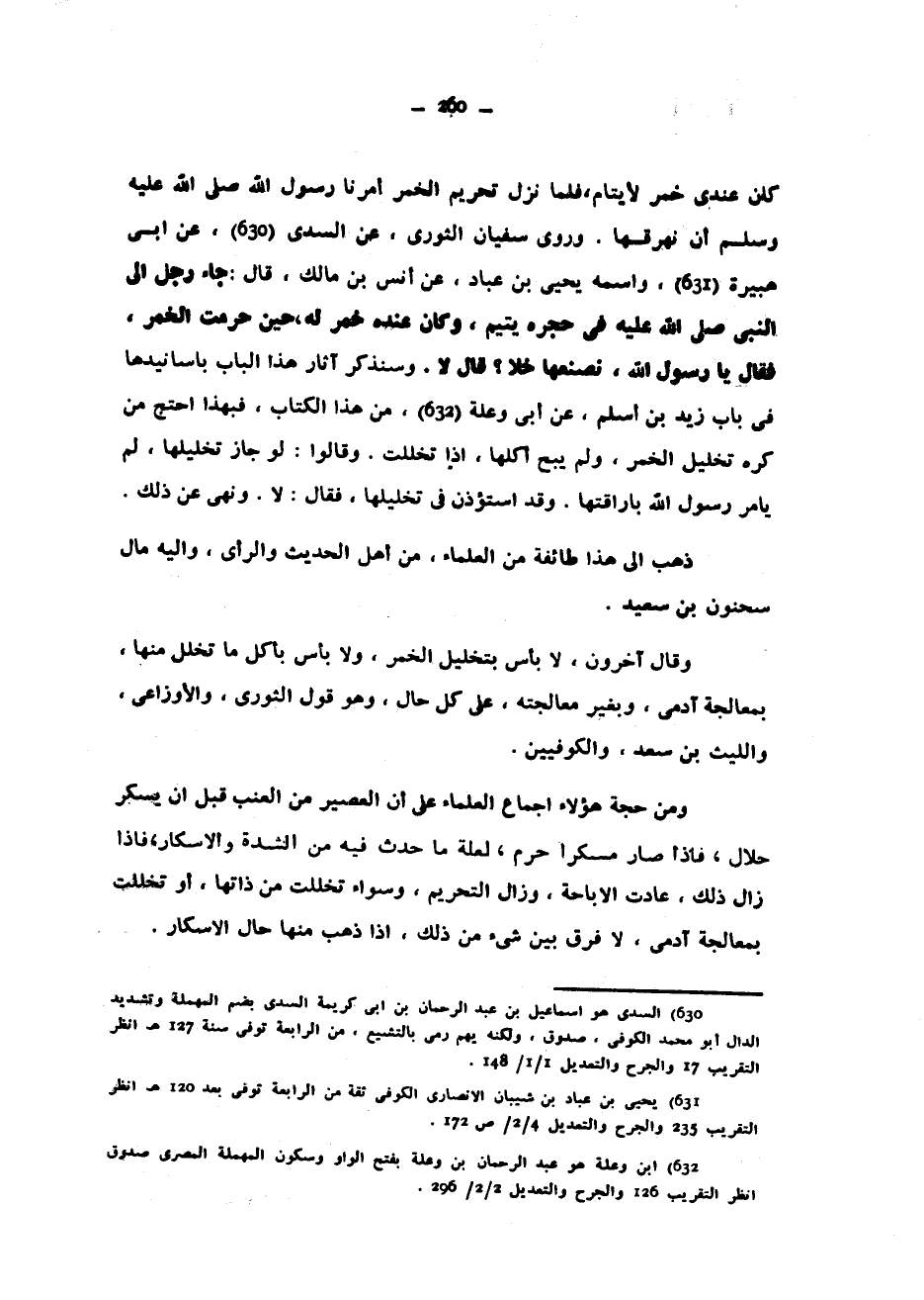 كَانَ عِنْدِي خَمْرٌ لِأَيْتَامٍ فَلَمَّا نَزَلَ تَحْرِيمُ الْخَمْرِ أَمَرَنَا رَسُولُ اللَّهِ صَلَّى اللَّهُ عَلَيْهِ وَسَلَّمَ أَنْ نُهْرِقَهَا وَرَوَى سُفْيَانُ الثَّوْرِيُّ عَنِ السُّدِّيِّ عَنْ أَبِي هُبَيْرَةَ وَاسْمُهُ يَحْيَى بْنُ عَبَّادٍ عَنْ أَنَسِ بْنِ مَالِكٍ قَالَ جَاءَ رَجُلٌ إِلَى النَّبِيِّ صَلَّى اللَّهُ عَلَيْهِ فِي حِجْرِهِ يَتِيمٌ وَكَانَ عِنْدَهُ خَمْرٌ لَهُ حِينَ حُرِّمَتِ الْخَمْرُ فَقَالَ يَا رَسُولَ اللَّهِ نَصْنَعُهَا خَلًّا قَالَ لَا وَسَنَذْكُرُ آثَارَ هَذَا الْبَابِ بِأَسَانِيدِهَا فِي بَابِ زَيْدِ بْنِ أَسْلَمَ عَنْ أَبِي وَعْلَةَ مِنْ هَذَا الْكِتَابِ فَبِهَذَا احْتَجَّ مَنْ كَرِهَ تَخْلِيلَ الْخَمْرِ وَلَمْ يُبِحْ أَكْلَهَا إِذَا تَخَلَّلَتْ وَقَالُوا لَوْ جَازَ تَخْلِيلُهَا لَمْ يَأْمُرْ رَسُولُ اللَّهِ بِإِرَاقَتِهَا وَقَدِ اسْتُؤْذِنَ فِي تَخْلِيلِهَا فَقَالَ لَا وَنَهَى عَنْ ذَلِكَ ذَهَبَ إِلَى هَذَا طَائِفَةٌ مِنَ الْعُلَمَاءِ مِنْ أَهْلِ الْحَدِيثِ وَالرَّأْيِ وَإِلَيْهِ مَالَ سَحْنُونُ بْنُ سَعِيدٍ وَقَالَ آخَرُونَ لَا بَأْسَ بِتَخْلِيلِ الْخَمْرِ وَلَا بَأْسَ بِأَكْلِ مَا تَخَلَّلَ مِنْهَا بِمُعَالَجَةِ آدَمِيٍّ وَبِغَيْرِ مُعَالَجَتِهِ عَلَى كُلِّ حَالٍ وَهُوَ قَوْلُ الثَّوْرِيِّ وَالْأَوْزَاعِيِّ وَاللَّيْثِ بْنِ سَعْدٍ وَالْكُوفِيِّينَ وَمِنْ حُجَّةِ هَؤُلَاءِ إِجْمَاعُ الْعُلَمَاءِ عَلَى أَنَّ الْعَصِيرَ مِنَ الْعِنَبِ قَبْلَ أَنْ يُسْكِرَ حَلَالٌ فَإِذَا صَارَ مُسْكِرًا حَرُمَ لِعِلَّةِ مَا حَدَثَ فِيهِ مِنَ الشِّدَّةِ وَالْإِسْكَارِ فَإِذَا زَالَ ذَلِكَ عَادَتِ الْإِبَاحَةُ وَزَالَ التَّحْرِيمُ وَسَوَاءٌ تَخَلَّلَتْ مِنْ ذَاتِهَا أَوْ تَخَلَّلَتْ بِمُعَالَجَةِ آدَمِيٍّ لَا فَرْقَ بَيْنَ شَيْءٍ مِنْ ذَلِكَ إِذَا ذَهَبَ مِنْهَا حَالَ الإسكار