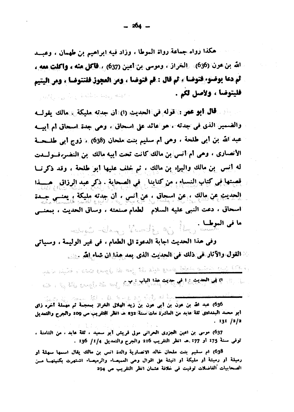 هَكَذَا رَوَاهُ جَمَاعَةُ رُوَاةِ الْمُوَطَّأِ وَزَادَ فِيهِ إِبْرَاهِيمُ بْنُ طَهْمَانَ وَعَبْدُ اللَّهِ بْنُ عَوْنٍ الْخَرَّازُ وَمُوسَى بْنُ أَعْيَنَ فَأَكَلَ مِنْهُ وَأَكَلْتُ مَعَهُ ثُمَّ دَعَا بِوَضُوءٍ فَتَوَضَّأَ ثُمَّ قَالَ قُمْ فَتَوَضَّأْ وَمُرِ الْعَجُوزَ فَلْتَتَوَضَّأْ وَمُرِ الْيَتِيمَ فَلْيَتَوَضَّأْ وَلْأُصَلِّ لَكُمْ قَالَ أَبُو عُمَرَ قَوْلُهُ فِي الْحَدِيثِ أَنَّ جَدَّتَهُ مُلَيْكَةَ مَالِكٌ يَقُولُهُ وَالضَّمِيرُ الَّذِي فِي جَدَّتِهِ هُوَ عَائِدٌ عَلَى إِسْحَاقَ وَهِيَ جَدَّةُ إِسْحَاقَ أُمُّ أَبِيهِ عَبْدِ اللَّهِ بْنِ أَبِي طَلْحَةَ وَهِيَ أُمُّ سُلَيْمٍ بِنْتُ مِلْحَانَ زَوْجُ أَبِي طَلْحَةَ الْأَنْصَارِيِّ وَهِيَ أُمُّ أَنَسِ بْنِ مَالِكٍ كَانَتْ تَحْتَ أَبِيهِ مَالِكِ بْنِ النَّضْرِ فَوَلَدَتْ لَهُ أَنَسَ بْنَ مَالِكٍ وَالْبَرَاءَ بْنَ مَالِكٍ ثُمَّ خَلَفَ عَلَيْهَا أَبُو طَلْحَةَ وَقَدْ ذَكَرْنَا قِصَّتَهَا فِي كِتَابِ النِّسَاءِ مِنْ كِتَابِنَا فِي الصَّحَابَةِ ذَكَرَ عَبْدُ الرَّزَّاقِ هَذَا الْحَدِيثَ عَنْ مَالِكٍ عَنْ إِسْحَاقَ عَنْ أَنَسٍ أَنَّ جَدَّتَهُ مُلَيْكَةَ يَعْنِي جَدَّةَ إِسْحَاقَ دَعَتِ النَّبِيَّ عَلَيْهِ السَّلَامُ لِطَعَامٍ صَنَعَتْهُ وَسَاقَ الْحَدِيثَ بِمَعْنَى مَا فِي الْمُوَطَّأِ وَفِي هَذَا الْحَدِيثِ إِجَابَةُ الدَّعْوَةِ إِلَى الطَّعَامِ فِي غَيْرِ الْوَلِيمَةِ وَسَيَأْتِي الْقَوْلُ وَالْآثَارُ فِي ذَلِكَ فِي الْحَدِيثِ الَّذِي بَعْدَ هَذَا إِنْ شَاءَ الله