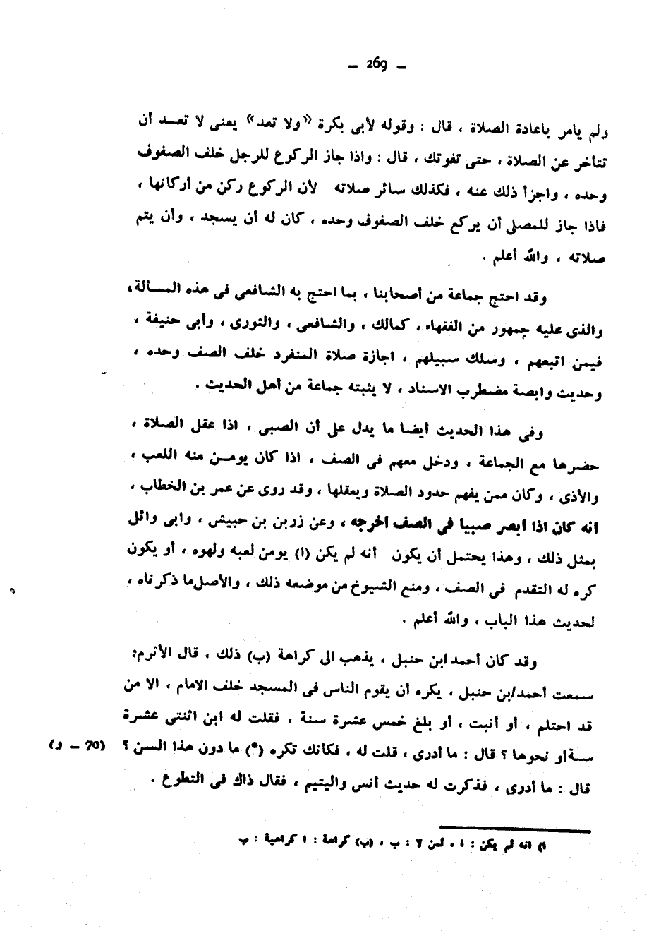 وَلَمْ يَأْمُرْ بِإِعَادَةِ الصَّلَاةِ قَالَ وَقَوْلُهُ لِأَبِي بَكْرَةَ وَلَا تَعُدْ يَعْنِي لَا تَعُدْ أَنْ تَتَأَخَّرَ عَنِ الصَّلَاةِ حَتَّى تَفُوتَكَ قَالَ وَإِذَا جَازَ الرُّكُوعُ لِلرَّجُلِ خَلْفَ الصُّفُوفِ وَحْدَهُ وَأَجْزَأَ ذَلِكَ عَنْهُ فَكَذَلِكَ سَائِرُ صَلَاتِهِ لِأَنَّ الرُّكُوعَ ركن من أركانها فإذا جاز للمصلى أن يركع خَلْفَ الصُّفُوفِ وَحْدَهُ كَانَ لَهُ أَنْ يَسْجُدَ وَأَنْ يُتِمَّ صَلَاتَهُ وَاللَّهُ أَعْلَمُ وَقَدِ احْتَجَّ جَمَاعَةٌ مِنْ أَصْحَابِنَا بِمَا احْتَجَّ بِهِ الشَّافِعِيُّ فِي هَذِهِ الْمَسْأَلَةِ وَالَّذِي عَلَيْهِ جُمْهُورٌ مِنَ الْفُقَهَاءِ كَمَالِكٍ وَالشَّافِعِيِّ وَالثَّوْرِيِّ وَأَبِي حَنِيفَةَ فِيمَنِ اتَّبَعَهُمْ وَسَلَكَ سَبِيلَهُمْ إِجَازَةُ صَلَاةِ الْمُنْفَرِدِ خَلْفَ الصَّفِّ وَحْدَهُ وَحَدِيثُ وَابِصَةَ مُضْطَرِبُ الْإِسْنَادِ لَا يُثْبِتُهُ جَمَاعَةٌ مِنْ أَهْلِ الْحَدِيثِ وَفِي هَذَا الْحَدِيثِ أَيْضًا مَا يَدُلُّ عَلَى أَنَّ الصَّبِيَّ إِذَا عَقَلَ الصَّلَاةَ حَضَرَهَا مَعَ الْجَمَاعَةِ وَدَخَلَ مَعَهُمْ فِي الصَّفِّ إِذَا كَانَ يُؤْمَنُ مِنْهُ اللَّعِبُ وَالْأَذَى وَكَانَ مِمَّنْ يَفْهَمُ حُدُودَ الصَّلَاةِ وَيَعْقِلُهَا وَقَدْ رُوِيَ عَنْ عُمَرَ بْنِ الْخَطَّابِ أَنَّهُ كَانَ إِذَا أَبْصَرَ صَبِيًّا فِي الصَّفِّ أَخْرَجَهُ وَعَنْ زِرِّ بْنِ حُبَيْشٍ وَأَبِي وَائِلٍ بِمِثْلِ ذَلِكَ وَهَذَا يُحْتَمَلُ أَنْ يَكُونَ أَنَّهُ لَمْ يَكُنْ يُؤْمَنُ لَعِبُهُ وَلَهْوُهُ أَوْ يَكُونَ كَرِهَ لَهُ التَّقَدُّمَ فِي الصَّفِّ وَمَنْعَ الشُّيُوخِ مِنْ مَوْضِعِهِ ذَلِكَ وَالْأَصْلُ مَا ذَكَرْنَاهُ لِحَدِيثِ هَذَا الْبَابِ وَاللَّهُ أَعْلَمُ وَقَدْ كَانَ أَحْمَدُ بْنُ حَنْبَلٍ يَذْهَبُ إِلَى كَرَاهَةِ ذَلِكَ قَالَ الْأَثْرَمُ سَمِعْتُ أَحْمَدَ بْنَ حَنْبَلٍ يَكْرَهُ أَنْ يَقُومَ النَّاسُ فِي الْمَسْجِدِ خَلْفَ الْإِمَامِ إِلَّا مَنْ قَدِ احْتَلَمَ أَوْ أَنْبَتَ أَوْ بَلَغَ خَمْسَ عَشْرَةَ سَنَةً فَقُلْتُ لَهُ ابْنُ اثْنَتَيْ عَشْرَةَ سَنَةً أَوْ نَحْوَهَا قَالَ مَا أَدْرِي قُلْتُ لَهُ فَكَأَنَّكَ تَكْرَهُ (*) مَا دُونُ هَذَا السِّنِّ قَالَ مَا أَدْرِي فَذَكَرْتُ لَهُ حَدِيثَ أَنَسٍ وَالْيَتِيمِ فَقَالَ ذَاكَ فِي التَّطَوُّعِ