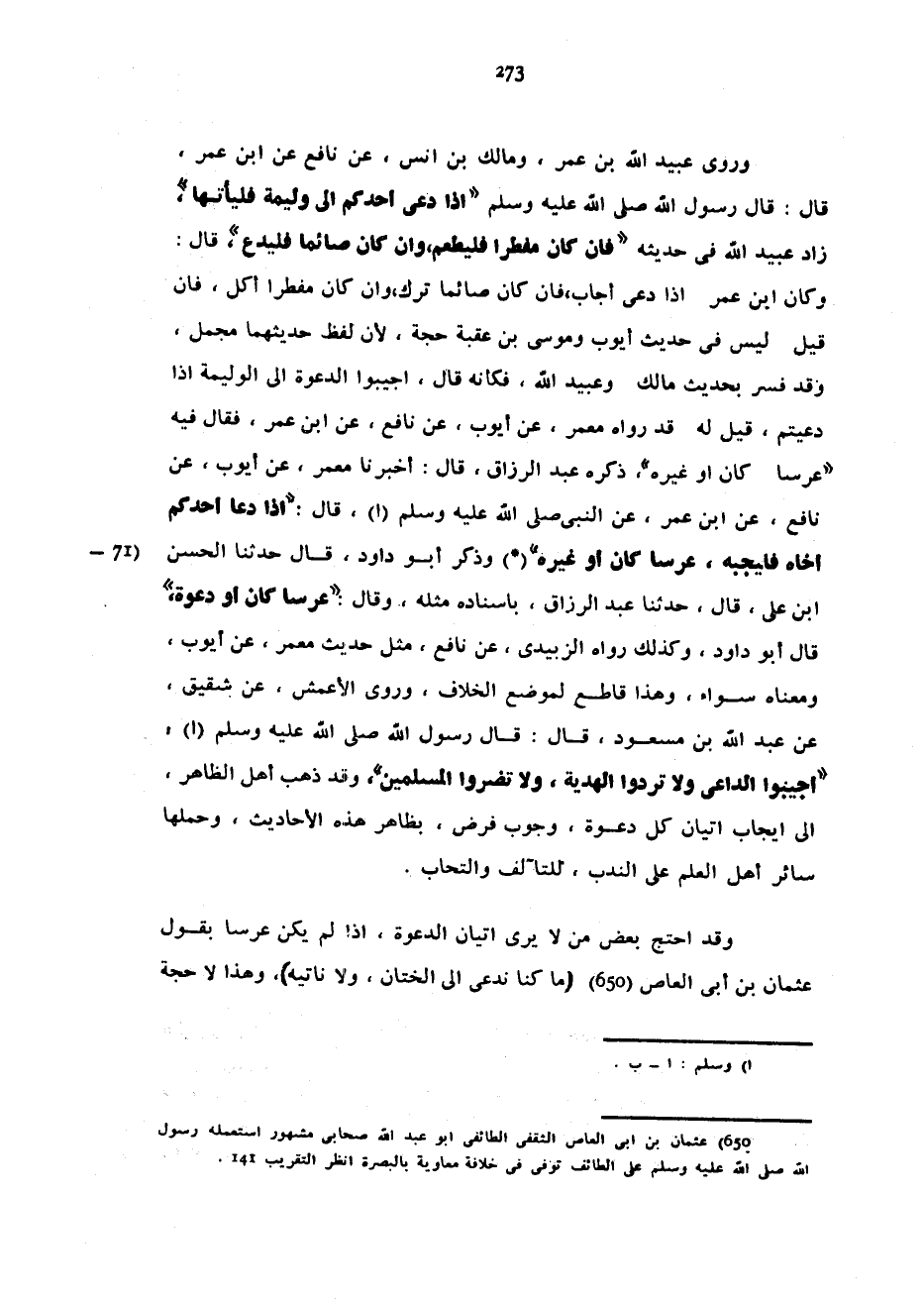 وَرَوَى عُبَيْدُ اللَّهِ بْنُ عُمَرَ وَمَالِكُ بْنُ أَنَسٍ عَنْ نَافِعٍ عَنِ ابْنِ عُمَرَ قَالَ قَالَ رَسُولُ اللَّهِ صَلَّى اللَّهُ عَلَيْهِ وسلم إِذَا دُعِيَ أَحَدُكُمْ إِلَى وَلِيمَةٍ فَلْيَأْتِهَا زَادَ عُبَيْدُ اللَّهِ فِي حَدِيثِهِ فَإِنْ كَانَ مُفْطِرًا فَلْيَطْعَمْ وَإِنْ كَانَ صَائِمًا فَلْيَدْعُ قَالَ وَكَانَ ابْنُ عُمَرَ إِذَا دُعِيَ أَجَابَ فَإِنْ كَانَ صَائِمًا تَرَكَ وَإِنْ كَانَ مُفْطِرًا أَكَلَ فَإِنْ قِيلَ لَيْسَ فِي حَدِيثِ أَيُّوبَ وَمُوسَى بْنِ عُقْبَةَ حُجَّةٌ لِأَنَّ لَفْظَ حَدِيثِهِمَا مُجْمَلٌ وَقَدْ فُسِّرَ بِحَدِيثِ مَالِكٍ وَعُبَيْدِ اللَّهِ فَكَأَنَّهُ قَالَ أَجِيبُوا الدَّعْوَةَ إِلَى الْوَلِيمَةِ إِذَا دُعِيتُمْ قِيلَ لَهُ قَدْ رَوَاهُ مَعْمَرٌ عَنْ أَيُّوبَ عَنْ نَافِعٍ عَنِ ابْنِ عُمَرَ فَقَالَ فِيهِ عُرْسًا كَانَ أَوْ غَيْرَهُ ذَكَرَهُ عَبْدُ الرَّزَّاقِ قَالَ أَخْبَرَنَا مَعْمَرٌ عَنْ أَيُّوبَ عَنْ نَافِعٍ عَنِ ابْنِ عُمَرَ عَنِ النَّبِيِّ صَلَّى اللَّهُ عَلَيْهِ وَسَلَّمَ قَالَ إِذَا دَعَا أَحَدُكُمْ أَخَاهُ فَلْيُجِبْهُ عُرْسًا كَانَ أَوْ غَيْرَهُ (*) وَذَكَرَ أَبُو دَاوُدَ قال حدثنا الحسن ابن عَلِيٍّ قَالَ حَدَّثَنَا عَبْدُ الرَّزَّاقِ بِإِسْنَادِهِ مِثْلَهُ وَقَالَ عُرْسًا كَانَ أَوْ دَعْوَةً قَالَ أَبُو دَاوُدَ وَكَذَلِكَ رَوَاهُ الزَّبِيدِيُّ عَنْ نَافِعٍ مِثْلَ حَدِيثِ مَعْمَرٍ عَنْ أَيُّوبَ وَمَعْنَاهُ سَوَاءٌ وَهَذَا قَاطِعٌ لِمَوْضِعِ الْخِلَافِ وَرَوَى الْأَعْمَشُ عَنْ شَقِيقٍ عَنْ عَبْدِ اللَّهِ بْنِ مَسْعُودٍ قَالَ قَالَ رَسُولُ اللَّهِ صَلَّى اللَّهُ عليه وسلم أجيبوا الدَّاعِيَ وَلَا تَرُدُّوا الْهَدِيَّةَ وَلَا تَضُرُّوا الْمُسْلِمِينَ وَقَدْ ذَهَبَ أَهْلُ الظَّاهِرِ إِلَى إِيجَابِ إِتْيَانِ كُلِّ دَعْوَةٍ وُجُوبَ فَرْضٍ بِظَاهِرِ هَذِهِ الْأَحَادِيثِ وَحَمَلَهَا سَائِرُ أَهْلِ الْعِلْمِ عَلَى النَّدْبِ لِلتَّآلُفِ والتحاب وقد احتج بعض من لايرى إِتْيَانَ الدَّعْوَةِ إِذَا لَمْ يَكُنْ عُرْسًا بِقَوْلِ عُثْمَانَ بْنِ أَبِي الْعَاصِ مَا كُنَّا نُدْعَى إِلَى الْخِتَانِ وَلَا نَأْتِيهِ وَهَذَا لَا حُجَّةَ
