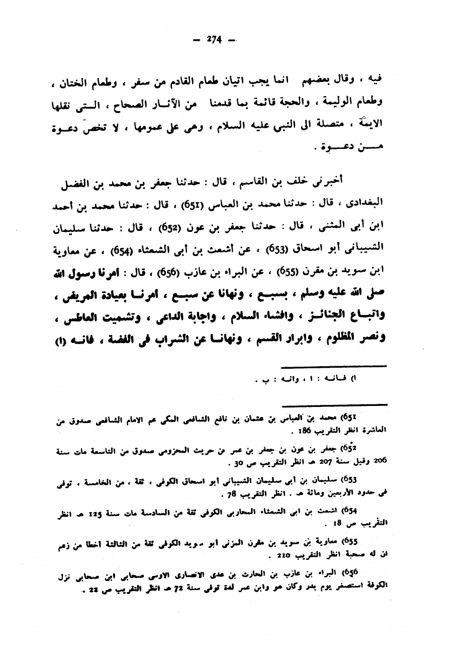 فِيهِ وَقَالَ بَعْضُهُمْ إِنَّمَا يَجِبُ إِتْيَانُ طَعَامِ الْقَادِمِ مِنْ سَفَرٍ وَطَعَامِ الْخِتَانِ وَطَعَامِ الْوَلِيمَةِ والحجة قائمة بما قدما من آثار الصحاح التي نقلها الأيمة مُتَّصِلَةً إِلَى النَّبِيِّ عَلَيْهِ السَّلَامُ وَهِيَ عَلَى عُمُومِهَا لَا تَخُصُّ دَعْوَةً مِنْ دَعْوَةٍ أَخْبَرَنِي خَلَفُ بْنُ الْقَاسِمِ قَالَ حَدَّثَنَا جَعْفَرُ بْنُ مُحَمَّدِ بْنِ الْفَضْلِ الْبَغْدَادِيُّ قَالَ حَدَّثَنَا مُحَمَّدُ بْنُ الْعَبَّاسِ قَالَ حَدَّثَنَا مُحَمَّدُ بْنُ أَحْمَدَ ابن أَبِي الْمُثَنَّى قَالَ حَدَّثَنَا جَعْفَرُ بْنُ عَوْنٍ قَالَ حَدَّثَنَا سُلَيْمَانُ الشَّيْبَانِيُّ أَبُو إِسْحَاقَ عَنْ أَشْعَثَ بْنِ أَبِي الشَّعْثَاءِ عَنْ مُعَاوِيَةَ ابن سُوَيْدِ بْنِ مُقَرِّنٍ عَنِ الْبَرَاءِ بْنِ عَازِبٍ قَالَ أَمَرَنَا رَسُولُ اللَّهِ صَلَّى اللَّهُ عَلَيْهِ وَسَلَّمَ بِسَبْعٍ وَنَهَانَا عَنْ سَبْعٍ أَمَرَنَا بِعِيَادَةِ الْمَرِيضِ وَاتِّبَاعِ الْجَنَائِزِ وَإِفْشَاءِ السَّلَامِ وَإِجَابَةِ الدَّاعِي وَتَشْمِيتِ الْعَاطِسِ وَنَصْرِ الْمَظْلُومِ وَإِبْرَارِ الْقَسَمِ وَنَهَانَا عَنِ الشَّرَابِ فِي الْفِضَّةِ فَإِنَّهُ