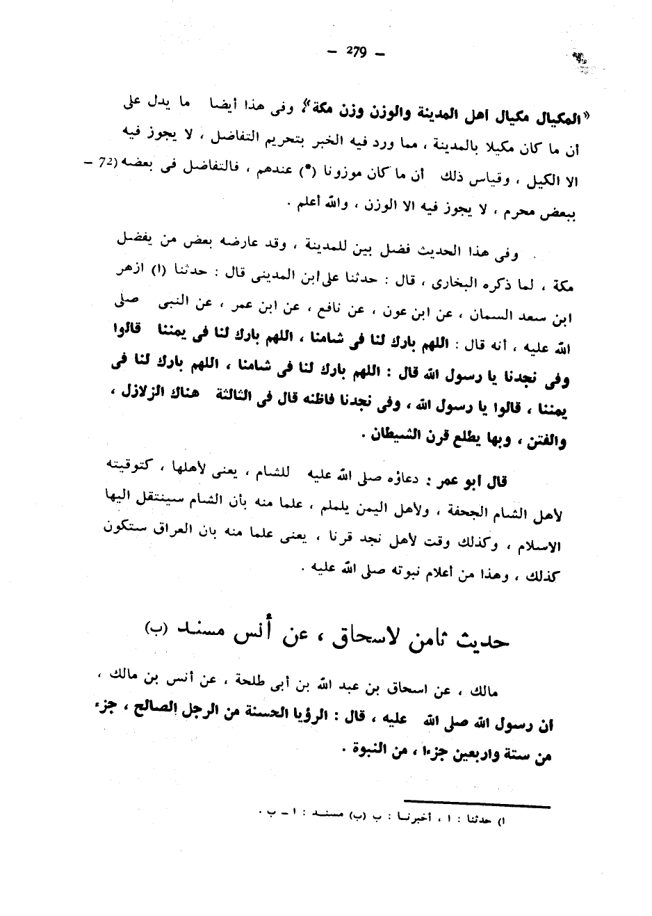 الْمِكْيَالُ مِكْيَالُ أَهْلِ الْمَدِينَةِ وَالْوَزْنُ وَزْنُ مَكَّةَ وَفِي هَذَا أَيْضًا مَا يَدُلُّ عَلَى أَنَّ مَا كَانَ مَكِيلًا بِالْمَدِينَةِ مِمَّا وَرَدَ فِيهِ الْخَبَرُ بِتَحْرِيمِ التَّفَاضُلِ لَا يَجُوزُ فِيهِ إِلَّا الْكَيْلُ وَقِيَاسُ ذَلِكَ أَنَّ مَا كَانَ مَوْزُونًا (*) عِنْدَهُمْ فَالتَّفَاضُلُ فِي بَعْضِهِ بِبَعْضٍ مُحَرَّمٌ لَا يَجُوزُ فِيهِ إِلَّا الْوَزْنُ وَاللَّهُ أَعْلَمُ وَفِي هَذَا الْحَدِيثِ فَضْلٌ بَيِّنٌ لِلْمَدِينَةِ وَقَدْ عَارَضَهُ بَعْضُ مَنْ يُفَضِّلُ مَكَّةَ لِمَا ذَكَرَهُ الْبُخَارِيُّ قَالَ حَدَّثَنَا عَلِيُّ ابْنُ الْمَدِينِيِّ قَالَ حَدَّثَنَا ازهر ابن سَعْدٍ السَّمَّانُ عَنِ ابْنِ عَوْنٍ عَنْ نَافِعٍ عَنِ ابْنِ عُمَرَ عَنِ النَّبِيِّ صَلَّى اللَّهُ عَلَيْهِ وَسَلَّمَ أَنَّهُ قَالَ اللَّهُمَّ بَارِكْ لَنَا فِي شَامِنَا اللَّهُمَّ بَارِكْ لَنَا فِي يَمَنِنَا قَالُوا وَفِي نَجْدِنَا يَا رَسُولَ اللَّهِ قَالَ اللَّهُمَّ بَارِكْ لَنَا فِي شَامِنَا اللَّهُمَّ بَارِكْ لَنَا فِي يَمَنِنَا قَالُوا يَا رَسُولَ اللَّهِ وَفِي نَجْدِنَا فَأَظُنُّهُ قَالَ فِي الثَّالِثَةِ هُنَاكَ الزَّلَازِلُ وَالْفِتَنُ وَبِهَا يَطْلُعُ قَرْنُ الشَّيْطَانِ قَالَ أَبُو عُمَرَ دعاؤه صلى الله عليه وسلم لِلشَّامِ يَعْنِي لِأَهْلِهَا كَتَوْقِيتِهِ لِأَهْلِ الشَّامِ الْجُحْفَةَ وَلِأَهْلِ الْيَمَنِ يَلَمْلَمَ عِلْمًا مِنْهُ بِأَنَّ الشَّامَ سَيَنْتَقِلُ إِلَيْهَا الْإِسْلَامُ وَكَذَلِكَ وَقَّتَ لِأَهْلِ نَجْدٍ قَرْنًا يَعْنِي عِلْمًا مِنْهُ بِأَنَّ الْعِرَاقَ سَتَكُونُ كَذَلِكَ وَهَذَا مِنْ أَعْلَامِ نُبُوَّتِهِ صَلَّى اللَّهُ عَلَيْهِ وَسَلَّمَ