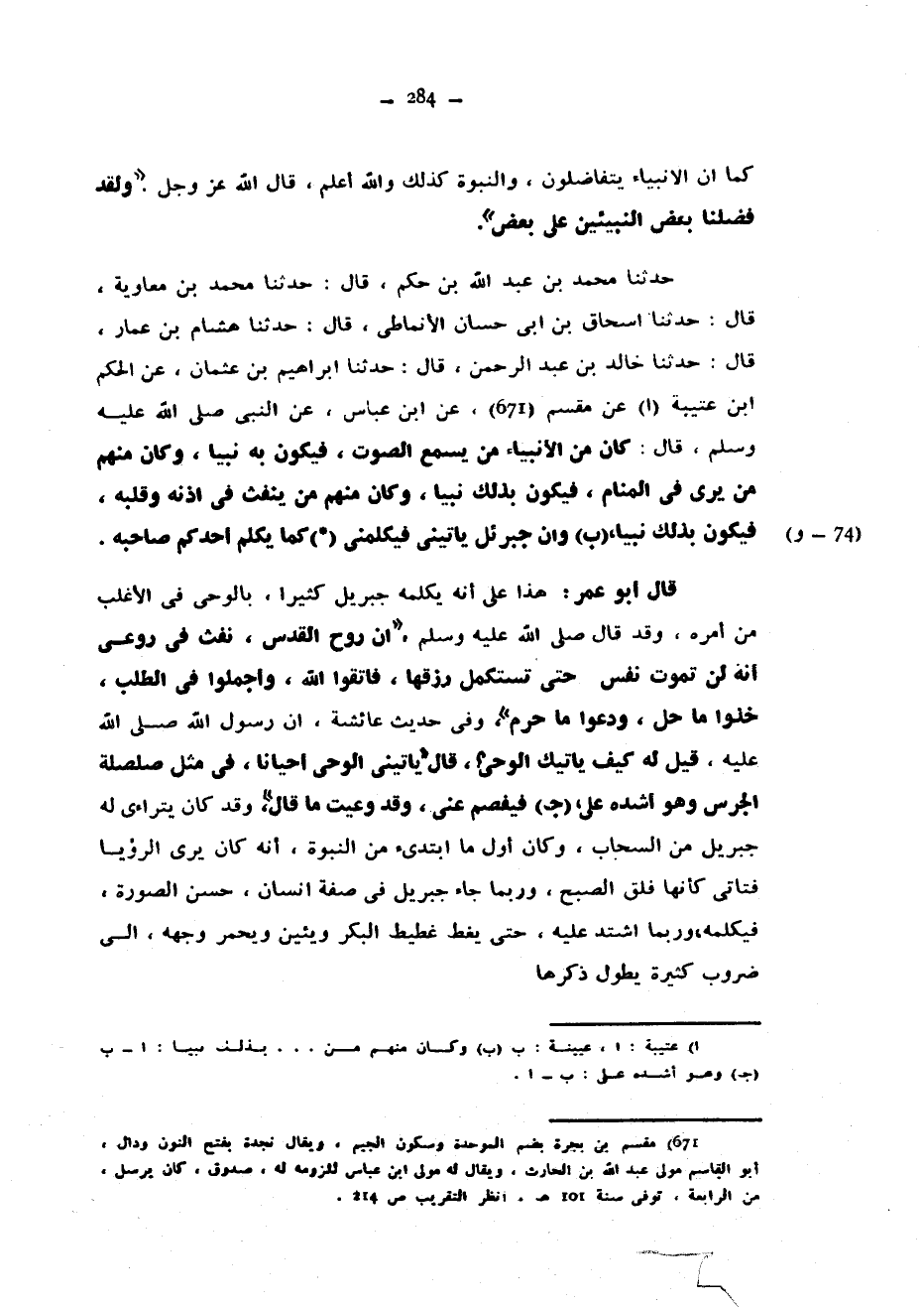 كَمَا أَنَّ الْأَنْبِيَاءَ يَتَفَاضَلُونَ وَالنُّبُوَّةُ كَذَلِكَ وَاللَّهُ أَعْلَمُ قَالَ اللَّهُ عَزَّ وَجَلَّ وَلَقَدْ فَضَّلْنَا بَعْضَ النَّبِيِّينَ عَلَى بَعْضٍ حَدَّثَنَا مُحَمَّدُ بْنُ عَبْدِ اللَّهِ بْنِ حَكَمٍ قَالَ حَدَّثَنَا مُحَمَّدُ بْنُ مُعَاوِيَةَ قَالَ حَدَّثَنَا إِسْحَاقُ بْنُ أَبِي حَسَّانَ الْأَنْمَاطِيُّ قَالَ حَدَّثَنَا هِشَامُ بْنُ عَمَّارٍ قَالَ حَدَّثَنَا خَالِدُ بْنُ عَبْدِ الرَّحْمَنِ قَالَ حدثنا إبراهيم بن عثمان عن الحكم ابن عُتَيْبَةَ عَنْ مِقْسَمٍ عَنِ ابْنِ عَبَّاسٍ عَنِ النَّبِيِّ صَلَّى اللَّهُ عَلَيْهِ وَسَلَّمَ قَالَ كَانَ مِنَ الْأَنْبِيَاءِ مَنْ يَسْمَعُ الصَّوْتَ فَيَكُونُ بِهِ نَبِيًّا وَكَانَ مِنْهُمْ مَنْ يَرَى فِي الْمَنَامِ فَيَكُونُ بِذَلِكَ نَبِيًّا وَكَانَ مِنْهُمْ مَنْ يُنْفَثُ فِي أُذُنِهِ وَقَلْبِهِ فَيَكُونُ بِذَلِكَ نَبِيًّا وَإِنَّ جبرئيل يَأْتِينِي فَيُكَلِّمُنِي (*) كَمَا يُكَلِّمُ أَحَدُكُمْ صَاحِبَهُ قَالَ أَبُو عُمَرَ هَذَا عَلَى أَنَّهُ يُكَلِّمُهُ جِبْرِيلُ كَثِيرًا بِالْوَحْيِ فِي الْأَغْلَبِ مِنْ أَمْرِهِ وَقَدْ قَالَ صَلَّى اللَّهُ عَلَيْهِ وَسَلَّمَ إِنَّ رُوحَ الْقُدُسِ نَفَثَ فِي رُوعِي أَنَّهُ لَنْ تَمُوتَ نَفْسٌ حَتَّى تَسْتَكْمِلَ رِزْقَهَا فَاتَّقُوا اللَّهَ وَأَجْمِلُوا فِي الطَّلَبِ خُذُوا مَا حَلَّ وَدَعُوا مَا حَرُمَ وَفِي حَدِيثِ عَائِشَةَ أَنَّ رَسُولَ اللَّهِ صَلَّى اللَّهُ عَلَيْهِ وسلم قِيلَ لَهُ كَيْفَ يَأْتِيكَ الْوَحْيُ قَالَ يَأْتِينِي الْوَحْيُ أَحْيَانًا فِي مِثْلِ صَلْصَلَةِ الْجَرَسِ وَهُوَ أَشَدُّهُ عَلَيَّ فَيَفْصِمُ عَنِّي وَقَدْ وَعَيْتُ مَا قَالَ وَقَدْ كَانَ يَتَرَاءَى لَهُ جِبْرِيلُ مِنَ السَّحَابِ وَكَانَ أَوَّلُ مَا ابْتُدِئَ مِنَ النُّبُوَّةِ أَنَّهُ كَانَ يَرَى الرُّؤْيَا فَتَأْتِي كَأَنَّهَا فَلَقُ الصُّبْحِ وَرُبَّمَا جَاءَ جِبْرِيلُ فِي صِفَةِ إِنْسَانٍ حَسَنِ الصُّورَةِ فَيُكَلِّمُهُ وَرُبَّمَا اشْتَدَّ عَلَيْهِ حَتَّى يَغُطَّ غَطِيطَ الْبِكْرِ وَيَئِينَ وَيَحْمَرَّ وَجْهُهُ إِلَى ضُرُوبٍ كَثِيرَةٍ يَطُولُ ذِكْرُهَا