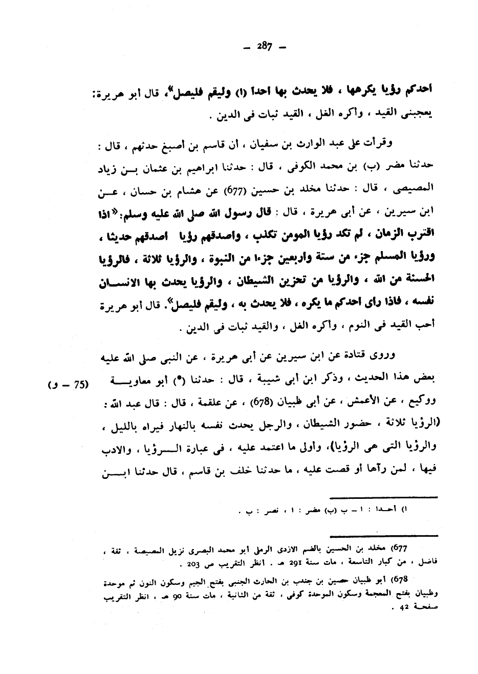 أَحَدُكُمْ رُؤْيَا يَكْرَهُهَا فَلَا يُحَدِّثْ بِهَا أَحَدًا وَلْيَقُمْ فَلْيُصَلِّ قَالَ أَبُو هُرَيْرَةَ يُعْجِبُنِي الْقَيْدُ وأكرهه الْغَلَّ الْقَيْدُ ثَبَاتٌ فِي الدِّينِ وَقَرَأْتُ عَلَى عَبْدِ الْوَارِثِ بْنِ سُفْيَانَ أَنَّ قَاسِمَ بْنَ أَصْبَغَ حَدَّثَهُمْ قَالَ حَدَّثَنَا مُضَرُ بْنُ مُحَمَّدٍ الْكُوفِيُّ قَالَ حَدَّثَنَا إِبْرَاهِيمُ بْنُ عُثْمَانَ بْنِ زِيَادٍ الْمِصِّيصِيُّ قَالَ حَدَّثَنَا مَخْلَدُ بْنُ حُسَيْنٍ عَنْ هِشَامِ بْنِ حَسَّانَ عَنِ ابْنِ سِيرِينَ عَنْ أَبِي هُرَيْرَةَ قَالَ قَالَ رَسُولُ اللَّهِ صَلَّى اللَّهُ عَلَيْهِ وَسَلَّمَ إِذَا اقْتَرَبَ الزَّمَانُ لم تكد رؤيا المؤمن تَكْذِبُ وَأَصْدَقُهُمْ رُؤْيَا أَصْدَقُهُمْ حَدِيثًا وَرُؤْيَا الْمُسْلِمِ جُزْءٌ مِنْ سِتَّةٍ وَأَرْبَعِينَ جُزْءًا مِنَ النُّبُوَّةِ وَالرُّؤْيَا ثَلَاثَةٌ فَالرُّؤْيَا الْحَسَنَةُ مِنَ اللَّهِ وَالرُّؤْيَا مِنْ تَحْزِينِ الشَّيْطَانِ وَالرُّؤْيَا يُحَدِّثُ بِهَا الْإِنْسَانُ نَفْسَهُ فَإِذَا رَأَى أَحَدُكُمْ مَا يَكْرَهُ فَلَا يُحَدِّثْ بِهِ وَلْيَقُمْ فَلْيُصَلِّ قَالَ أَبُو هُرَيْرَةَ احب القيد في النوم واكرهه الْغَلَّ وَالْقَيْدُ ثَبَاتٌ فِي الدِّينِ وَرَوَى قَتَادَةُ عَنِ ابْنِ سِيرِينَ عَنْ أَبِي هُرَيْرَةَ عَنِ النَّبِيِّ صَلَّى اللَّهُ عَلَيْهِ وَسَّلَمَ بَعْضَ هَذَا الْحَدِيثِ وَذَكَرَ ابْنُ أَبِي شَيْبَةَ قَالَ حَدَّثَنَا (*) أَبُو مُعَاوِيَةَ وَوَكِيعٌ عَنِ الْأَعْمَشِ عَنْ أَبِي ظَبْيَانَ عَنْ عَلْقَمَةَ قَالَ قَالَ عَبْدُ اللَّهِ (الرُّؤْيَا ثَلَاثَةٌ حُضُورُ الشَّيْطَانِ وَالرَّجُلُ يُحَدِّثُ نَفْسَهُ بِالنَّهَارِ فَيَرَاهُ بِاللَّيْلِ وَالرُّؤْيَا الَّتِي هِيَ الرُّؤْيَا) وَأَوْلَى مَا اعْتُمِدَ عَلَيْهِ فِي عِبَارَةِ الرُّؤْيَا وَالْأَدَبِ فِيهَا لِمَنْ رَآهَا أَوْ قُصَّتْ عَلَيْهِ مَا حَدَّثَنَا خَلَفُ بْنُ قَاسِمٍ قَالَ حَدَّثَنَا ابْنُ