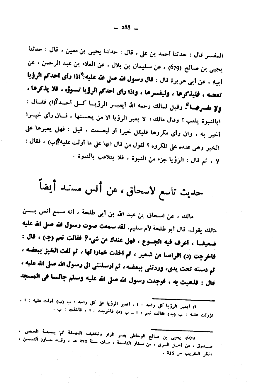 الْمُفَسِّرِ قَالَ حَدَّثَنَا أَحْمَدُ بْنُ عَلِيٍّ قَالَ حَدَّثَنَا يَحْيَى بْنُ مَعِينٍ قَالَ حَدَّثَنَا يَحْيَى بْنُ صَالِحٍ عَنْ سُلَيْمَانَ بْنِ بِلَالٍ عَنِ الْعَلَاءِ بْنِ عَبْدِ الرَّحْمَنِ عَنْ أَبِيهِ عَنْ أَبِي هُرَيْرَةَ قَالَ قَالَ رَسُولُ اللَّهِ إِذَا رَأَى أَحَدُكُمُ الرُّؤْيَا تُعْجِبُهُ فَلْيَذْكُرْهَا وَلْيُفَسِّرْهَا وإذا رأى أحدكم الرؤيا تسوؤه فَلَا يَذْكُرْهَا وَلَا يُفَسِّرْهَا وَقِيلَ لِمَالِكٍ رَحِمَهُ اللَّهُ أَيَعْبُرُ الرُّؤْيَا كُلُّ أَحَدٍ فَقَالَ أَبِالنُّبُوَّةِ يُلْعَبُ وَقَالَ مَالِكٌ لَا يَعْبُرُ الرُّؤْيَا إِلَّا مَنْ يُحْسِنُهَا فَإِنْ رَأَى خَيْرًا أَخْبَرَ بِهِ وَإِنْ رَأَى مَكْرُوهًا فَلْيَقُلْ خَيْرًا أَوْ لِيَصْمُتْ قِيلَ فَهَلْ يَعْبُرُهَا عَلَى الْخَيْرِ وَهِيَ عِنْدَهُ عَلَى الْمَكْرُوهِ لِقَوْلِ مَنْ قَالَ إِنَّهَا عَلَى مَا أُوِّلَتْ عَلَيْهِ فَقَالَ لَا ثُمَّ قَالَ الرُّؤْيَا جُزْءٌ مِنَ النُّبُوَّةِ فَلَا يُتَلَاعَبُ بِالنُّبُوَّةِ