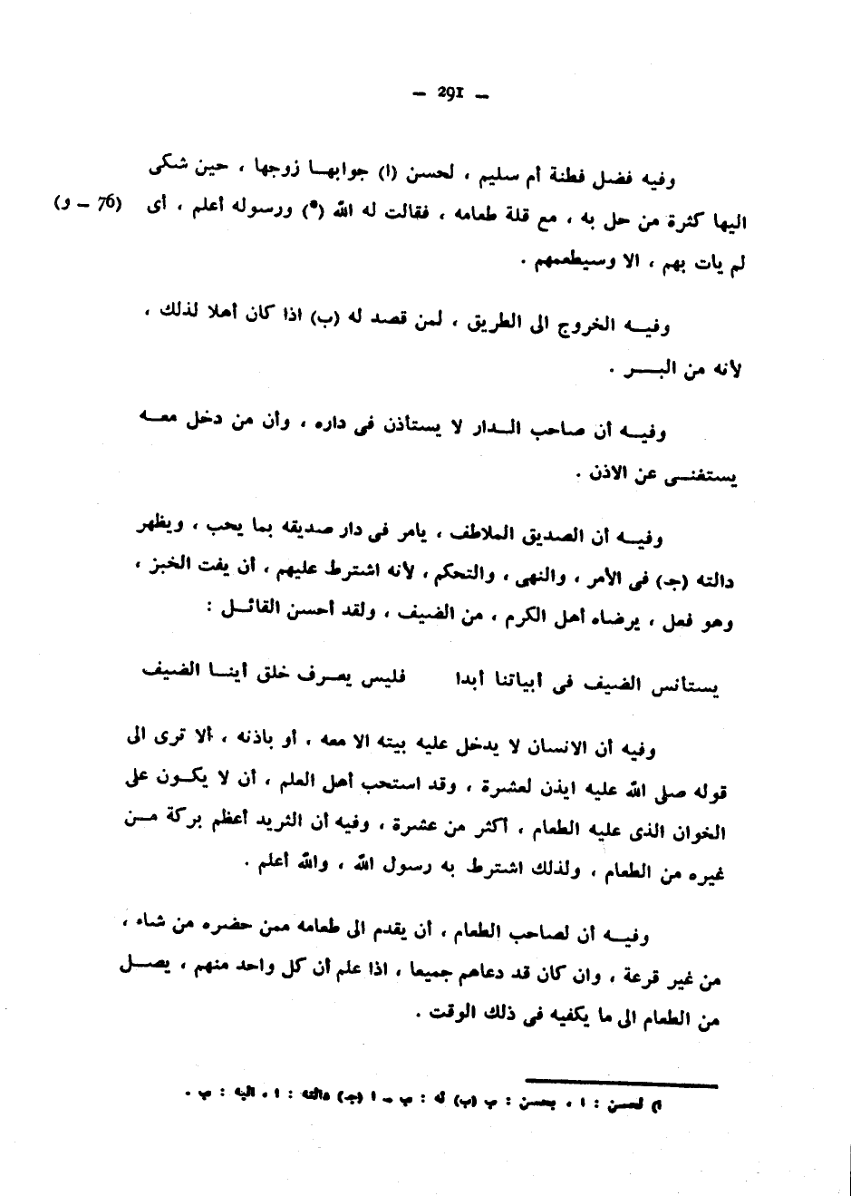وَفِيهِ فَضْلُ فِطْنَةِ أُمِّ سُلَيْمٍ لِحُسْنِ جَوَابِهَا زَوْجَهَا حِينَ شَكَى إِلَيْهَا كَثْرَةَ مَنْ حَلَّ بِهِ مَعَ قِلَّةِ طَعَامِهِ فَقَالَتْ لَهُ اللَّهُ (*) وَرَسُولُهُ أَعْلَمُ أَيْ لَمْ يَأْتِ بِهِمْ إِلَّا وَسَيُطْعِمُهُمْ وَفِيهِ الْخُرُوجُ إِلَى الطَّرِيقِ لِمَنْ قَصَدَ لَهُ إِذَا كَانَ أَهْلًا لِذَلِكَ لِأَنَّهُ مِنَ الْبِرِّ وَفِيهِ أَنَّ صَاحِبَ الدَّارِ لَا يُسْتَأْذَنُ فِي دَارِهِ وَأَنَّ مَنْ دَخَلَ مَعَهُ يَسْتَغْنِي عَنِ الْإِذْنِ وَفِيهِ أَنَّ الصَّدِيقَ الْمُلَاطِفَ يَأْمُرُ فِي دَارِ صَدِيقِهِ بِمَا يُحِبُّ وَيُظْهِرُ دَالَّتَهُ فِي الْأَمْرِ وَالنَّهْيِ وَالتَّحَكُّمِ لِأَنَّهُ اشْتَرَطَ عَلَيْهِمْ أَنْ يَفُتَّ الْخُبْزَ وَهُوَ فِعْلٌ يَرْضَاهُ أَهْلُ الْكَرَمِ مِنَ الضَّيْفِ وَلَقَدْ أَحْسَنَ الْقَائِلُ ... يَسْتَأْنِسُ الضَّيْفُ فِي أَبْيَاتِنَا أَبَدًا ... فَلَيْسَ يَعْرِفُ خَلْقٌ أَيَّنَا الضَّيْفُ ... وَفِيهِ أَنَّ الْإِنْسَانَ لَا يُدْخَلُ عَلَيْهِ بَيْتُهُ إِلَّا مَعَهُ أَوْ بِإِذْنِهِ أَلَا تَرَى إِلَى قَوْلِهِ صَلَّى اللَّهُ عَلَيْهِ وَسَلَّمَ إِيذَنْ لِعَشَرَةٍ وَقَدِ اسْتَحَبَّ أَهْلُ الْعِلْمِ أَنْ لَا يَكُونَ عَلَى الْخِوَانِ الَّذِي عَلَيْهِ الطَّعَامُ كثر مِنْ عَشَرَةٍ وَفِيهِ أَنَّ الثَّرِيدَ أَعْظَمُ بَرَكَةً مِنْ غَيْرِهِ مِنَ الطَّعَامِ وَلِذَلِكَ اشْتَرَطَ بِهِ رَسُولُ اللَّهِ وَاللَّهُ أَعْلَمُ وَفِيهِ أَنَّ لِصَاحِبِ الطَّعَامِ أَنْ يُقَدِّمَ إِلَى طَعَامِهِ مِمَّنْ حَضَرَهُ مَنْ شَاءَ مِنْ غَيْرِ قُرْعَةٍ وَإِنْ كَانَ قَدْ دَعَاهُمْ جَمِيعًا إِذَا عَلِمَ أَنَّ كُلَّ وَاحِدٍ مِنْهُمْ يَصِلُ مِنَ الطَّعَامِ إِلَى مَا يَكْفِيهِ فِي ذَلِكَ الْوَقْتِ