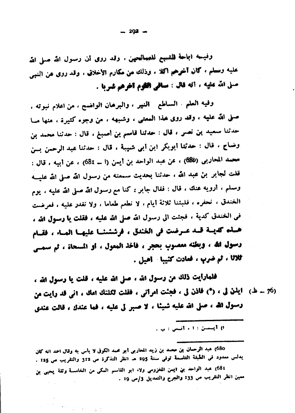 وَفِيهِ إِبَاحَةُ الشِّبَعِ لِلصَّالِحِينَ وَقَدْ رُوِيَ أَنَّ رَسُولَ اللَّهِ صَلَّى اللَّهُ عَلَيْهِ وسلم كان آخِرَهُمْ أَكْلًا وَذَلِكَ مِنْ مَكَارِمِ الْأَخْلَاقِ وَقَدْ رُوِيَ عَنِ النَّبِيِّ صَلَّى اللَّهُ عَلَيْهِ وسلم أَنَّهُ قَالَ سَاقِي الْقَوْمِ آخِرُهُمْ شُرْبًا وَفِيهِ الْعِلْمُ السَّاطِعُ النَّيِّرُ وَالْبُرْهَانُ الْوَاضِحُ مِنْ أَعْلَامِ نُبُوَّتِهِ صَلَّى اللَّهُ عَلَيْهِ وَسَلَّمَ وَقَدْ رُوِيَ هَذَا الْمَعْنَى وَشِبْهُهُ مِنْ وُجُوهٍ كَثِيرَةٍ مِنْهَا مَا حَدَّثَنَا سَعِيدُ بْنُ نَصْرٍ قَالَ حَدَّثَنَا قَاسِمُ بْنُ أَصْبَغَ قَالَ حَدَّثَنَا مُحَمَّدُ بْنُ وَضَّاحٍ قَالَ حَدَّثَنَا أَبُو بَكْرِ بْنُ أَبِي شَيْبَةَ قَالَ حَدَّثَنَا عَبْدُ الرَّحْمَنِ بْنُ مُحَمَّدٍ الْمُحَارِبِيُّ عَنْ عَبْدِ الْوَاحِدِ بْنِ أَيْمَنَ (1ـ681) عَنْ أَبِيهِ قَالَ قُلْتُ لِجَابِرِ بْنِ عَبْدِ اللَّهِ حَدِّثْنَا بِحَدِيثٍ سَمِعْتَهُ مِنْ رَسُولِ اللَّهِ صَلَّى اللَّهُ عَلَيْهِ وَسَلَّمَ أَرْوِيهِ عَنْكَ قَالَ فَقَالَ جَابِرٌ كُنَّا مَعَ رَسُولِ اللَّهِ صَلَّى اللَّهُ عَلَيْهِ وَسَلَّمَ يَوْمَ الْخَنْدَقِ نَحْفِرُهُ فَلَبِثْنَا ثَلَاثَةَ أَيَّامٍ لَا نَطْعَمُ طَعَامًا وَلَا نَقْدِرُ عَلَيْهِ فَعَرَضَتْ فِي الْخَنْدَقِ كُدْيَةٌ فَجِئْتُ إِلَى رَسُولِ اللَّهِ صَلَّى اللَّهُ عَلَيْهِ وَسَلَّمَ فَقُلْتُ يَا رَسُولَ اللَّهِ هَذِهِ كُدْيَةٌ قَدْ عَرَضَتْ فِي الْخَنْدَقِ فَرَشَشْنَا عَلَيْهَا الْمَاءَ فَقَامَ رَسُولُ اللَّهِ وَبَطْنُهُ مَعْصُوبٌ بِحَجَرٍ فَأَخَذَ الْمِعْوَلَ أَوِ الْمِسْحَاةَ ثُمَّ سَمَّى ثَلَاثًا ثُمَّ ضَرَبَ فَعَادَتْ كَثِيبًا أَهْيَلَ فَلَمَّا رَأَيْتُ ذَلِكَ مِنْ رَسُولِ اللَّهِ صَلَّى اللَّهُ عَلَيْهِ وَسَلَّمَ قُلْتُ يَا رَسُولَ اللَّهِ إِيذَنْ لِي (*) فَأَذِنَ لِي فَجِئْتُ امْرَأَتِي فَقُلْتُ ثَكِلَتْكِ أُمُّكِ إِنِّي قَدْ رَأَيْتُ مِنْ رَسُولِ اللَّهِ صَلَّى اللَّهُ عَلَيْهِ وَسَلَّمَ شَيْئًا لَا صَبْرَ لِي عَلَيْهِ فَمَا عِنْدَكِ قَالَتْ عندي