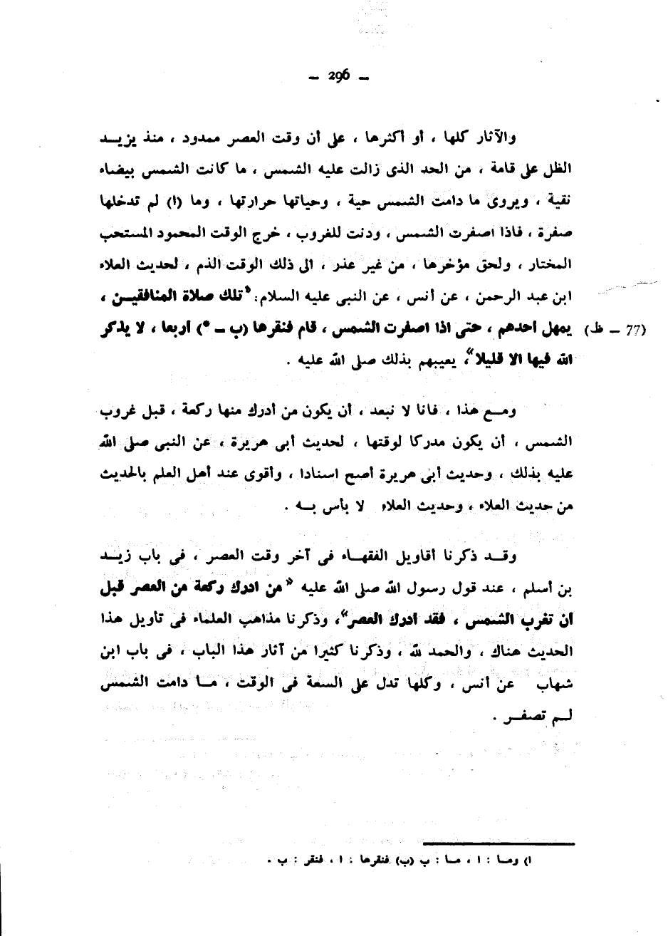 وَالْآثَارُ كُلُّهَا أَوْ أَكْثَرُهَا عَلَى أَنَّ وَقْتَ الْعَصْرِ مَمْدُودٌ مُنْذُ يَزِيدُ الظِّلُّ عَلَى قَامَةٍ مِنَ الْحَدِّ الَّذِي زَالَتْ عَلَيْهِ الشَّمْسُ مَا كَانَتِ الشَّمْسُ بَيْضَاءَ نَقِيَّةً وَيُرْوَى مَا دَامَتِ الشَّمْسُ حَيَّةً وَحَيَاتُهَا حَرَارَتُهَا وَمَا لَمْ تَدْخُلْهَا صُفْرَةٌ فَإِذَا اصْفَرَّتِ الشَّمْسُ وَدَنَتْ لِلْغُرُوبِ خَرَجَ الْوَقْتُ الْمَحْمُودُ الْمُسْتَحَبُّ الْمُخْتَارُ وَلَحِقَ مُؤَخِّرَهَا مِنْ غَيْرِ عُذْرٍ إِلَى ذَلِكَ الْوَقْتِ الذَّمُّ لِحَدِيثِ العلاء ابن عَبْدِ الرَّحْمَنِ عَنْ أَنَسٍ عَنِ النَّبِيِّ عَلَيْهِ السَّلَامُ تِلْكَ صَلَاةُ الْمُنَافِقِينَ يُمْهِلُ أَحَدُهُمْ حَتَّى إِذَا اصْفَرَّتِ الشَّمْسُ قَامَ فَنَقَرَهَا أَرْبَعًا لَا يَذْكُرُ اللَّهَ فِيهَا إِلَّا قَلِيلًا يَعِيبُهُمْ بِذَلِكَ صَلَّى اللَّهُ عَلَيْهِ وَسَلَّمَ وَمَعَ هَذَا فَإِنَّا لَا نَبْعُدُ أَنْ يَكُونَ مَنْ أَدْرَكَ مِنْهَا رَكْعَةً قَبْلَ غُرُوبِ الشَّمْسِ أَنْ يَكُونَ مُدْرِكًا لِوَقْتِهَا لِحَدِيثِ أَبِي هُرَيْرَةَ عَنِ النَّبِيِّ صَلَّى اللَّهُ عَلَيْهِ وَسَلَّمَ بِذَلِكَ وَحَدِيثُ أَبِي هُرَيْرَةَ أَصَحُّ إِسْنَادًا وَأَقْوَى عِنْدَ أَهْلِ الْعِلْمِ بِالْحَدِيثِ مِنْ حَدِيثِ الْعَلَاءِ وَحَدِيثُ الْعَلَاءِ لَا بَأْسَ بِهِ وَقَدْ ذَكَرْنَا أَقَاوِيلَ الْفُقَهَاءِ فِي آخِرِ وَقْتِ الْعَصْرِ فِي بَابِ زَيْدِ بْنِ أَسْلَمَ عِنْدَ قَوْلِ رَسُولِ اللَّهِ صَلَّى اللَّهُ عَلَيْهِ وَسَلَّمَ مَنْ أَدْرَكَ رَكْعَةً مِنَ الْعَصْرِ قَبْلَ أَنْ تَغْرُبَ الشَّمْسُ فَقَدْ أَدْرَكَ الْعَصْرَ وَذَكَرَنَا مَذَاهِبَ الْعُلَمَاءِ فِي تَأْوِيلِ هَذَا الْحَدِيثِ هُنَاكَ وَالْحَمْدُ لِلَّهِ وَذَكَرْنَا كَثِيرًا مِنْ آثَارِ هَذَا الْبَابِ فِي بَابِ ابْنِ شِهَابٍ عَنْ أَنَسٍ وَكُلُّهَا تَدُلُّ عَلَى السَّعَةِ فِي الْوَقْتِ مَا دَامَتِ الشَّمْسُ لَمْ تَصْفَرَّ