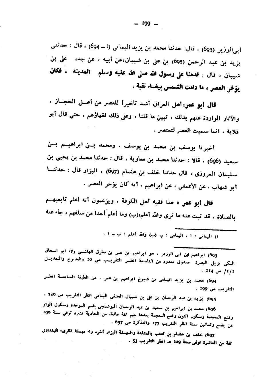 أَبِي الْوَزِيرِ قَالَ حَدَّثَنَا مُحَمَّدُ بْنُ يَزِيدَ الْيَمَانِيُّ قَالَ حَدَّثَنِي يَزِيدُ بْنُ عَبْدِ الرَّحْمَنِ بْنِ عَلِيِّ بْنِ شَيْبَانَ عَنْ أَبِيهِ عَنْ جَدِّهِ عَلِيِّ بْنِ شَيْبَانَ قَالَ قَدِمْنَا عَلَى رَسُولِ اللَّهِ صَلَّى اللَّهُ عَلَيْهِ وسلم الْمَدِينَةَ فَكَانَ يُؤَخِّرُ الْعَصْرَ مَا دَامَتِ الشَّمْسُ بَيْضَاءَ نَقِيَّةً قَالَ أَبُو عُمَرَ أَهْلُ الْعِرَاقِ أَشَدُّ تَأْخِيرًا لِلْعَصْرِ مِنْ أَهْلِ الْحِجَازِ وَالْآثَارُ الْوَارِدَةُ عَنْهُمْ بِذَلِكَ تُبَيِّنُ مَا قُلْنَا وَعَلَى ذَلِكَ فُقَهَاؤُهُمْ حَتَّى قَالَ أَبُو قِلَابَةَ إِنَّمَا سُمِّيَتِ الْعَصْرَ لِتَعْتَصِرَ أَخْبَرَنَا يُوسُفُ بْنُ مُحَمَّدِ بْنِ يُوسُفَ وَمُحَمَّدُ بْنُ إِبْرَاهِيمَ بْنِ سَعِيدٍ قَالَا حَدَّثَنَا مُحَمَّدُ بْنُ مُعَاوِيَةَ قَالَ حَدَّثَنَا مُحَمَّدُ بْنُ يَحْيَى بْنِ سُلَيْمَانَ الْمَرْوَزِيُّ قَالَ حَدَّثَنَا خَلَفُ بْنُ هِشَامٍ الْبَزَّارُ قَالَ حَدَّثَنَا أَبُو شِهَابٍ عَنِ الْأَعْمَشِ عَنْ إِبْرَاهِيمَ أَنَّهُ كَانَ يُؤَخِّرُ الْعَصْرَ قَالَ أَبُو عُمَرَ هَذَا فَقِيهُ أَهْلِ الْكُوفَةِ وَيَزْعُمُونَ أَنَّهُ أَعْلَمُ تَابِعِيهِمْ بِالصَّلَاةِ قَدْ ثَبَتَ عَنْهُ مَا تَرَى وَاللَّهُ أَعْلَمُ وَمَا أَعْلَمُ أَحَدًا مِنْ سَلَفِهِمْ جَاءَ عنه