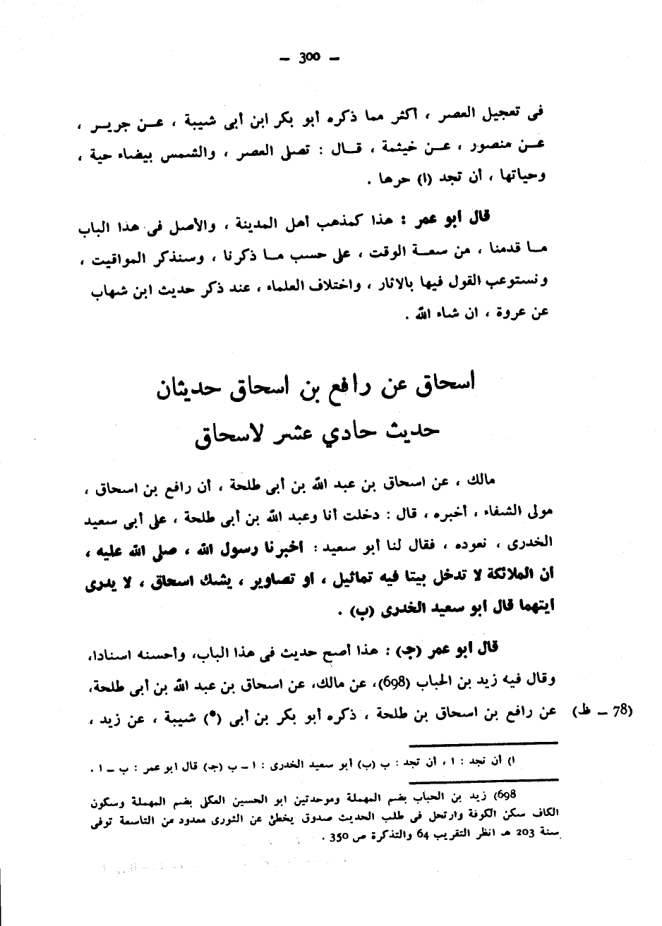 إِسْحَاقُ عَنْ رَافِعِ بْنِ إِسْحَاقَ حَدِيثَانِ حَدِيثٌ حَادِي عَشَرَ لِإِسْحَاقَ مَالِكٌ عَنْ إِسْحَاقَ بْنِ عَبْدِ اللَّهِ بْنِ أَبِي طَلْحَةَ أَنَّ رَافِعَ بْنَ إِسْحَاقَ مَوْلَى الشِّفَاءِ أَخْبَرَهُ قَالَ دَخَلْتُ أَنَا وَعَبْدُ اللَّهِ بْنُ أَبِي طَلْحَةَ عَلَى أَبِي سَعِيدٍ الْخُدْرِيِّ نَعُودُهُ فَقَالَ لَنَا أَبُو سَعِيدٍ أَخْبَرَنَا رَسُولُ اللَّهِ صَلَّى اللَّهُ عَلَيْهِ وَسَلَّمَ أَنَّ الْمَلَائِكَةَ لَا تَدْخُلُ بَيْتًا فِيهِ تَمَاثِيلُ أَوْ تَصَاوِيرُ يَشُكُّ إِسْحَاقُ لَا يَدْرِي أَيَّتَهُمَا قَالَ أَبُو سَعِيدٍ الْخُدْرِيُّ قَالَ أَبُو عُمَرَ هَذَا أَصَحُّ حَدِيثٍ فِي هَذَا الْبَابِ وَأَحْسَنُهُ إِسْنَادًا وَقَالَ فِيهِ زَيْدُ بْنُ الْحُبَابِ عَنْ مَالِكٍ عَنْ إِسْحَاقَ بْنِ عَبْدِ اللَّهِ بْنِ أَبِي طَلْحَةَ عَنْ رَافِعِ بْنِ إِسْحَاقَ بْنِ طَلْحَةَ ذَكَرَهُ أَبُو بَكْرِ بْنُ أَبِي (*) شَيْبَةَ عَنْ زَيْدٍ