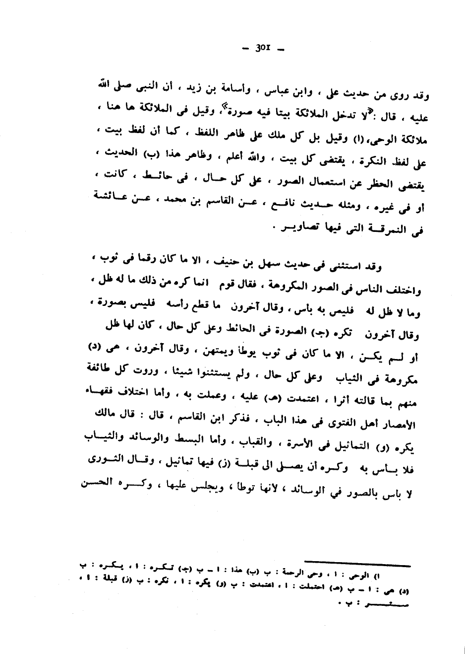 وَقَدْ رُوِيَ مِنْ حَدِيثِ عَلِيٍّ وَابْنِ عَبَّاسٍ وَأُسَامَةَ بْنِ زَيْدٍ أَنَّ النَّبِيَّ صَلَّى اللَّهُ عَلَيْهِ وَسَلَّمَ قَالَ لَا تَدْخُلُ الْمَلَائِكَةُ بَيْتًا فيه صورة وقيل في الملائكة ها هنا مَلَائِكَةُ الْوَحْيِ وَقِيلَ بَلْ كُلُّ مَلَكٍ عَلَى ظَاهِرِ اللَّفْظِ كَمَا أَنَّ لَفْظَ بَيْتٍ عَلَى لَفْظِ النَّكِرَةِ يَقْتَضِي كُلَّ بَيْتٍ وَاللَّهُ أَعْلَمُ وَظَاهِرُ هَذَا الْحَدِيثِ يَقْتَضِي الْحَظْرَ عَنِ اسْتِعْمَالِ الصُّوَرِ عَلَى كُلِّ حَالٍ فِي حَائِطٍ كَانَتْ أَوْ فِي غَيْرِهِ وَمِثْلُهُ حَدِيثُ نَافِعٍ عَنِ الْقَاسِمِ بْنِ مُحَمَّدٍ عَنْ عَائِشَةَ فِي النُّمْرُقَةِ الَّتِي فِيهَا تَصَاوِيرُ وَقَدِ اسْتَثْنَى فِي حَدِيثِ سَهْلِ بْنِ حُنَيْفٍ إِلَّا مَا كَانَ رَقْمًا فِي ثَوْبٍ وَاخْتَلَفَ النَّاسُ فِي الصُّوَرِ الْمَكْرُوهَةِ فَقَالَ قَوْمٌ إِنَّمَا كُرِهَ مِنْ ذَلِكَ مَا لَهُ ظِلٌّ وَمَا لَا ظِلَّ لَهُ فَلَيْسَ بِهِ بَأْسٌ وَقَالَ آخَرُونَ مَا قُطِعَ رَأَسُهُ فَلَيْسَ بِصُورَةٍ وَقَالَ آخَرُونَ تُكْرَهُ الصُّورَةُ فِي الْحَائِطِ وَعَلَى كُلِّ حَالٍ كَانَ لَهَا ظِلٌّ أَوْ لَمْ يَكُنْ إِلَّا مَا كَانَ فِي ثَوْبٍ يُوطَأُ وَيُمْتَهَنُ وَقَالَ آخَرُونَ هِيَ مَكْرُوهَةٌ فِي الثِّيَابِ وَعَلَى كُلِّ حَالٍ وَلَمْ يَسْتَثْنُوا شَيْئًا وَرَوَتْ كُلُّ طَائِفَةٍ مِنْهُمْ بِمَا قَالَتْهُ أثرا اعتمدت (هـ) عَلَيْهِ وَعَمِلَتْ بِهِ وَأَمَّا اخْتِلَافُ فُقَهَاءِ الْأَمْصَارِ أَهْلِ الْفَتْوَى فِي هَذَا الْبَابِ فَذَكَرَ ابْنُ الْقَاسِمِ قَالَ قَالَ مَالِكٌ يُكْرَهُ التَّمَاثِيلُ فِي الْأَسِرَّةِ وَالْقِبَابِ وَأَمَّا الْبُسُطُ وَالْوَسَائِدُ وَالثِّيَابُ فَلَا بَأْسَ بِهِ وَكَرِهَ أَنْ يُصَلَّى إِلَى قِبْلَةٍ فِيهَا تَمَاثِيلُ وَقَالَ الثَّوْرِيُّ لَا بَأْسَ بِالصُّوَرِ فِي الْوَسَائِدِ لِأَنَّهَا تُوطَأُ وَيُجْلَسُ عَلَيْهَا وَكَرِهَ الحسن