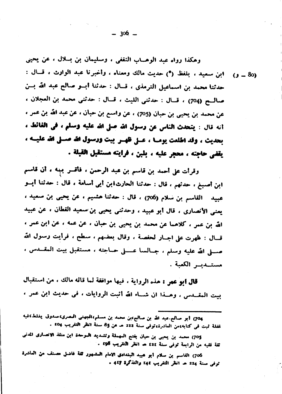 وَهَكَذَا رَوَاهُ عَبْدُ الْوَهَّابِ الثَّقَفِيُّ وَسُلَيْمَانُ بْنُ بلال عن يحيى ابن سَعِيدٍ بِلَفْظِ (*) حَدِيثِ مَالِكٍ وَمَعْنَاهُ وَأَخْبَرَنَا عَبْدُ الْوَارِثِ قَالَ حَدَّثَنَا مُحَمَّدُ بْنُ إِسْمَاعِيلَ التِّرْمِذِيُّ قَالَ حَدَّثَنَا أَبُو صَالِحٍ عَبْدُ اللَّهِ بْنُ صَالِحٍ قَالَ حَدَّثَنِي اللَّيْثُ قَالَ حَدَّثَنِي مُحَمَّدُ بْنُ الْعَجْلَانِ عَنْ مُحَمَّدِ بْنِ يَحْيَى بْنِ حِبَّانَ عَنْ وَاسِعِ بْنِ حِبَّانِ عَنْ عَبْدِ اللَّهِ بْنِ عُمَرَ أَنَّهُ قَالَ يَتَحَدَّثُ النَّاسُ عَنْ رَسُولِ اللَّهِ صَلَّى اللَّهُ عَلَيْهِ وَسَلَّمَ فِي الْغَائِطِ بِحَدِيثٍ وَقَدِ اطَّلَعْتُ يَوْمًا عَلَى ظَهْرِ بَيْتٍ وَرَسُولُ اللَّهِ صَلَّى اللَّهُ عَلَيْهِ وَسَلَّمَ يَقْضِي حَاجَتَهُ مُحَجَّرٌ عَلَيْهِ بِلَبِنٍ فَرَأَيْتُهُ مُسْتَقْبِلَ الْقِبْلَةِ وَقَرَأْتُ عَلَى أَحْمَدَ بْنِ قَاسِمِ بْنِ عَبْدِ الرَّحْمَنِ فَأَقَرَّ بِهِ أَنَّ قَاسِمَ ابن أصبغ حدثهم قال حدثنا الحارث ابن أَبِي أُسَامَةَ قَالَ حَدَّثَنَا أَبُو عُبَيْدٍ الْقَاسِمُ بْنُ سَلَّامٍ قَالَ حَدَّثَنَا هُشَيْمٌ عَنْ يَحْيَى بْنِ سَعِيدٍ يَعْنِي الْأَنْصَارِيَّ قَالَ أَبُو عُبَيْدٍ وَحَدَّثَنِي يَحْيَى بْنُ سَعِيدٍ الْقَطَّانُ عَنْ عُبَيْدِ اللَّهِ بْنِ عُمَرَ كِلَاهُمَا عَنْ مُحَمَّدِ بْنِ يَحْيَى بْنِ حِبَّانَ عَنْ عَمِّهِ عَنِ ابْنِ عُمَرَ قَالَ ظَهَرْتُ عَلَى أَجَارٍ لِحَفْصَةَ وَقَالَ بَعْضُهُمْ سَطْحٍ فَرَأَيْتُ رَسُولَ اللَّهِ صَلَّى اللَّهُ عَلَيْهِ وَسَلَّمَ جَالِسًا عَلَى حَاجَتِهِ مُسْتَقْبِلَ بَيْتِ الْمَقْدِسِ مُسْتَدْبِرَ الْكَعْبَةِ قَالَ أَبُو عُمَرَ هَذِهِ الرِّوَايَةُ فِيهَا مُوَافَقَةٌ لِمَا قَالَهُ مَالِكٌ مِنِ اسْتِقْبَالِ بَيْتِ الْمَقْدِسِ وَهَذَا إِنْ شَاءَ اللَّهُ أَثْبَتُ الرِّوَايَاتِ فِي حَدِيثِ ابْنِ عُمَرَ