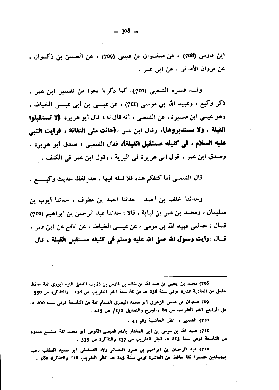 ابن فَارِسٍ عَنْ صَفْوَانَ بْنِ عِيسَى عَنِ الْحَسَنِ بْنِ ذَكْوَانَ عَنْ مَرْوَانَ الْأَصْفَرِ عَنِ ابْنِ عُمَرَ وَقَدْ فَسَّرَهُ الشَّعْبِيُّ كَمَا ذَكَرْنَا نَحْوًا مِنْ تَفْسِيرِ ابْنِ عُمَرَ ذَكَرَ وَكِيعٌ وَعُبَيْدُ اللَّهِ بْنُ مُوسَى عَنْ عِيسَى بْنِ أَبِي عِيسَى الْخَيَّاطِ وَهُوَ عِيسَى ابْنُ مَسِيرَةَ عَنِ الشَّعْبِيِّ أَنَّهُ قَالَ لَهُ قَالَ أَبُو هُرَيْرَةَ (لَا تَسْتَقْبِلُوا الْقِبْلَةَ وَلَا تَسْتَدْبِرُوهَا) وَقَالَ ابْنُ عُمَرَ (حَانَتْ مِنِّي الْتِفَاتَةٌ فَرَأَيْتُ النَّبِيَّ عَلَيْهِ السَّلَامُ فِي كَنِيفِهِ مُسْتَقْبِلَ الْقِبْلَةِ) فَقَالَ الشَّعْبِيُّ صَدَقَ أَبُو هُرَيْرَةَ وَصَدَقَ ابْنُ عُمَرَ قَوْلُ أَبِي هُرَيْرَةَ فِي الْبَرِّيَّةِ وَقَوْلُ ابْنِ عُمَرَ فِي الْكُنُفِ قَالَ الشَّعْبِيُّ أَمَّا كُنُفُكُمْ هَذِهِ فَلَا قِبْلَةَ فِيهَا هَذَا لَفْظُ حَدِيثِ وَكِيعٍ وَحَدَّثَنَا خَلَفُ بْنُ أَحْمَدَ حَدَّثَنَا أَحْمَدُ بْنُ مُطَرِّفٍ حَدَّثَنَا أَيُّوبُ بْنُ سُلَيْمَانَ وَمُحَمَّدُ بْنُ عُمَرَ بْنِ لُبَابَةَ قَالَا حَدَّثَنَا عَبْدُ الرَّحْمَنِ بْنُ إِبْرَاهِيمَ قَالَ حَدَّثَنِي عُبَيْدُ اللَّهِ بْنُ مُوسَى عَنْ عِيسَى الْخَيَّاطِ عَنْ نَافِعٍ عَنِ ابْنِ عُمَرَ قَالَ رَأَيْتُ رَسُولَ اللَّهِ صَلَّى اللَّهُ عَلَيْهِ وَسَلَّمَ فِي كَنِيفِهِ مُسْتَقْبِلَ الْقِبْلَةِ قال