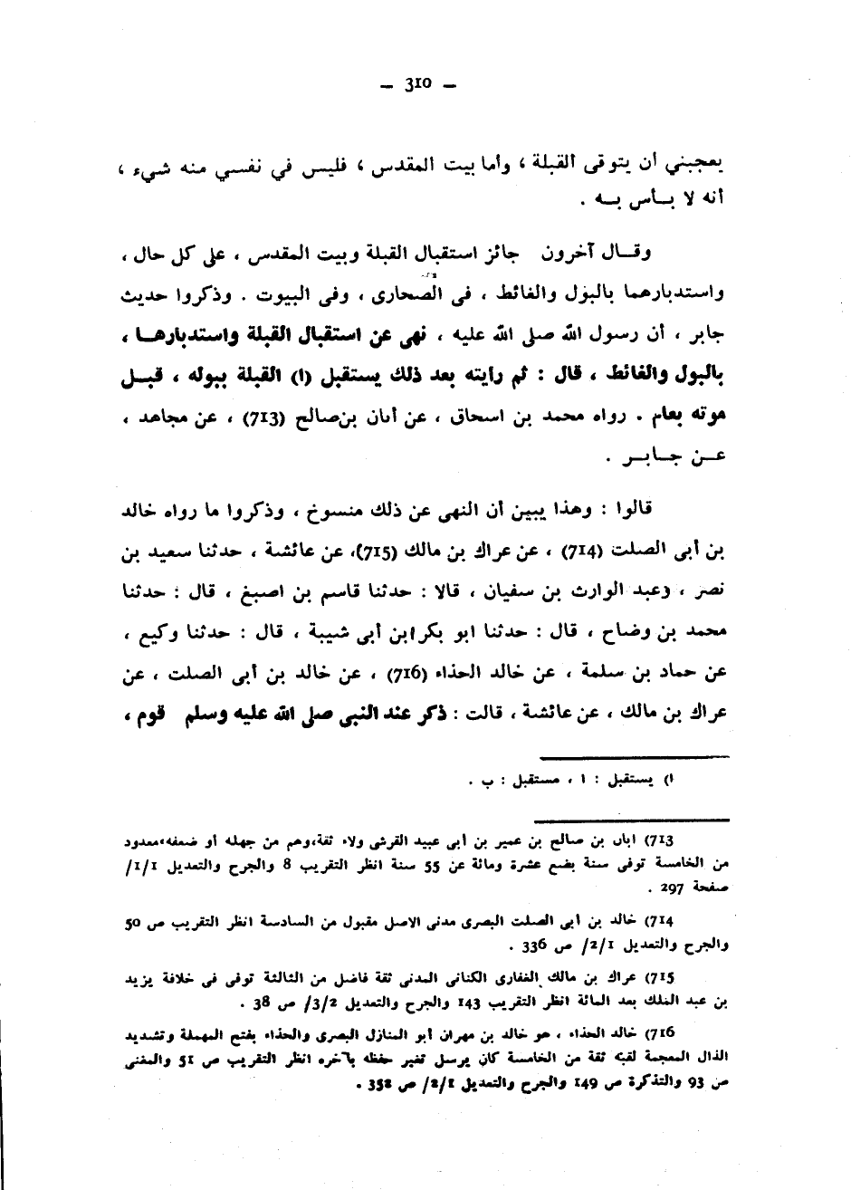 يُعْجِبُنِي أَنْ يَتَوَقَّى الْقِبْلَةَ وَأَمَّا بَيْتُ الْمَقْدِسِ فَلَيْسَ فِي نَفْسِي مِنْهُ شَيْءٌ أَنَّهُ لَا بَأْسَ بِهِ وَقَالَ آخَرُونَ جَائِزٌ اسْتِقْبَالُ الْقِبْلَةِ وَبَيْتِ الْمَقْدِسِ عَلَى كُلِّ حَالٍ وَاسْتِدْبَارُهُمَا بِالْبَوْلِ وَالْغَائِطِ فِي الصَّحَارِي وَفِي الْبُيُوتِ وَذَكَرُوا حَدِيثَ جَابِرٍ أَنَّ رَسُولَ اللَّهِ صَلَّى اللَّهُ عَلَيْهِ وَسَلَّمَ نَهَى عَنِ اسْتِقْبَالِ الْقِبْلَةِ وَاسْتِدْبَارِهَا بِالْبَوْلِ وَالْغَائِطِ قَالَ ثُمَّ رَأَيْتُهُ بَعْدَ ذَلِكَ يَسْتَقْبِلُ الْقِبْلَةَ بِبَوْلِهِ قَبْلَ مَوْتِهِ بِعَامٍ رَوَاهُ مُحَمَّدُ بْنُ إِسْحَاقَ عَنْ أَبَانِ بْنِ صَالِحٍ عَنْ مُجَاهِدٍ عَنْ جَابِرٍ قَالُوا وَهَذَا يُبَيِّنُ أَنَّ النَّهْيَ عَنْ ذَلِكَ مَنْسُوخٌ وَذَكَرُوا مَا رَوَاهُ خالد بن أبي الصلت عن عراك بن مَالِكٍ عَنْ عَائِشَةَ حَدَّثَنَا سَعِيدُ بْنُ نَصْرٍ وَعَبْدُ الْوَارِثِ بْنُ سُفْيَانَ قَالَا حَدَّثَنَا قَاسِمُ بْنُ أَصْبَغَ قَالَ حَدَّثَنَا مُحَمَّدُ بْنُ وَضَّاحٍ قَالَ حَدَّثَنَا أَبُو بَكْرِ بْنُ أَبِي شَيْبَةَ قَالَ حَدَّثَنَا وَكِيعٌ عَنْ حَمَّادِ بْنِ سَلَمَةَ عَنْ خَالِدٍ الْحَذَّاءِ عَنْ خَالِدِ بْنِ أَبِي الصَّلْتِ عَنْ عِرَاكِ بْنِ مَالِكٍ عَنْ عَائِشَةَ قَالَتْ ذُكِرَ عِنْدَ النَّبِيِّ صَلَّى اللَّهُ عَلَيْهِ وسلم قوم