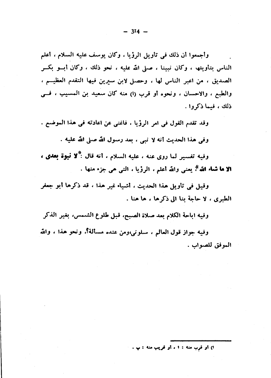 وَأَجْمَعُوا أَنَّ ذَلِكَ فِي تَأْوِيلِ الرُّؤْيَا وَكَانَ يُوسُفُ عَلَيْهِ السَّلَامُ أَعْلَمَ النَّاسِ بِتَأْوِيلِهَا وَكَانَ نبينا صلى الله عليه وسلم نَحْوَ ذَلِكَ وَكَانَ أَبُو بَكْرٍ الصَّدِيقُ مَنْ أَعْبَرِ النَّاسِ لَهَا وَحَصَلَ لِابْنِ سِيرِينَ فِيهَا التَّقَدُّمُ الْعَظِيمُ وَالطَّبْعُ وَالْإِحْسَانُ وَنَحْوَهُ أَوْ قَرُبَ مِنْهُ كَانَ سَعِيدُ بْنُ الْمُسَيَّبِ فِي ذَلِكَ فِيمَا ذَكَرُوا وَقَدْ تَقَدَّمَ الْقَوْلُ فِي أَمْرِ الرُّؤْيَا فَأَغْنَى عَنْ إِعَادَتِهِ فِي هَذَا الْمَوْضِعِ وَفِي هَذَا الْحَدِيثِ أَنَّهُ لَا نَبِيَّ بَعْدَ رَسُولِ اللَّهِ صَلَّى اللَّهُ عَلَيْهِ وَسَلَّمَ وَفِيهِ تَفْسِيرٌ لِمَا رُوِيَ عَنْهُ عَلَيْهِ السَّلَامُ أَنَّهُ قَالَ لَا نُبُوَّةَ بَعْدِي إِلَّا مَا شَاءَ اللَّهُ يَعْنِي وَاللَّهُ أَعْلَمُ الرُّؤْيَا الَّتِي هِيَ جُزْءٌ مِنْهَا وَقِيلَ فِي تَأْوِيلِ هَذَا الْحَدِيثِ أَشْيَاءُ غَيْرُ هَذَا قَدْ ذَكَرَهَا أَبُو جَعْفَرٍ الطبري لا حاجة بنا إلى ذكرها ها هنا وَفِيهِ إِبَاحَةُ الْكَلَامِ بَعْدَ صَلَاةِ الصُّبْحِ قَبْلَ طُلُوعِ الشَّمْسِ بِغَيْرِ الذِّكْرِ وَفِيهِ جَوَازُ قَوْلِ العالم سلوني ومن عِنْدَهُ مَسْأَلَةٌ وَنَحْوَ هَذَا وَاللَّهُ الْمُوَفِّقُ لِلصَّوَابِ