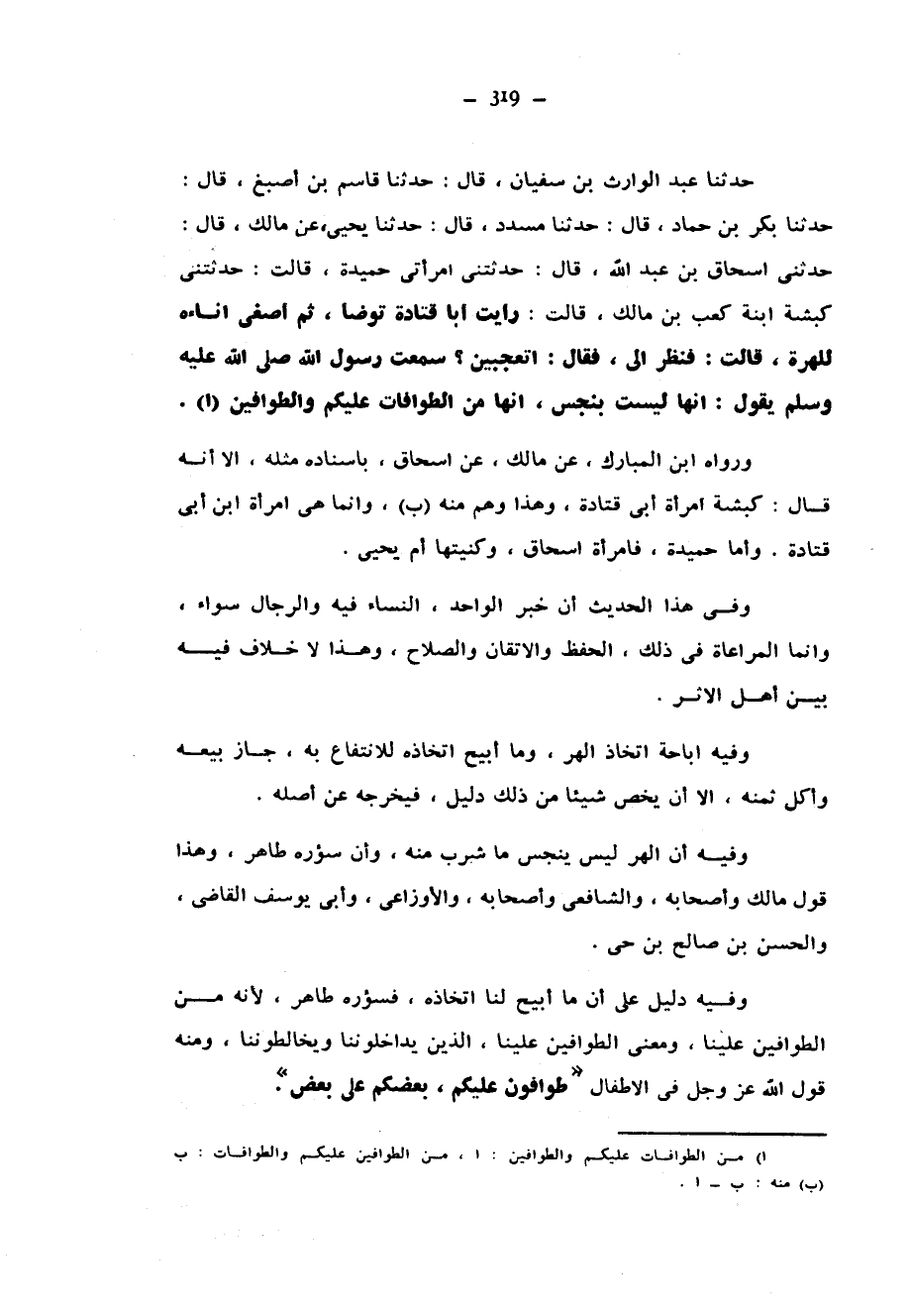 حَدَّثَنَا عَبْدُ الْوَارِثِ بْنُ سُفْيَانَ قَالَ حَدَّثَنَا قَاسِمُ بْنُ أَصْبَغَ قَالَ حَدَّثَنَا بَكْرُ بْنُ حَمَّادٍ قَالَ حَدَّثَنَا مُسَدَّدٌ قَالَ حَدَّثَنَا يَحْيَى عَنْ مَالِكٍ قَالَ حَدَّثَنِي إِسْحَاقُ بْنُ عَبْدِ اللَّهِ قَالَ حَدَّثَتْنِي امْرَأَتِي حُمَيْدَةُ قَالَتْ حَدَّثَتْنِي كَبْشَةُ ابْنَةُ كَعْبِ بْنِ مَالِكٍ قَالَتْ رَأَيْتُ أَبَا قَتَادَةَ تَوَضَّأَ ثُمَّ أَصْغَى إِنَاءَهُ لِلْهِرَّةِ قَالَتْ فَنَظَرَ إِلَيَّ فَقَالَ أَتَعْجَبِينَ سَمِعْتُ رَسُولَ اللَّهِ صَلَّى اللَّهُ عَلَيْهِ وَسَلَّمَ يَقُولُ إِنَّهَا لَيْسَتْ بِنَجَسٍ إِنَّهَا مِنَ الطَّوَّافَاتِ عَلَيْكُمْ وَالطَّوَّافِينَ وَرَوَاهُ ابْنُ الْمُبَارَكِ عَنْ مَالِكٍ عَنْ إِسْحَاقَ بِإِسْنَادِهِ مِثْلَهُ إِلَّا أَنَّهُ قَالَ كَبْشَةُ امْرَأَةُ أَبِي قَتَادَةَ وَهَذَا وَهَمٌ مِنْهُ وَإِنَّمَا هِيَ امْرَأَةُ ابْنِ أَبِي قَتَادَةَ وَأَمَّا حُمَيْدَةُ فَامْرَأَةُ إِسْحَاقَ وَكُنْيَتُهَا أُمُّ يَحْيَى وَفِي هَذَا الْحَدِيثِ أَنَّ خَبَرَ الْوَاحِدِ النِّسَاءُ فِيهِ وَالرِّجَالُ سَوَاءٌ وَإِنَّمَا الْمُرَاعَاةُ فِي ذَلِكَ الْحِفْظُ وَالْإِتْقَانُ وَالصَّلَاحُ وَهَذَا لَا خِلَافَ فِيهِ بَيْنَ أَهْلِ الْأَثَرِ وفيه إباحة اتخاذ الهر وما أبيح اخاذه اتِّخَاذُهُ لِلِانْتِفَاعِ بِهِ جَازَ بَيْعُهُ وَأَكْلُ ثَمَنِهِ إِلَّا إِنْ يَخُصَّ شَيْئًا مِنْ ذَلِكَ دَلِيلٌ فَيُخْرِجَهُ عَنْ أَصْلِهِ وَفِيهِ أَنَّ الْهِرَّ لَيْسَ يُنَجِّسُ مَا شَرِبَ مِنْهُ وَأَنَّ سُؤْرَهُ طَاهِرٌ وَهَذَا قَوْلُ مَالِكٍ وَأَصْحَابِهِ وَالشَّافِعِيِّ وَأَصْحَابِهِ وَالْأَوْزَاعِيِّ وَأَبِي يُوسُفَ الْقَاضِي وَالْحَسَنِ بْنِ صَالِحِ بْنِ حَيٍّ وَفِيهِ دَلِيلٌ عَلَى أَنَّ مَا أُبِيحَ لَنَا اتِّخَاذُهُ فَسُؤْرُهُ طَاهِرٌ لِأَنَّهُ مِنَ الطَّوَّافِينَ عَلَيْنَا وَمَعْنَى الطَّوَّافِينَ عَلَيْنَا الَّذِينَ يُدَاخِلُونَنَا وَيُخَالِطُونَنَا وَمِنْهُ قَوْلُ اللَّهِ عَزَّ وَجَلَّ فِي الْأَطْفَالِ طَوَّافُونَ عَلَيْكُمْ بَعْضُكُمْ عَلَى بَعْضٍ