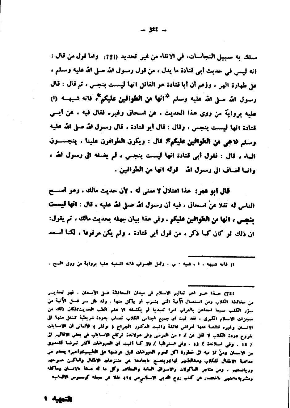 سَلَكَ بِهِ سَبِيلَ النَّجَاسَاتِ فِي الْإِنْقَاءِ مِنْ غَيْرِ تَحْدِيدٍ وَأَمَّا قَوْلُ مَنْ قَالَ إِنَّهُ لَيْسَ فِي حَدِيثِ أَبِي قَتَادَةَ مَا يَدُلُّ مِنْ قَوْلِ رَسُولِ اللَّهِ صَلَّى اللَّهُ عَلَيْهِ وَسَلَّمَ عَلَى طَهَارَةِ الْهِرِّ وَزَعَمَ أَنَّ أَبَا قَتَادَةَ هُوَ الْقَائِلُ إِنَّهَا لَيْسَتْ بِنَجَسٍ ثُمَّ قَالَ قَالَ رَسُولُ اللَّهِ صَلَّى اللَّهُ عَلَيْهِ وَسَلَّمَ إِنَّهَا مِنَ الطَّوَّافِينَ عَلَيْكُمْ فَإِنَّهُ شَبَّهَهُ عَلَيْهِ بِرِوَايَةِ مَنْ رَوَى هَذَا الْحَدِيثَ عَنْ إِسْحَاقَ وَغَيْرِهِ فَقَالَ فِيهِ عَنْ أَبِي قَتَادَةَ إِنَّهَا لَيْسَتْ بِنَجَسٍ وَقَالَ قَالَ أَبُو قَتَادَةَ قَالَ رَسُولُ اللَّهِ صَلَّى اللَّهُ عَلَيْهِ وَسَلَّمَ هِيَ مِنَ الطَّوَّافِينَ عَلَيْكُمْ قَالَ وَيَكُونُ الطَّوَّافُونَ عَلَيْنَا يُنَجِّسُونَ الْمَاءَ قَالَ فَقَوْلُ أَبِي قَتَادَةَ إِنَّهَا لَيْسَتْ بِنَجَسٍ لَمْ يُضِفْهُ إِلَى رَسُولِ اللَّهِ وَإِنَّمَا أَضَافَ إِلَى رَسُولِ اللَّهِ قَوْلَهُ إِنَّهَا مِنَ الطَّوَّافِينَ قَالَ أَبُو عُمَرَ هَذَا اعْتِلَالٌ لَا مَعْنَى لَهُ لِأَنَّ حَدِيثَ مَالِكٍ وَهُوَ أَصَحُّ النَّاسِ لَهُ نَقْلًا عَنْ إِسْحَاقَ فِيهِ أَنَّ رَسُولَ اللَّهِ صَلَّى اللَّهُ عَلَيْهِ وَسَلَّمَ قَالَ إِنَّهَا لَيْسَتْ بِنَجَسٍ إِنَّهَا مِنَ الطَّوَّافِينَ عَلَيْكُمْ وَفِي هَذَا بَيَانُ جَهْلِهِ بِحَدِيثِ مَالِكٍ ثُمَّ يَقُولُ إِنَّ ذَلِكَ لَوْ كَانَ كَمَا ذَكَرَ مِنْ قَوْلِ أَبِي قَتَادَةَ وَلَمْ يَكُنْ مَرْفُوعًا لَكُنَّا أَسْعَدَ