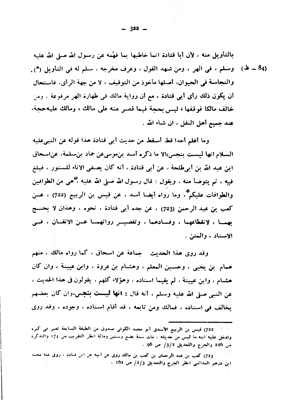 بِالتَّأْوِيلِ مِنْهُ لِأَنَّ أَبَا قَتَادَةَ إِنَّمَا خَاطَبَهَا بِمَا فَهِمَهُ عَنْ رَسُولِ اللَّهِ صَلَّى اللَّهُ عَلَيْهِ وَسَلَّمَ فِي الْهِرِّ وَمَنْ شَهِدَ الْقَوْلَ وَعَرَفَ مَخْرَجَهُ سَلِمَ لَهُ فِي التَّأْوِيلِ (*) وَالنَّجَاسَةُ فِي الْحَيَوَانِ أَصْلُهَا مَأْخُوذٌ مِنَ التَّوْقِيفِ لَا مِنْ جِهَةِ الرَّأْيِ فَاسْتَحَالَ أَنْ يَكُونَ ذَلِكَ رَأْيَ أَبِي قَتَادَةَ مَعَ أَنَّ رِوَايَةَ مَالِكٍ فِي طَهَارَةِ الْهِرِّ مَرْفُوعَةٌ وَمَنْ خَالَفَ مَالِكًا فَوَقَفَهَا لَيْسَ بِحُجَّةٍ فِيمَا قَصَّرَ عَنْهُ عَلَى مَالِكٍ وَمَالِكٌ عَلَيْهِ حُجَّةٌ عِنْدَ جَمِيعِ أَهْلِ النَّقْلِ إِنْ شَاءَ اللَّهُ وَمَا أَعْلَمُ أَحَدًا قَطُّ أَسْقَطَ مِنْ حَدِيثِ أَبِي قَتَادَةَ هَذَا قَوْلَهُ عَنِ النَّبِيِّ عَلَيْهِ السَّلَامُ إِنَّهَا لَيْسَتْ بِنَجَسٍ إِلَّا مَا ذَكَرَهُ أَسَدُ بْنُ مُوسَى عن حماد بن سلمة عن إسحاق ابن عَبْدِ اللَّهِ بْنِ أَبِي طَلْحَةَ عَنْ أَبِي قَتَادَةَ أَنَّهُ كَانَ يُصْغِي الْإِنَاءَ لِلسِّنَّوْرِ فَيَلِغَ فِيهِ ثُمَّ يَتَوَضَّأُ مِنْهُ وَيَقُولُ قَالَ رَسُولُ اللَّهِ صَلَّى اللَّهُ عَلَيْهِ وَسَلَّمَ هِيَ مِنَ الطَّوَّافِينَ وَالطَّوَّافَاتِ عَلَيْكُمْ وَمَا رَوَاهُ أَيْضًا أَسَدٌ عَنْ قَيْسِ بْنِ الرَّبِيعِ عَنْ كَعْبِ بْنِ عَبْدِ الرَّحْمَنِ عَنْ جَدِّهِ أَبِي قَتَادَةَ نَحْوُهُ وَهَذَانِ لَا يُحْتَجُّ بِهِمَا لِانْقِطَاعِهِمَا وَفَسَادِهِمَا وَتَقْصِيرِ رُوَاتِهِمَا عَنِ الْإِتْقَانِ فِي الْإِسْنَادِ وَالْمَتْنِ وَقَدْ رَوَى هَذَا الْحَدِيثَ جَمَاعَةٌ عَنْ إِسْحَاقَ كَمَا رَوَاهُ مَالِكٌ مِنْهُمْ هَمَّامُ بْنُ يَحْيَى وَحُسَيْنُ الْمُعَلِّمُ وَهِشَامُ بْنُ عُرْوَةَ وَابْنُ عُيَيْنَةَ وَإِنْ كَانَ هِشَامٌ وَابْنُ عُيَيْنَةَ لَمْ يُقِيمَا إِسْنَادَهُ وَهَؤُلَاءِ كُلُّهُمْ يَقُولُونَ فِي هَذَا الْحَدِيثِ عَنِ النَّبِيِّ صَلَّى اللَّهُ عَلَيْهِ وَسَلَّمَ أَنَّهُ قَالَ إِنَّهَا لَيْسَتْ بِنَجَسٍ وَإِنْ كَانَ بَعْضُهُمْ يُخَالِفُ فِي إِسْنَادِهِ فَمَالِكٌ وَمَنْ تَابَعَهُ قَدْ أَقَامَ إِسْنَادَهُ وَجَوَّدَهُ وَقَدْ رَوَى