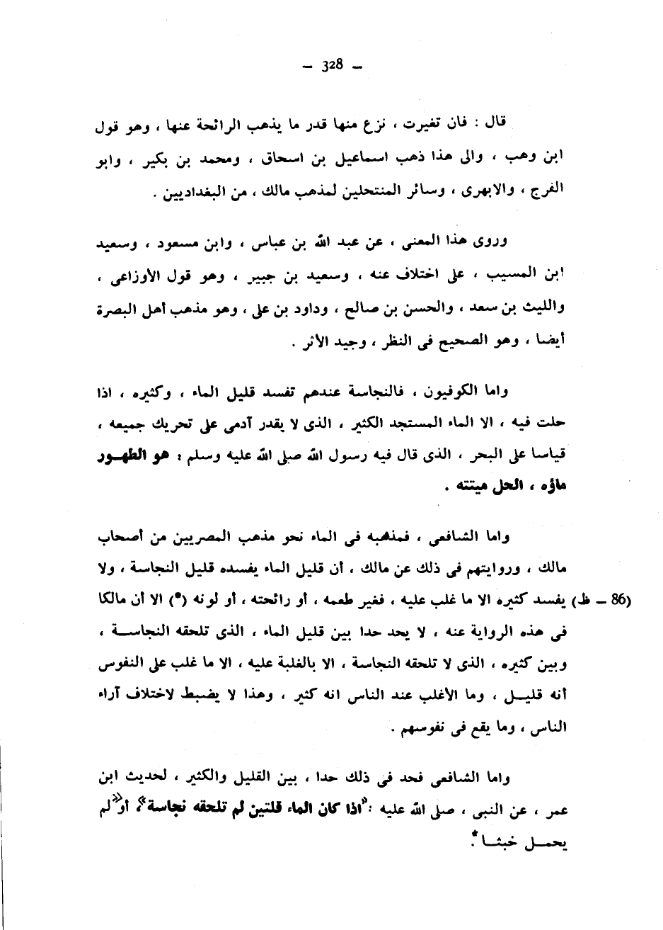 قَالَ فَإِنْ تَغَيَّرَتْ نَزَعَ مِنْهَا قَدْرَ مَا يُذْهِبُ الرَّائِحَةَ عَنْهَا وَهُوَ قَوْلُ ابْنِ وَهْبٍ وَإِلَى هَذَا ذَهَبَ إِسْمَاعِيلُ بْنُ إِسْحَاقَ وَمُحَمَّدُ بْنُ بُكَيْرٍ وَأَبُو الْفَرَجِ وَالْأَبْهَرَيُّ وَسَائِرُ الْمُنْتَحِلِينَ لِمَذْهَبِ مَالِكٍ مِنَ الْبَغْدَادِيِّينَ وَرُوِيَ هَذَا الْمَعْنَى عَنْ عَبْدِ اللَّهِ بْنِ عَبَّاسٍ وَابْنِ مَسْعُودٍ وسعيد ابن الْمُسَيَّبِ عَلَى اخْتِلَافٍ عَنْهُ وَسَعِيدِ بْنِ جُبَيْرٍ وَهُوَ قَوْلُ الْأَوْزَاعِيِّ وَاللَّيْثِ بْنِ سَعْدٍ وَالْحَسَنِ بْنِ صَالِحٍ وَدَاوُدَ بْنِ عَلِيٍّ وَهُوَ مَذْهَبُ أَهْلِ الْبَصْرَةِ أَيْضًا وَهُوَ الصَّحِيحُ فِي النَّظَرِ وَجَيِّدِ الْأَثَرِ وَأَمَّا الْكُوفِيُّونَ فَالنَّجَاسَةُ عِنْدَهُمْ تُفْسِدُ قَلِيلَ الْمَاءِ وَكَثِيرَهُ إِذَا حَلَّتْ فِيهِ إِلَّا الْمَاءَ الْمُسْتَجِدَّ الْكَثِيرَ الَّذِي لَا يَقْدِرُ آدَمِيٌّ عَلَى تَحْرِيكِ جَمِيعِهِ قِيَاسًا عَلَى الْبَحْرِ الَّذِي قَالَ فِيهِ رَسُولُ اللَّهِ صَلَّى اللَّهُ عَلَيْهِ وَسَلَّمَ هُوَ الطَّهُورُ مَاؤُهُ الْحِلُّ مِيتَتُهُ وَأَمَّا الشَّافِعِيُّ فَمَذْهَبُهُ فِي الْمَاءِ نَحْوُ مَذْهَبِ الْمِصْرِيِّينَ مِنْ أَصْحَابِ مَالِكٍ وَرِوَايَتُهُمْ فِي ذَلِكَ عَنْ مَالِكٍ أَنَّ قَلِيلَ الْمَاءِ يُفْسِدُهُ قَلِيلُ النَّجَاسَةِ وَلَا يُفْسِدُ كَثِيرَهُ إِلَّا مَا غَلَبَ عَلَيْهِ فَغَيَّرَ طَعْمَهُ أَوْ رَائِحَتَهُ أَوْ لَوْنَهُ (*) إِلَّا أَنَّ مَالِكًا فِي هَذِهِ الرِّوَايَةِ عَنْهُ لَا يَحُدُّ حَدًّا بَيْنَ قَلِيلِ الْمَاءِ الَّذِي تَلْحَقُهُ النَّجَاسَةُ وَبَيْنَ كَثِيرِهِ الَّذِي لَا تَلْحَقُهُ النَّجَاسَةُ إِلَّا بِالْغَلَبَةِ عَلَيْهِ إِلَّا مَا غَلَبَ عَلَى النُّفُوسِ أَنَّهُ قَلِيلٌ وَمَا الْأَغْلَبُ عِنْدَ النَّاسِ أَنَّهُ كَثِيرٌ وَهَذَا لَا يُضْبَطُ لِاخْتِلَافِ آرَاءِ النَّاسِ وَمَا يَقَعُ فِي نُفُوسِهِمْ وَأَمَّا الشَّافِعِيُّ فَحَدَّ فِي ذَلِكَ حَدًّا بَيْنَ الْقَلِيلِ وَالْكَثِيرِ لِحَدِيثِ ابْنِ عُمَرَ عَنِ النَّبِيِّ صَلَّى اللَّهُ عَلَيْهِ وَسَلَّمَ إِذَا كَانَ الْمَاءُ قُلَّتَيْنِ لَمْ تَلْحَقْهُ نَجَاسَةٌ أَوْ لَمْ يَحْمِلْ خُبْثًا