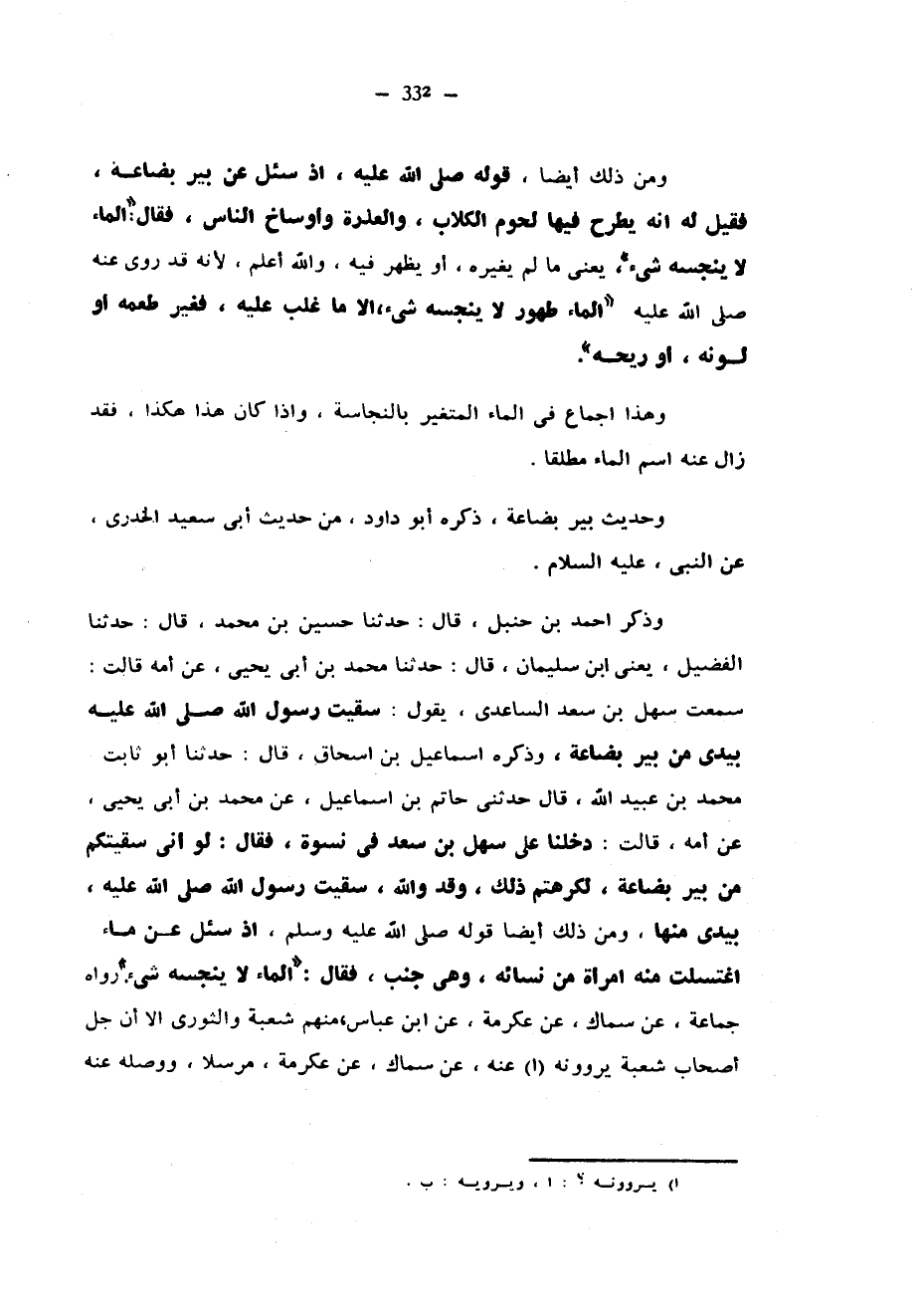 وَمِنْ ذَلِكَ أَيْضًا قَوْلُهُ صَلَّى اللَّهُ عَلَيْهِ وَسَلَّمَ إذ سئل عن بير بُضَاعَةَ فَقِيلَ لَهُ إِنَّهُ يُطْرَحُ فِيهَا لُحُومُ الْكِلَابِ وَالْعَذِرَةُ وَأَوْسَاخُ النَّاسِ فَقَالَ الْمَاءُ لَا يُنَجِّسُهُ شَيْءٌ يَعْنِي مَا لَمْ يُغَيِّرْهُ أَوْ يَظْهَرْ فِيهِ وَاللَّهُ أَعْلَمُ لِأَنَّهُ قَدْ رُوِيَ عنه صلى الله عليه وسلم الْمَاءُ طَهُورٌ لَا يُنَجِّسُهُ شَيْءٌ إِلَّا مَا غَلَبَ عَلَيْهِ فَغَيَّرَ طَعْمَهُ أَوْ لَوْنَهُ أَوْ رِيحَهُ وَهَذَا إِجْمَاعٌ فِي الْمَاءِ الْمُتَغَيِّرِ بِالنَّجَاسَةِ وَإِذَا كَانَ هَذَا هَكَذَا فَقَدْ زَالَ عَنْهُ اسم الماء مطلقا وحديث بير بُضَاعَةَ ذَكَرَهُ أَبُو دَاوُدَ مِنْ حَدِيثِ أَبِي سَعِيدٍ الْخُدْرِيِّ عَنِ النَّبِيِّ عَلَيْهِ السَّلَامُ وَذَكَرَ أَحْمَدُ بْنُ حَنْبَلٍ قَالَ حَدَّثَنَا حُسَيْنُ بْنُ مُحَمَّدٍ قَالَ حَدَّثَنَا الْفُضَيْلُ يَعْنِي ابْنَ سُلَيْمَانَ قَالَ حَدَّثَنَا مُحَمَّدُ بْنُ أَبِي يَحْيَى عَنْ أُمِّهِ قَالَتْ سَمِعْتُ سَهْلَ بْنَ سَعْدٍ السَّاعِدِيَّ يَقُولُ سَقَيْتُ رَسُولَ اللَّهِ صَلَّى اللَّهُ عَلَيْهِ وَسَلَّمَ بِيَدِي من بير بُضَاعَةَ وَذَكَرَهُ إِسْمَاعِيلُ بْنُ إِسْحَاقَ قَالَ حَدَّثَنَا أَبُو ثَابِتٍ مُحَمَّدُ بْنُ عُبَيْدِ اللَّهِ قَالَ حَدَّثَنِي حَاتِمُ بْنُ إِسْمَاعِيلَ عَنْ مُحَمَّدِ بْنِ أَبِي يَحْيَى عَنْ أُمِّهِ قَالَتْ دَخَلْنَا عَلَى سَهْلِ بْنِ سَعْدٍ فِي نِسْوَةٍ فَقَالَ لَوْ أني سقيتكم من بير بُضَاعَةَ لَكَرِهْتُمْ ذَلِكَ وَقَدْ وَاللَّهِ سَقَيْتُ رَسُولَ اللَّهِ صَلَّى اللَّهُ عَلَيْهِ وَسَلَّمَ بِيَدِي مِنْهَا وَمِنْ ذَلِكَ أَيْضًا قَوْلُهُ صَلَّى اللَّهُ عَلَيْهِ وَسَلَّمَ إِذْ سُئِلَ عَنْ مَاءٍ اغْتَسَلَتْ مِنْهُ امْرَأَةٌ مِنْ نِسَائِهِ وَهِيَ جُنُبٌ فَقَالَ الْمَاءُ لَا يُنَجِّسُهُ شَيْءٌ رَوَاهُ جَمَاعَةٌ عَنْ سِمَاكٍ عَنْ عِكْرِمَةَ عَنِ ابْنِ عَبَّاسٍ مِنْهُمْ شُعْبَةُ وَالثَّوْرِيُّ إِلَّا أَنَّ جُلَّ أَصْحَابِ شُعْبَةَ يَرْوُونَهُ عَنْهُ عَنْ سِمَاكٍ عَنْ عِكْرِمَةَ مُرْسَلًا وَوَصَلَهُ عنه