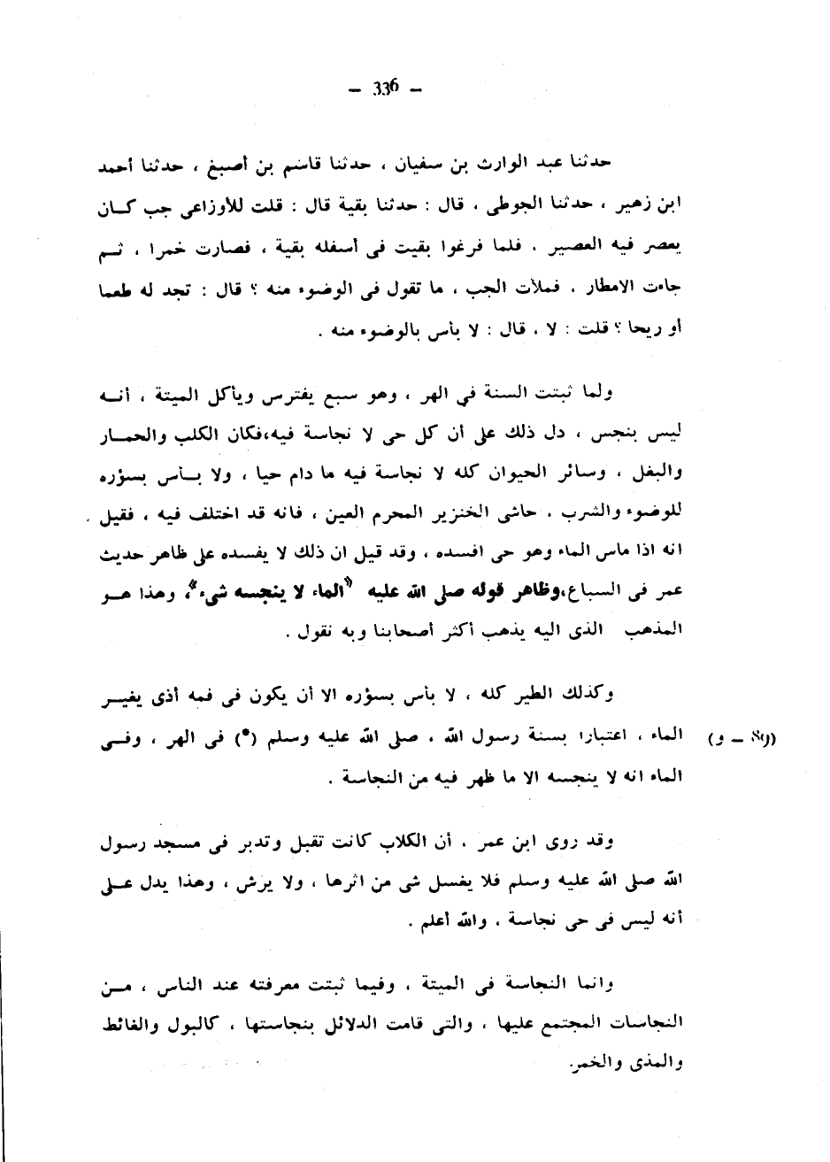 حَدَّثَنَا عَبْدُ الْوَارِثِ بْنُ سُفْيَانَ حَدَّثَنَا قَاسِمُ بن أصبغ حدثنا أحمد ابن زُهَيْرٍ حَدَّثَنَا الْجَوْطِيُّ قَالَ حَدَّثَنَا بَقِيَّةُ قَالَ قلت لأوزاعي جُبٌّ كَانَ يُعْصَرُ فِيهِ الْعَصِيرُ فَلَمَّا فَرَغُوا بَقِيَتْ فِي أَسْفَلِهِ بَقِيَّةٌ فَصَارَتْ خَمْرًا ثُمَّ جَاءَتِ الْأَمْطَارُ فَمَلَأَتِ الْجُبَّ مَا تَقُولُ فِي الْوُضُوءِ مِنْهُ قَالَ تَجِدُ لَهُ طَعْمًا أَوْ رِيحًا قُلْتُ لَا قَالَ لَا بَأْسَ بِالْوُضُوءِ مِنْهُ وَلَمَّا ثَبَتَتِ السُّنَّةُ فِي الْهِرِّ وَهُوَ سَبُعٌ يَفْتَرِسُ وَيَأْكُلُ الْمَيْتَةَ أَنَّهُ لَيْسَ بِنَجَسٍ دَلَّ ذَلِكَ عَلَى أَنَّ كُلَّ حَيٍّ لَا نَجَاسَةَ فِيهِ فَكَانَ الْكَلْبُ وَالْحِمَارُ وَالْبَغْلُ وَسَائِرُ الْحَيَوَانِ كُلِّهِ لَا نَجَاسَةَ فِيهِ مَا دَامَ حيا ولا بأس بسؤره للوضوء والشرب حاشى الْخِنْزِيرَ الْمُحَرَّمَ الْعَيْنَ فَإِنَّهُ قَدِ اخْتُلِفَ فِيهِ فَقِيلَ إِنَّهُ إِذَا مَاسَّ الْمَاءَ وَهُوَ حَيٌّ أَفْسَدَهُ وَقَدْ قِيلَ إِنَّ ذَلِكَ لَا يُفْسِدُهُ عَلَى ظَاهِرِ حَدِيثِ عُمَرَ فِي السِّبَاعِ وَظَاهِرِ قوله صَلَّى اللَّهُ عَلَيْهِ وَسَلَّمَ الْمَاءُ لَا يُنَجِّسُهُ شَيْءٌ وَهَذَا هُوَ الْمَذْهَبُ الَّذِي إِلَيْهِ يَذْهَبُ أَكْثَرُ أَصْحَابِنَا وَبِهِ نَقُولُ وَكَذَلِكَ الطَّيْرُ كُلُّهُ لَا بَأْسَ بِسُؤْرِهِ إِلَّا أَنْ يَكُونَ فِي فَمِهِ أَذًى يُغَيِّرُ الْمَاءَ اعْتِبَارًا بِسُنَّةِ رَسُولِ اللَّهِ صَلَّى اللَّهُ عَلَيْهِ وَسَلَّمَ (*) فِي الْهِرِّ وَفِي الْمَاءِ أَنَّهُ لَا يُنَجِّسُهُ إِلَّا مَا ظَهَرَ فِيهِ مِنَ النَّجَاسَةِ وَقَدْ رَوَى ابْنُ عُمَرَ أَنَّ الْكِلَابَ كَانَتْ تُقْبِلُ وَتُدْبِرُ فِي مَسْجِدِ رَسُولِ اللَّهِ صَلَّى اللَّهُ عَلَيْهِ وَسَلَّمَ فَلَا يُغْسَلُ شَيْءٌ مِنْ أَثَرِهَا وَلَا يُرَشُّ وَهَذَا يَدُلُّ عَلَى أَنَّهُ لَيْسَ فِي حَيٍّ نَجَاسَةٌ وَاللَّهُ أَعْلَمُ وَإِنَّمَا النَّجَاسَةُ فِي الْمَيْتَةِ وَفِيمَا ثَبَتَتْ مَعْرِفَتُهُ عِنْدَ النَّاسِ مِنَ النَّجَاسَاتِ الْمُجْتَمَعِ عَلَيْهَا وَالَّتِي قَامَتِ الدَّلَائِلُ بِنَجَاسَتِهَا كَالْبَوْلِ وَالْغَائِطِ وَالْمَذْيِ وَالْخَمْرِ