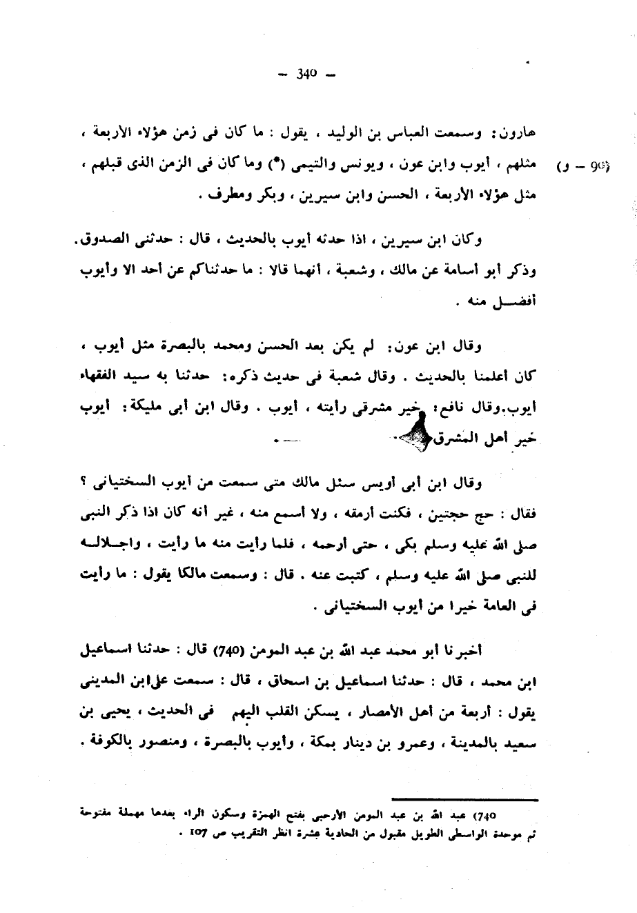 هَارُونَ وَسَمِعْتُ الْعَبَّاسَ بْنَ الْوَلِيدِ يَقُولُ مَا كَانَ فِي زَمَنِ هَؤُلَاءِ الْأَرْبَعَةِ مِثْلُهُمْ أَيُّوبُ وَابْنُ عَوْنٍ وَيُونُسُ وَالتَّيْمِيُّ (*) وَمَا كَانَ فِي الزَّمَنِ الْذِي قَبْلَهُمْ مِثْلُ هَؤُلَاءِ الْأَرْبَعَةِ الْحَسَنُ وَابْنُ سِيرِينَ وَبَكْرٌ وَمُطَرِّفٌ وَكَانَ ابْنُ سِيرِينَ إِذَا حَدَّثَهُ أَيُّوبُ بِالْحَدِيثِ قَالَ حَدَّثَنِي الصَّدُوقُ وَذَكَرَ أَبُو أُسَامَةَ عَنْ مَالِكٍ وَشُعْبَةَ أَنَّهُمَا قَالَا مَا حَدَّثْنَاكُمْ عَنْ أَحَدٍ إِلَّا وَأَيُّوبُ أَفْضَلُ مِنْهُ وَقَالَ ابْنُ عَوْنٍ لَمْ يَكُنْ بَعْدَ الْحَسَنِ وَمُحَمَّدٍ بِالْبَصْرَةِ مِثْلُ أَيُّوبَ كَانَ أَعْلَمَنَا بِالْحَدِيثِ وَقَالَ شُعْبَةُ فِي حَدِيثٍ ذَكَرَهُ حَدَّثَنَا بِهِ سَيِّدُ الْفُقَهَاءِ أَيُّوبُ وَقَالَ نَافِعٌ خَيْرُ مَشْرِقِيٍّ رَأَيْتُهُ أَيُّوبُ وَقَالَ ابْنُ أَبِي مُلَيْكَةَ أَيُّوبُ خَيْرُ أَهْلِ الْمَشْرِقِ وَقَالَ ابْنُ أَبِي أُوَيْسٍ سُئِلَ مَالِكٌ مَتَّى سَمِعْتَ مِنْ أَيُّوبَ السِّخْتِيَانِيِّ فَقَالَ حَجَّ حَجَّتَيْنِ فَكُنْتُ أَرْمُقُهُ وَلَا أَسْمَعُ مِنْهُ غَيْرَ أَنَّهُ كَانَ إِذَا ذكر النبي صلى الله عليه وسلم بَكَى حَتَّى أَرْحَمَهُ فَلَمَّا رَأَيْتُ مِنْهُ مَا رَأَيْتُ وَإِجْلَالَهُ لِلنَّبِيِّ صَلَّى اللَّهُ عَلَيْهِ وَسَلَّمَ كَتَبْتُ عَنْهُ قَالَ وَسَمِعْتُ مَالِكًا يَقُولُ مَا رَأَيْتُ فِي الْعَامَّةِ خَيْرًا مِنْ أَيُّوبَ السِّخْتِيَانِيِّ أَخْبَرَنَا أَبُو مُحَمَّدٍ عَبْدُ اللَّهِ بْنُ عَبْدِ الْمُؤْمِنِ قَالَ حَدَّثَنَا إسماعيل ابن مُحَمَّدٍ قَالَ حَدَّثَنَا إِسْمَاعِيلُ بْنُ إِسْحَاقَ قَالَ سمعت علي ابن الْمَدِينِيِّ يَقُولُ أَرْبَعَةٌ مِنْ أَهْلِ الْأَمْصَارِ يَسْكُنُ الْقَلْبُ إِلَيْهِمْ فِي الْحَدِيثِ يَحْيَى بْنُ سَعِيدٍ بِالْمَدِينَةِ وَعَمْرُو بْنُ دِينَارٍ بِمَكَّةَ وَأَيُّوبُ بِالْبَصْرَةِ ومنصور بالكوفة