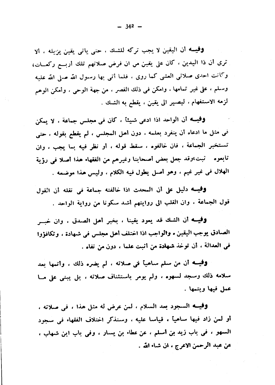 وَفِيهِ أَنَّ الْيَقِينَ لَا يَجِبُ تَرْكُهُ لِلشَّكِّ حَتَّى يَأْتِيَ يَقِينٌ يُزِيلُهُ أَلَا تَرَى أَنَّ ذَا الْيَدَيْنِ كَانَ عَلَى يَقِينٍ مِنْ أَنَّ فَرْضَ صَلَاتِهِمْ تِلْكَ أَرْبَعُ رَكَعَاتٍ وَكَانَتْ إِحْدَى صَلَاتَيِ الْعَشِيِّ كَمَا رُوِيَ فَلَمَّا أَتَى بِهَا رَسُولُ اللَّهِ صَلَّى اللَّهُ عَلَيْهِ وَسَلَّمَ على غَيْرِ تَمَامِهَا وَأَمْكَنَ فِي ذَلِكَ الْقَصْرُ مِنْ جِهَةِ الْوَحْيِ وَأَمْكَنَ الْوَهْمُ لَزِمَهُ الِاسْتِفْهَامُ لِيَصِيرَ إِلَى يَقِينٍ يَقْطَعُ بِهِ الشَّكَّ وَفِيهِ أَنَّ الْوَاحِدَ إِذَا ادَّعَى شَيْئًا كَانَ فِي مَجْلِسِ جَمَاعَةٍ لَا يُمْكِنُ فِي مِثْلِ مَا ادَّعَاهُ أَنْ يَنْفَرِدَ بِعِلْمِهِ دُونَ أَهْلِ الْمَجْلِسِ لَمْ يُقْطَعْ بِقَوْلِهِ حَتَّى تُسْتَخْبَرَ الْجَمَاعَةُ فَإِنْ خَالَفُوهُ سَقَطَ قَوْلُهُ أَوْ نُظِرَ فِيهِ بِمَا يَجِبُ وَإِنْ تَابَعُوهُ ثَبَتَ وَقَدْ جَعَلَ بَعْضُ أَصْحَابِنَا وَغَيْرُهُمْ مِنَ الْفُقَهَاءِ هَذَا أَصْلًا فِي رُؤْيَةِ الْهِلَالِ فِي غَيْرِ غَيْمٍ وَهُوَ أَصْلٌ يَطُولُ فِيهِ الْكَلَامُ وَلَيْسَ هَذَا مَوْضِعَهُ وَفِيهِ دَلِيلٌ عَلَى أَنَّ الْمُحَدِّثَ إِذَا خَالَفَتْهُ جَمَاعَةٌ فِي نَقْلِهِ أَنَّ الْقَوْلَ قَوْلُ الْجَمَاعَةِ وَأَنَّ الْقَلْبَ إِلَى رِوَايَتِهِمْ أَشَدُّ سُكُونًا مِنْ رِوَايَةِ الْوَاحِدِ وَفِيهِ أَنَّ الشَّكَّ قَدْ يَعُودُ يَقِينًا بِخَبَرِ أَهْلِ الصِّدْقِ وَأَنَّ خَبَرَ الصَّادِقِ يُوجِبُ الْيَقِينَ وَالْوَاجِبُ إِذَا اخْتَلَفَ أَهْلُ مَجْلِسٍ فِي شَهَادَةٍ وتكافؤوا فِي الْعَدَالَةِ أَنْ تُؤْخَذَ شَهَادَةُ مَنْ أَثْبَتَ عِلْمًا دُونَ مَنْ نَفَاهُ وَفِيهِ أَنَّ مَنْ سَلَّمَ سَاهِيًا فِي صَلَاتِهِ لَمْ يَضُرُّهُ ذَلِكَ وَأَتَمَّهَا بَعْدَ سَلَامِهِ ذَلِكَ وَسَجَدَ لِسَهْوِهِ وَلَمْ يُؤْمَرْ بِاسْتِئْنَافِ صَلَاتِهِ بَلْ يَبْنِي عَلَى مَا عَمِلَ فِيهَا وَيُتِمُّهَا وَفِيهِ السُّجُودُ بَعْدَ السَّلَامِ لِمَنْ عَرَضَ لَهُ مِثْلُ هَذَا فِي صَلَاتِهِ أَوْ لِمَنْ زَادَ فِيهَا سَاهِيًا قِيَاسًا عَلَيْهِ وَسَنَذْكُرُ اخْتِلَافَ الْفُقَهَاءِ فِي سُجُودِ السَّهْوِ فِي بَابِ زَيْدِ بْنِ أَسْلَمَ عَنْ عَطَاءِ بْنِ يَسَارٍ وَفِي بَابِ ابْنِ شِهَابٍ عَنْ عَبْدِ الرَّحْمِنِ الْأَعْرَجِ إِنْ شَاءَ اللَّهُ