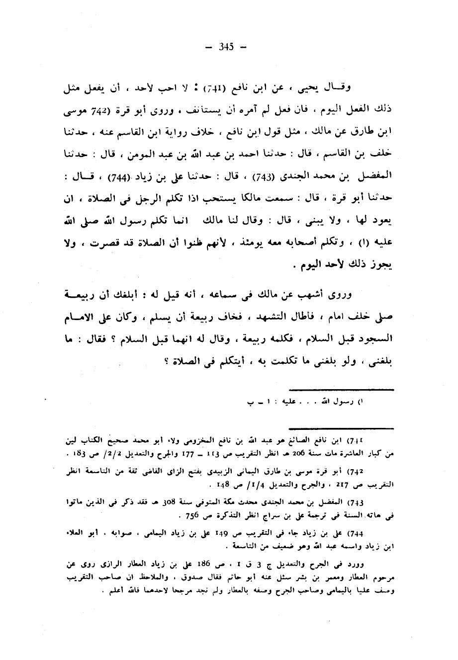 وَقَالَ يَحْيَى عَنِ ابْنِ نَافِعٍ لَا أُحِبُّ لِأَحَدٍ أَنْ يَفْعَلَ مِثْلَ ذَلِكَ الْفِعْلِ الْيَوْمَ فَإِنْ فَعَلَ لَمْ آمُرْهُ أَنْ يَسْتَأْنِفَ وَرَوَى أبو قرة موسى ابن طَارِقٍ عَنْ مَالِكٍ مِثْلَ قَوْلِ ابْنِ نَافِعٍ خِلَافَ رِوَايَةِ ابْنِ الْقَاسِمِ عَنْهُ حَدَّثَنَا خَلَفُ بْنُ الْقَاسِمِ قَالَ حَدَّثَنَا أَحْمَدُ بْنُ عَبْدِ اللَّهِ بْنِ عَبْدِ الْمُؤْمِنِ قَالَ حَدَّثَنَا الْمُفَضَّلُ بْنُ مُحَمَّدٍ الْجُنْدِيُّ قَالَ حَدَّثَنَا عَلِيُّ بْنُ زِيَادٍ قَالَ حَدَّثَنَا أَبُو قُرَّةَ قَالَ سَمِعْتُ مَالِكًا يَسْتَحِبُّ إِذَا تَكَلَّمَ الرَّجُلُ فِي الصَّلَاةِ أَنْ يَعُودَ لَهَا وَلَا يَبْنِيَ قَالَ وَقَالَ لَنَا مَالِكٌ إِنَّمَا تَكَلَّمَ رسول الله صلى الله عليه وسلم وَتَكَلَّمَ أَصْحَابُهُ مَعَهُ يَوْمَئِذٍ لِأَنَّهُمْ ظَنُّوا أَنَّ الصَّلَاةَ قَدْ قَصُرَتْ وَلَا يَجُوزُ ذَلِكَ لِأَحَدٍ الْيَوْمَ وَرَوَى أَشْهَبُ عَنْ مَالِكٍ فِي سَمَاعِهِ أَنَّهُ قِيلَ لَهُ أَبَلَغَكَ أَنَّ رَبِيعَةَ صَلَّى خَلْفَ إِمَامٍ فَأَطَالَ التَّشَهُّدَ فَخَافَ رَبِيعَةُ أَنْ يُسَلِّمَ وَكَانَ عَلَى الْإِمَامِ السُّجُودُ قَبْلَ السَّلَامِ فَكَلَّمَهُ رَبِيعَةُ وَقَالَ لَهُ إِنَّهُمَا قَبْلَ السَّلَامِ فَقَالَ مَا بَلَغَنِي وَلَوْ بَلَغَنِي مَا تَكَلَّمْتُ بِهِ أَيُتَكَلَّمُ فِي الصَّلَاةِ